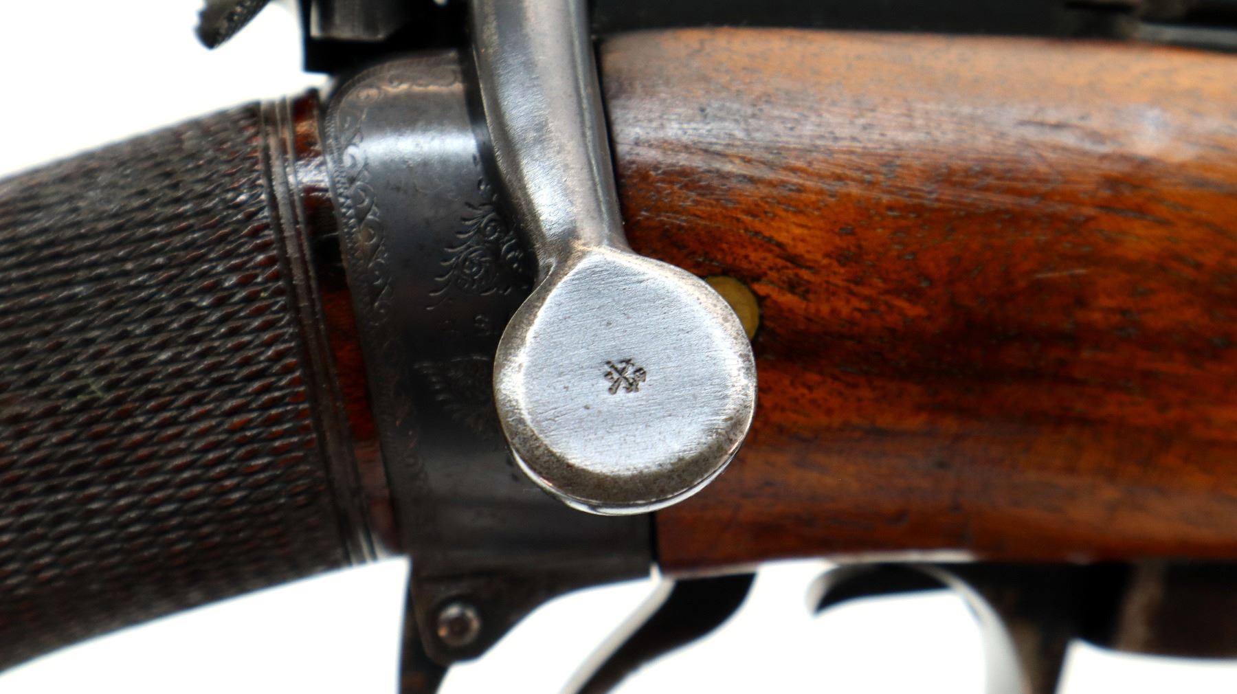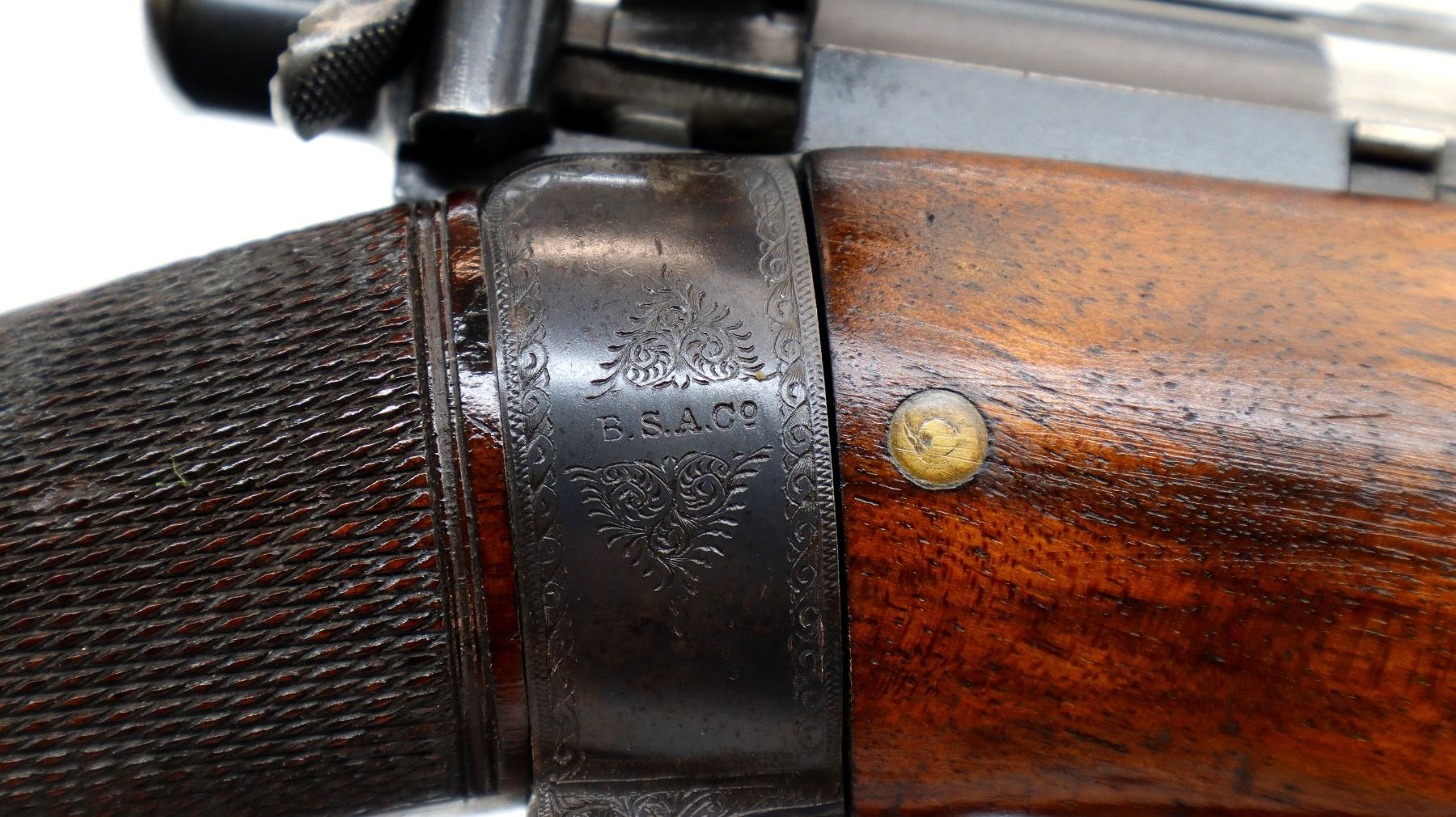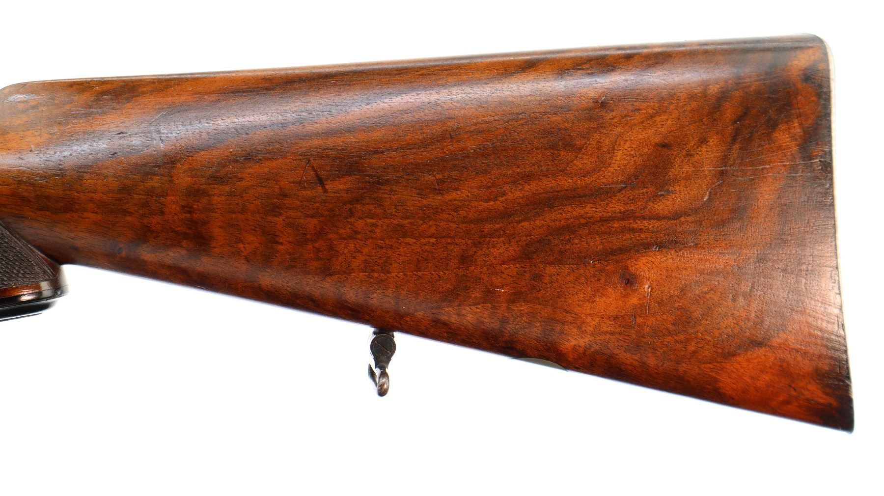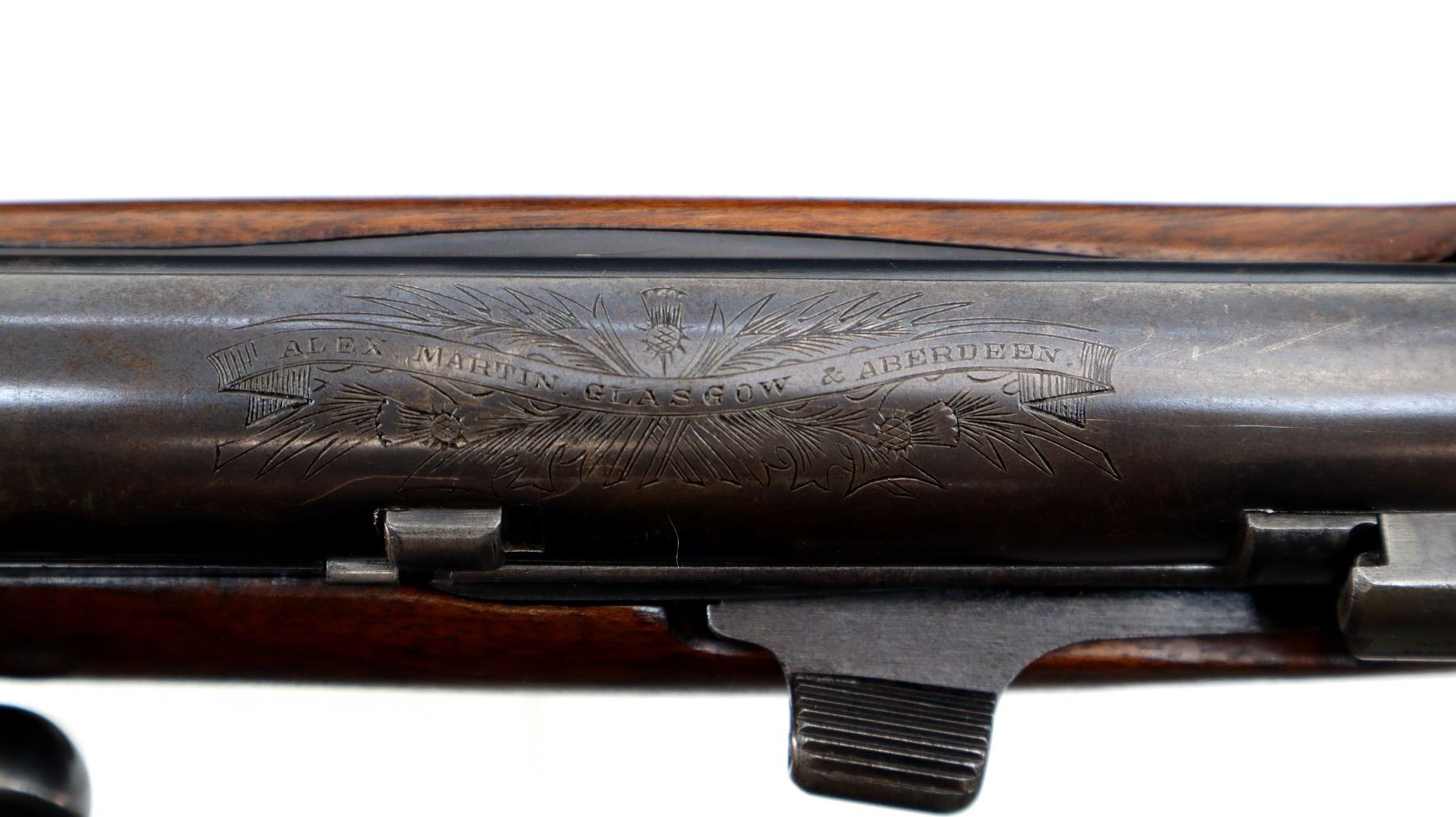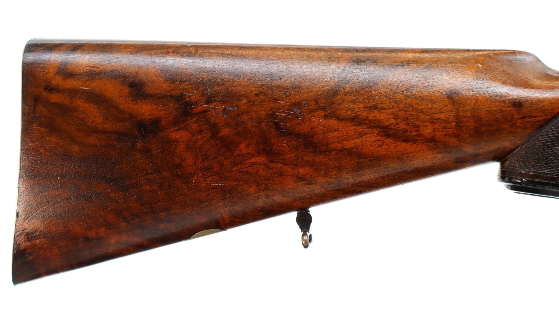 Main Description: Blade front sight with hood and ramp, adjustable express rear sight, with one fixed and two folding leafs with windage and elevation adjustable ladder sight, blued finish, barrel marked Westly Richards and Co London, dust cover engraved with Alex Martin Glasgow & Aberdeen, has a mag cut off, carbine bolt handle with flat knob, safety on the cocking piece, butt socket marked BSA. Two piece wood stocks, horn forearm and pistol grip caps, checkered forearm and pistol grip, engraved steel butt plate with trap, vanity plate, sling swivels.