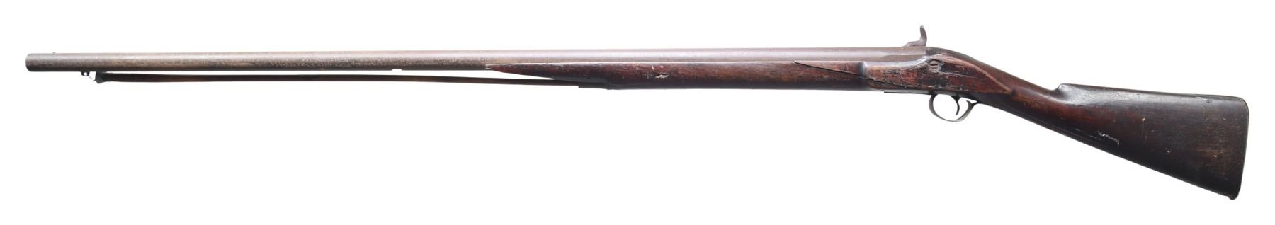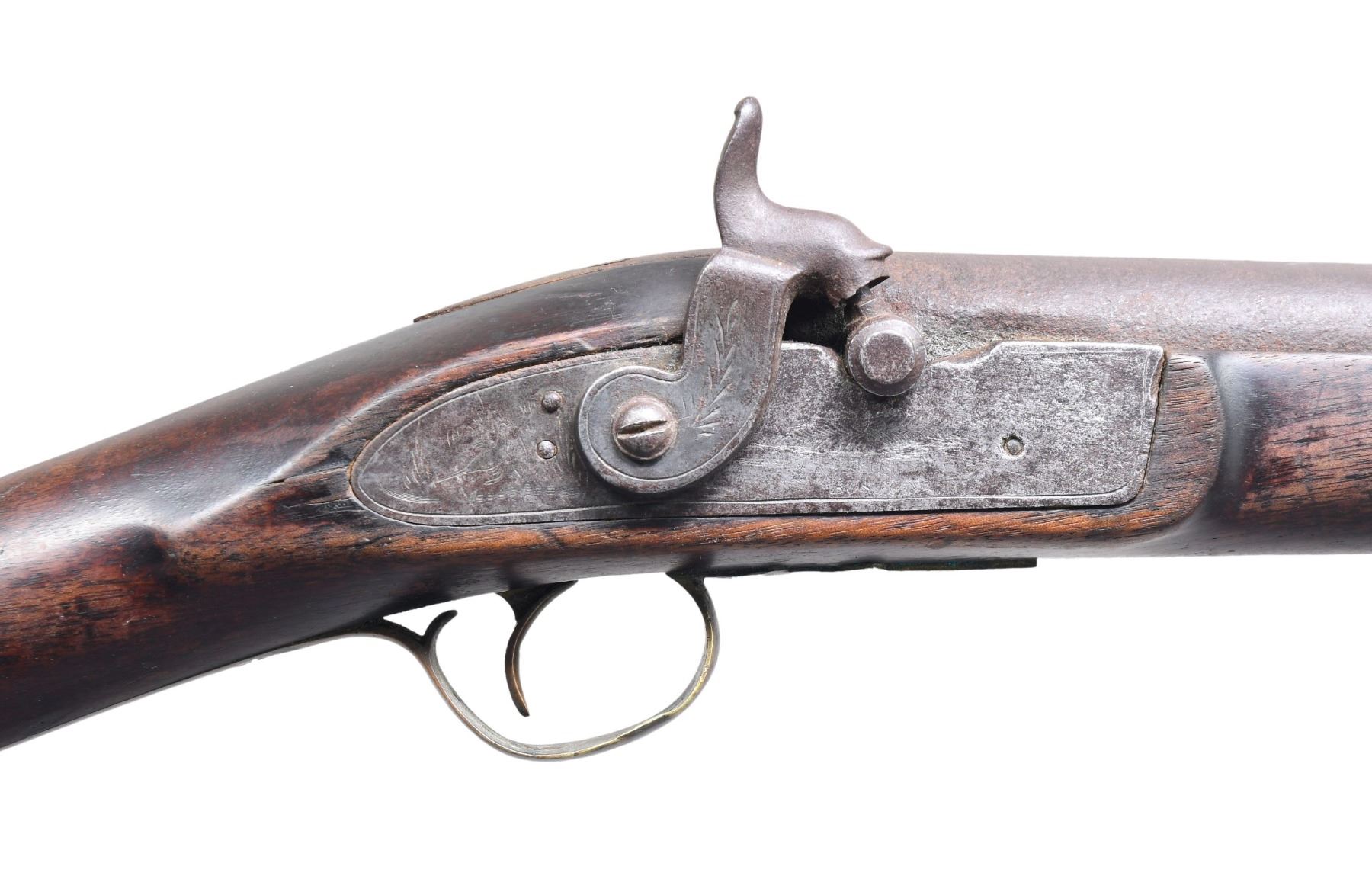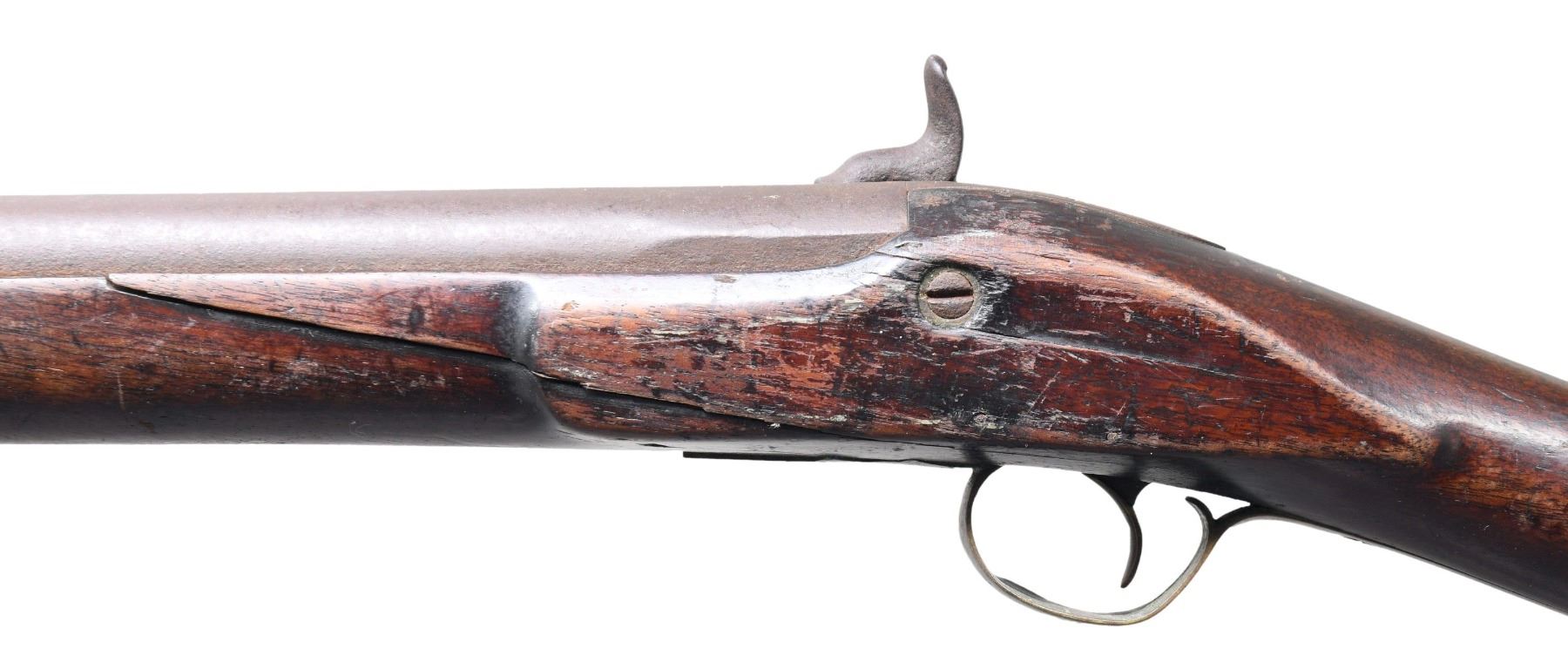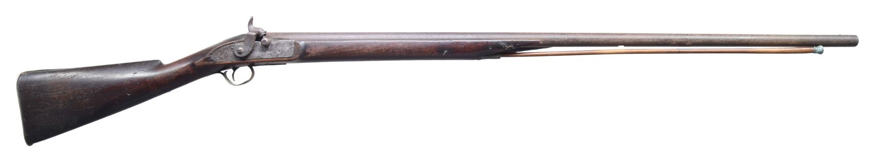 Cal. about 12 Ga. NSN. Bbl. 39". Lock has faint "WH BARNES BOSTON" marking. Gun otherwise has no visible markings. Hammer appears to be an old replacement with floral engraving. Hardwood half-length stock. Brass tipped hardwood ramrod present secured by a brass thimble. Two pipes are to be missing & ramrod secured at front by wire. CONDITION: forend missing a large chunk at front, stock otherwise shows a large crack to left side of stock near upper tang, a few other cracks, scattered flaking, dings & handling marks. Metal is mostly a dark gray patina with scattered oxidation & pitting. Action is sluggish but functional when hand cycled. Pitted dark bore. (01-26867/MJC). ANTIQUE. $100-150.