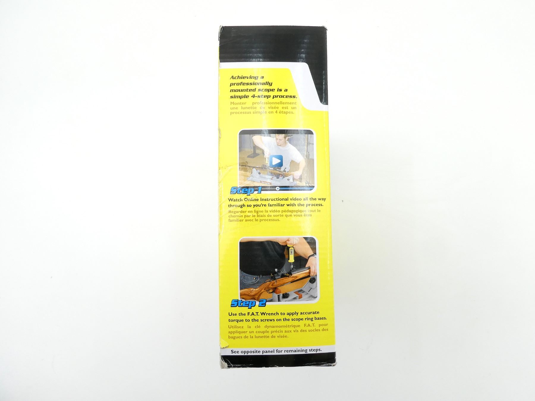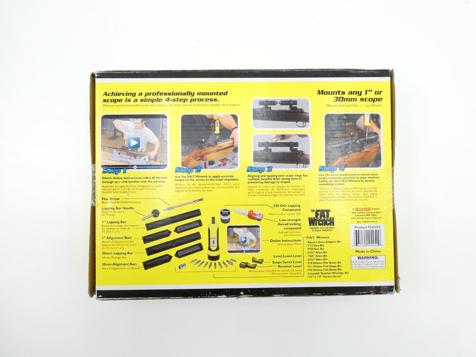 (1) SCOPE MOUNTING KIT, INCLUDES; FIREARM ACCURIZING TORQUE WRENCH, 1" & 30MM SCOPE LAPPING BARS, 1" & 30MM RING ALIGNMENT BARS, LAPPING BAR HANDLE, LEVEL, GUNSMITHING SCREWDRIVER BITS, ETC., APPEARS NEW OLD STOCK, SEALED IN ORIGINAL PACKAGING. MAY REQUIRE FITTING. SEE PHOTOS.