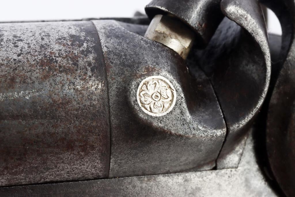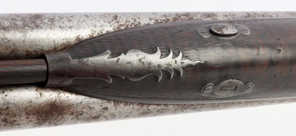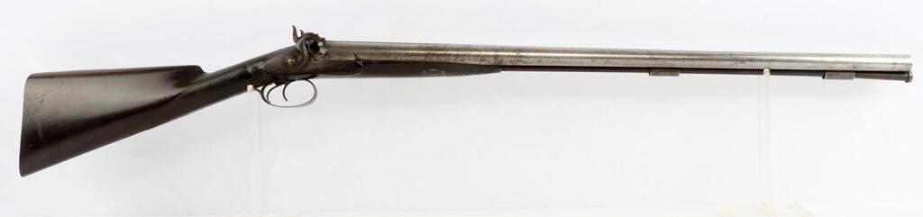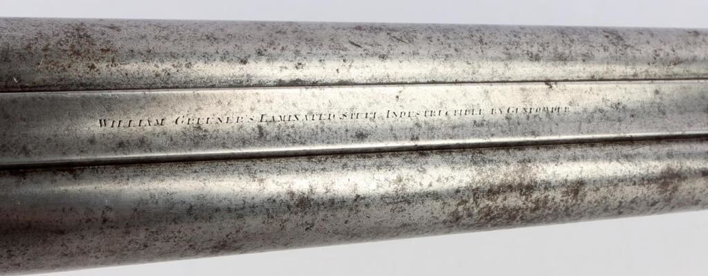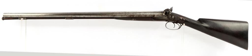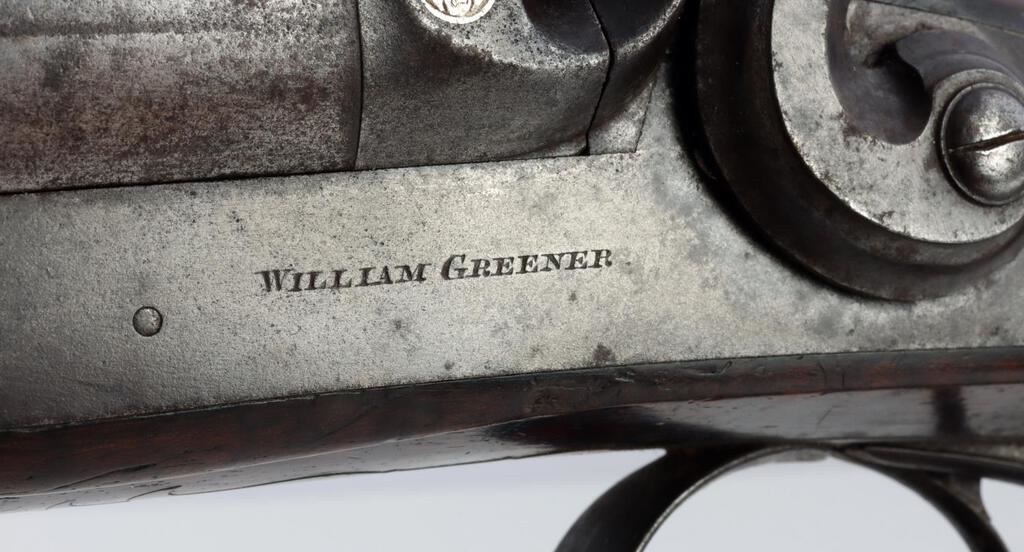 An English William Greener side by side, Double Barrel 10 Gauge, Percussion Shotgun. Top middle between the barrels is inscribed, "William Greener's Laminated Steel Indestructible by Gunpowder." Both sides of receiver are marked "William Greener." Wooden checkered handle. Two triggers. Original ramrod. Barrel has finish loss and pitting. Shotgun is in good condition. NON-FFL. Caliber: 10 Gauge Serial #: NSN