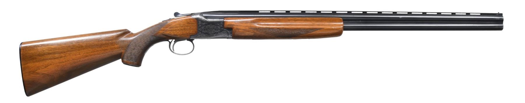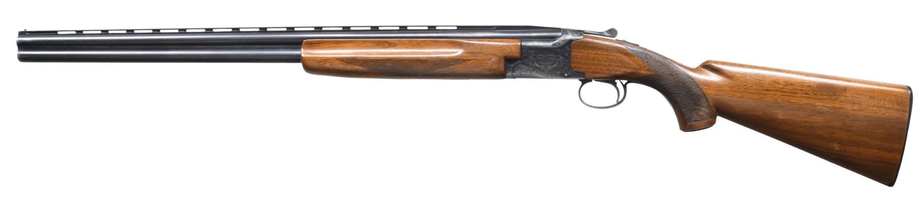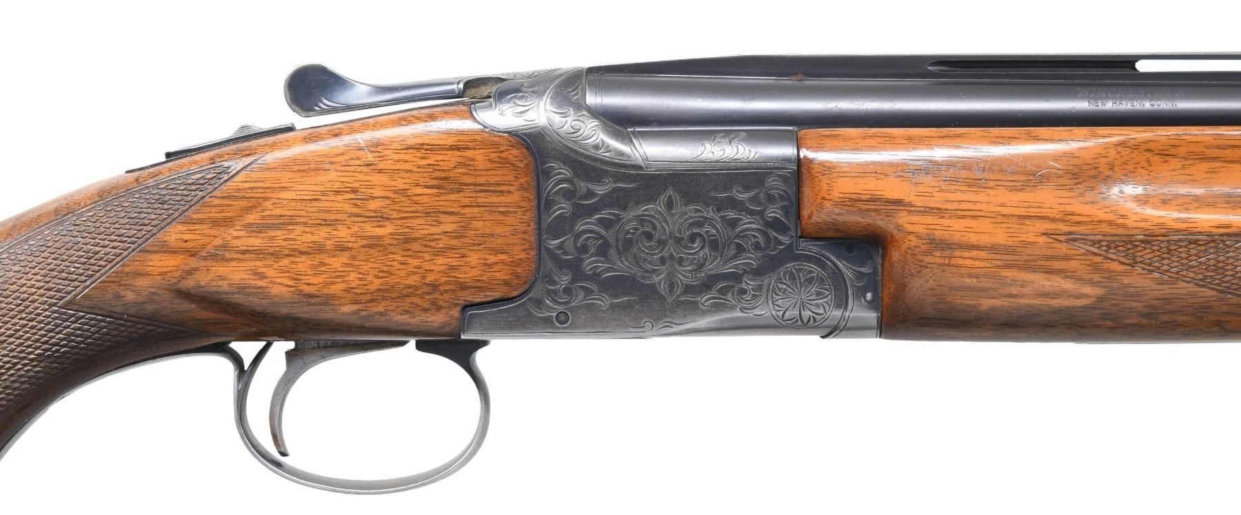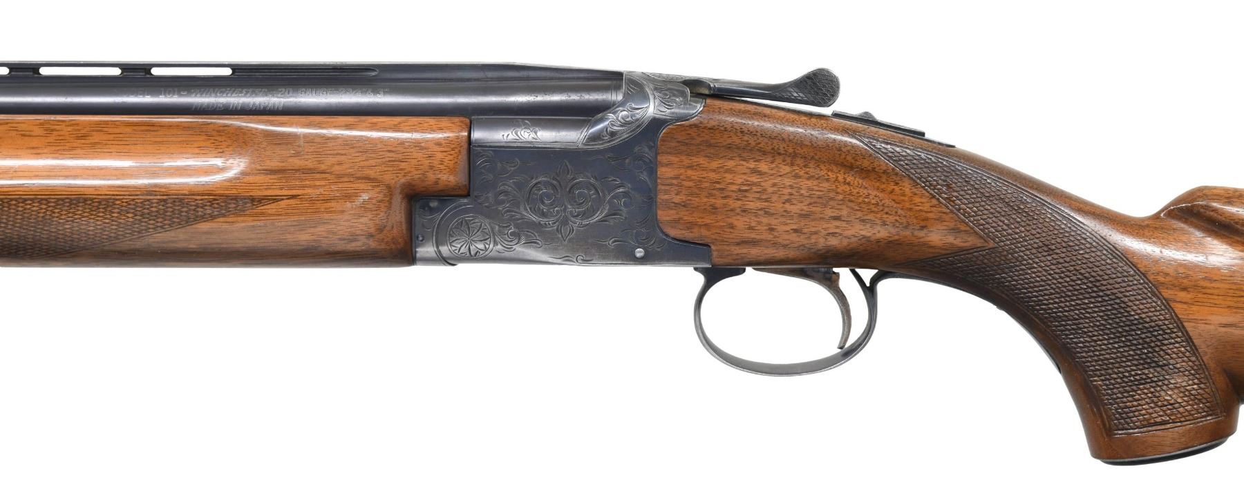 SHOTGUN. Cal. 20 Ga., 2 3/4" & 3". S# K217877. Mfg. 1969 in Japan by Olin Kodensha. Matching numbered 26.5" bbls. Fixed Mod. over Imp. Cyl. chokes. Blued finish. Engraved action w/ SST & ejectors. Checkered walnut stock set w/ steel grip cap & Win. buttplate. CONDITION: Good fading barrel blue with muzzle wear, wear from forearm, carry wear & peppery patina throughout. Fair receiver blue silvering on edges & pinprick patina throughout. Fair wood finish with considerable carry wear, handling marks & numerous handling marks. Toeline of stock has large chip. Shiny bores show light fouling. (25-2524/MD). CURIO. $500-800.