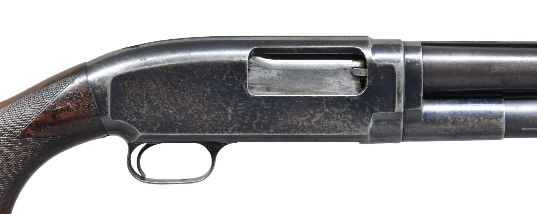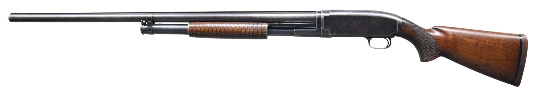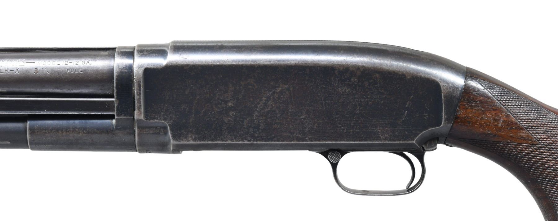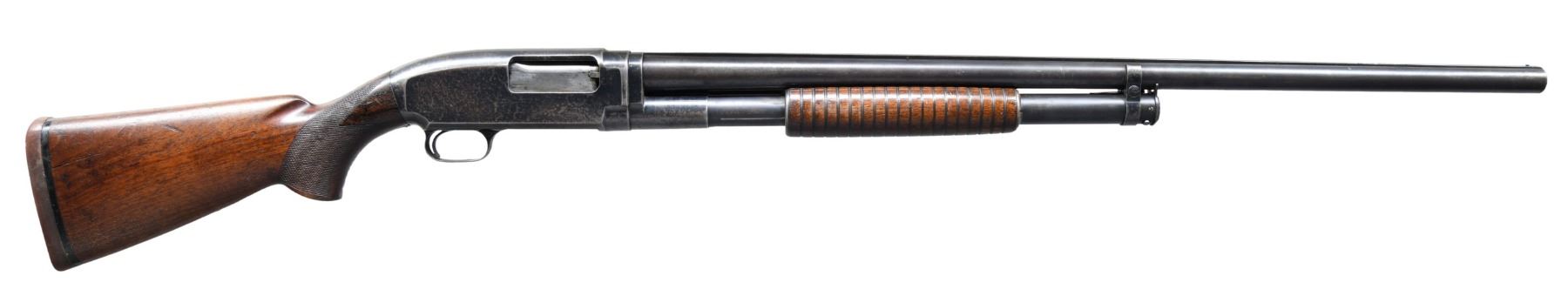 12 GA, 3". S# 1070227. Bbl. 30", with solid rib and steel bead front sight. Fixed Full choke. Blue finish. Corrugated walnut slide handle. Pistol grip leaded walnut stock has added hand checkering at wrist. LOP: is shortened to 12 3/4" over a reinstalled Winchester solid red pad. Mfg. in 1947. CONDITION: over 60% dull fading blue, showing scattered light pitting and handling marks. Wood has worn finish, with scratches and marks. Right side of stock has a crack extending from the buttplate. Sound mechanics. Good bore. (25-2483/DS). CURIO. $400-600.