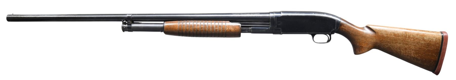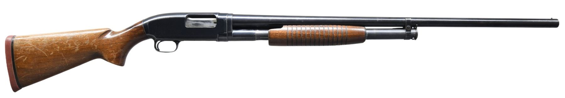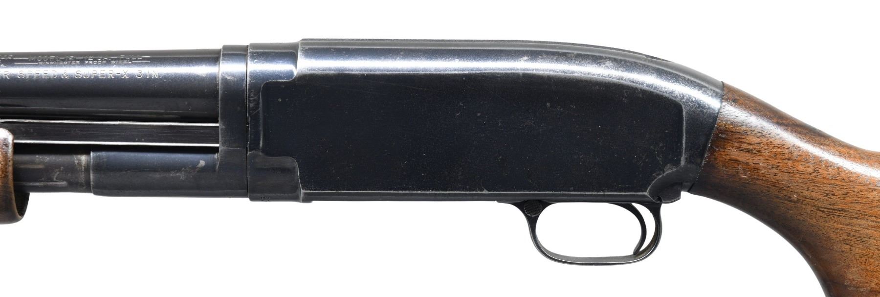 Cal. 12 GA, for Super-X and Super Speed 3". S# 1589343. Bbl. 30" plain, with fixed Full choke. Steel front bead. Large rnd. grooved forend and pistol grip walnut stock with lead weight. LOP: 13 5/8" over original solid red Winchester pad. Mfg. in 1956. CONDITION: 70% blue, showing slide and carry wear, with scattered spots of light pitting. Wood shows small dents and marks, with areas of finish loss. Sound mechanics. Very good bore. (25-3194/DS). CURIO. $350-500.