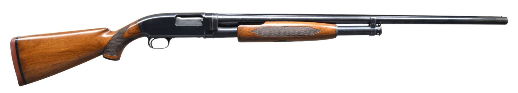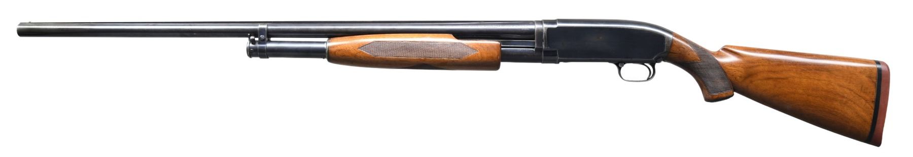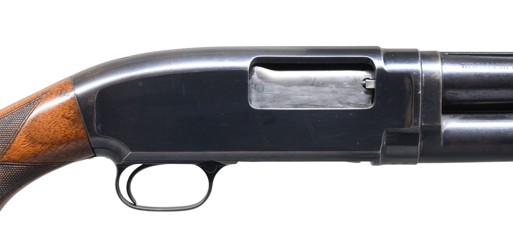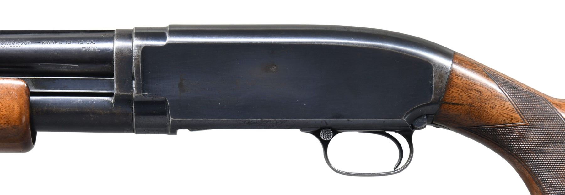 Cal. 12 GA, 2 3/4". S# 764360. Receiver is marked "SKEET" below the S#. Bbl. 30" solid rib replacement, with mismatched S# "689158". Fixed full choke, with steel bead. Blue finish. Beavertail forearm and hard rubber capped pistol grip stock, with skeet pattern hand checkering. LOP: shortened to 13 3/4" over an added Winchester solid red pad. Receiver mfg. in 1938. CONDITION: 80% lightly faded blue, showing scattered surface corrosion and spots of very light pitting. Forearm has added finish over freshened checkering wear, showing scratches and marks. Refinished stock has freshened checkering, with an area of epoxy repair along left side of trigger guard tang and a small crack extending from the left side of the receiver. Sound mechanics. Very good bore. (25-2440/DS). CURIO. $500-800.