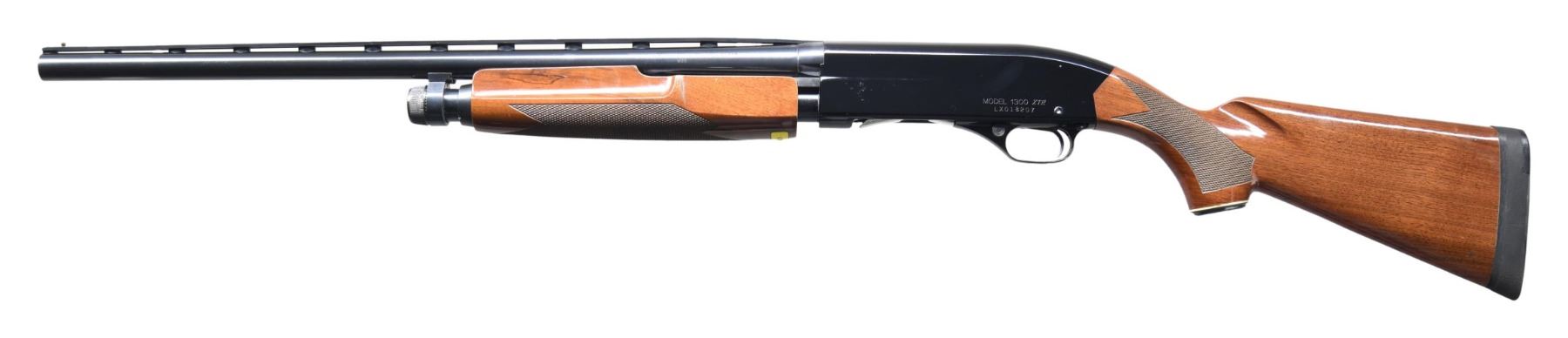 Cal. 12 Ga., 3". S# LX018207. Winchester Model 1200 VR 24" barrel w/ brass bead. Fitted for aftermarket choke tubes; IC tube included. Black anodized alloy frame. Checkered walnut stock set w/ added Owner decal on bottom of forearm & added Decelerator pad. CONDITION: all aspects very good to near excellent showing light handling marks & wear. Shiny bore. (25-2520/MD). MODERN. $300-400.