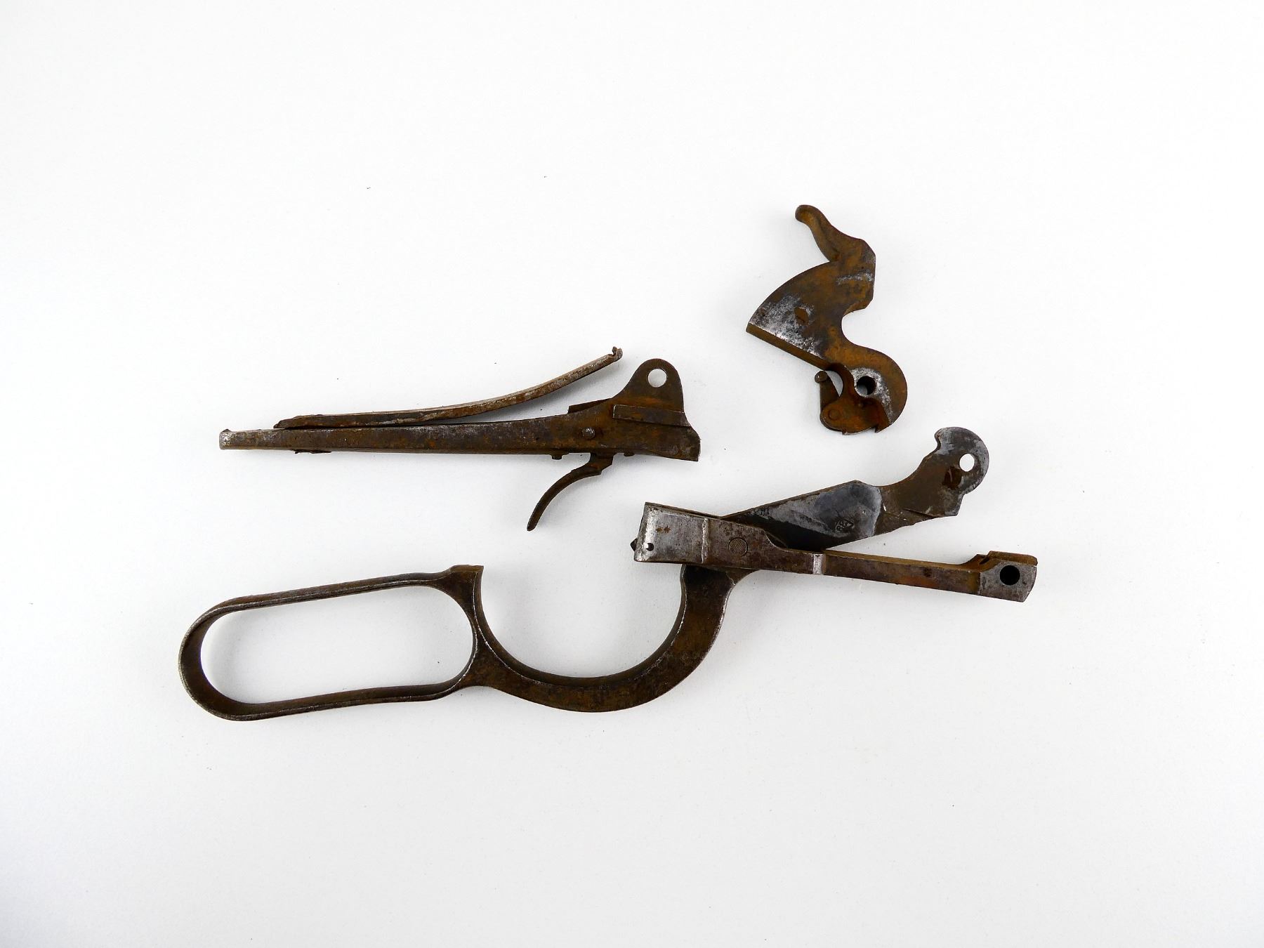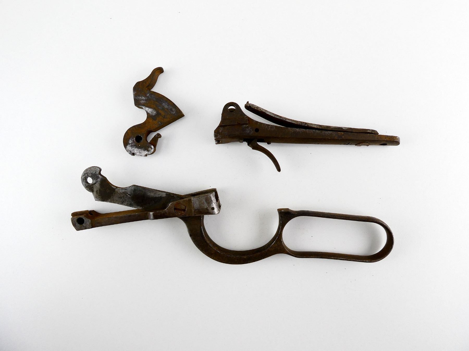 LOT INCLUDES; (1) LEVER WITH LINK, (1) LOWER TANG WITH HAMMER & SINGLE SET TRIGGER PARTS, ETC. MAY REQUIRE FITTING. SEE PHOTOS.
