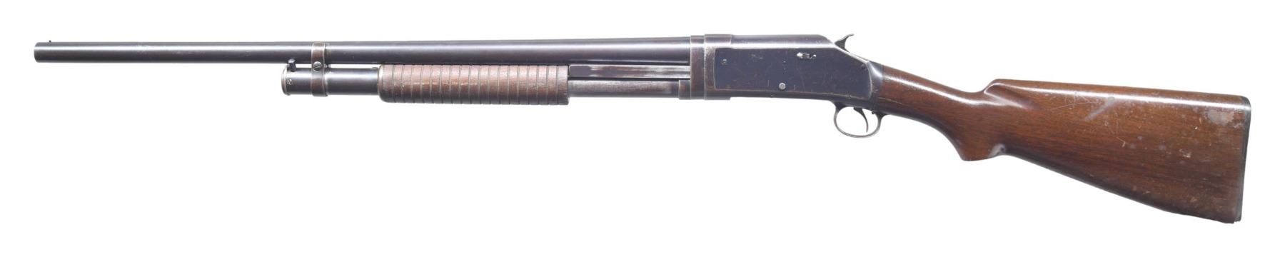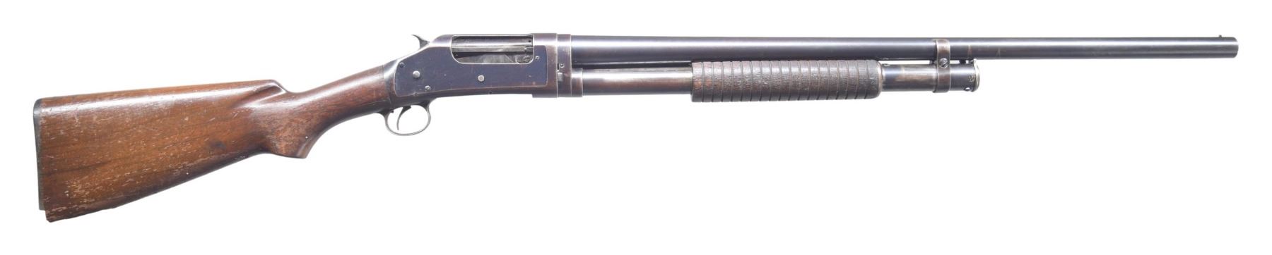 Cal. 12 GA. S# 616517. Bbl. shortened to 26", with brass bead. Original choke marking was "FULL". Takedown action. Blue finish. Small rnd. grooved walnut forearm and pistol grip stock, with original buttplate. Mfg. in 1917. CONDITION: 60% dull worn blue, showing scattered scratches and marks, with spotted surface corrosion. Forearm has age darkened appearance, showing scratches and marks, with small chips around rear edge. Stock has peeling finish, showing scratches and marks. Stock is missing a 2 3/4" piece from the toe. Bottom portion of buttplate broken off and missing. Sound action. Good bright bore. (25-2682/DS). CURIO. $200-400.