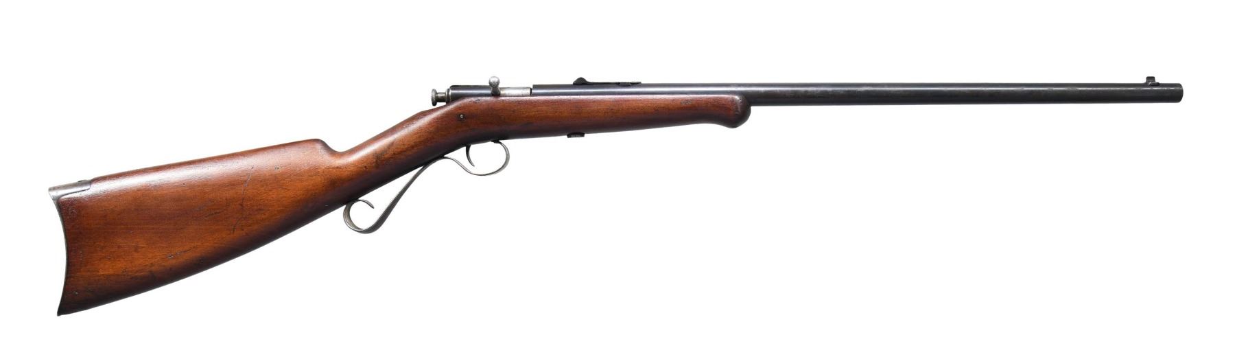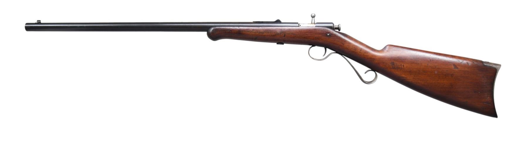 RIFLE. Cal. 22 S, L, EL. NSN. Bbl. 21". Model 1904 single shot bolt action rifle mfg. by Winchester between 1904-1931. Left side of the bbl. is marked with Winchester's mfg. and patent information, followed by the model and cal. designations. Metal components exhibit a blue finish overall, save for on the bolt assembly, which is polished in-the-white. 1-piece straight grip schnabel tip buttstock appears to have been sanded and revarnished at one time. Dovetailed blade front sight, with dovetailed U-notch rear sight. CONDITION: metal components retain large amounts of their original factory blue finish, exhibiting some areas of wear and thinning that show through to gray and brown patinas, with areas of mild to moderate pitting present on the right side of the bbl. Bolt assembly exhibits some spots of age related discoloration. Bright bore, exhibiting scattered spots of light to mild pitting, while retaining strong rifling throughout. Stock shows scattered marks and impressions from handling and storage, with a small chip present at the toe. (25-1802/MLW). CURIO. $300-400.