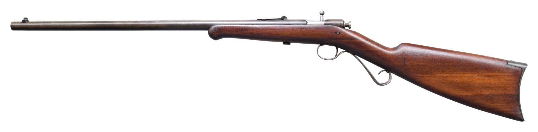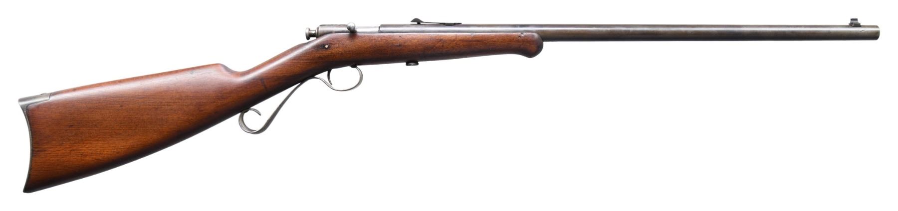 RIFLE. Cal. 22 S, L, EL. NSN. Bbl. 21". Model 1904 single shot bolt action rifle mfg. by Winchester between 1904-1931. The left side of the bbl. is marked with Winchester's mfg. and patent information, followed by the model and cal. designations. Metal components exhibit a blue finish overall, save for on the bolt assembly, which is polished in-the-white. 1-piece plain wood straight grip schnabel tip buttstock has been sanded and revarnished at one time. Aftermarket dovetailed aluminum beaded blade front sight, with dovetailed U-notch rear sight. CONDITION: metal components retain trace to fair amounts of their original factory blue finish, exhibiting wear and thinning that shows through to gray and brown patinas, with light to mild surface oxidation present overall. Bolt shows scattered spots of age related discoloration, as well as some spots of light pitting. Dark bore, exhibiting scattered spots of deep and dark pitting, while retaining good rifling throughout. Stock shows some scattered marks and minor impressions from handling and storage, but otherwise remains sturdy and serviceable. (25-1804/MLW). CURIO. $200-350.