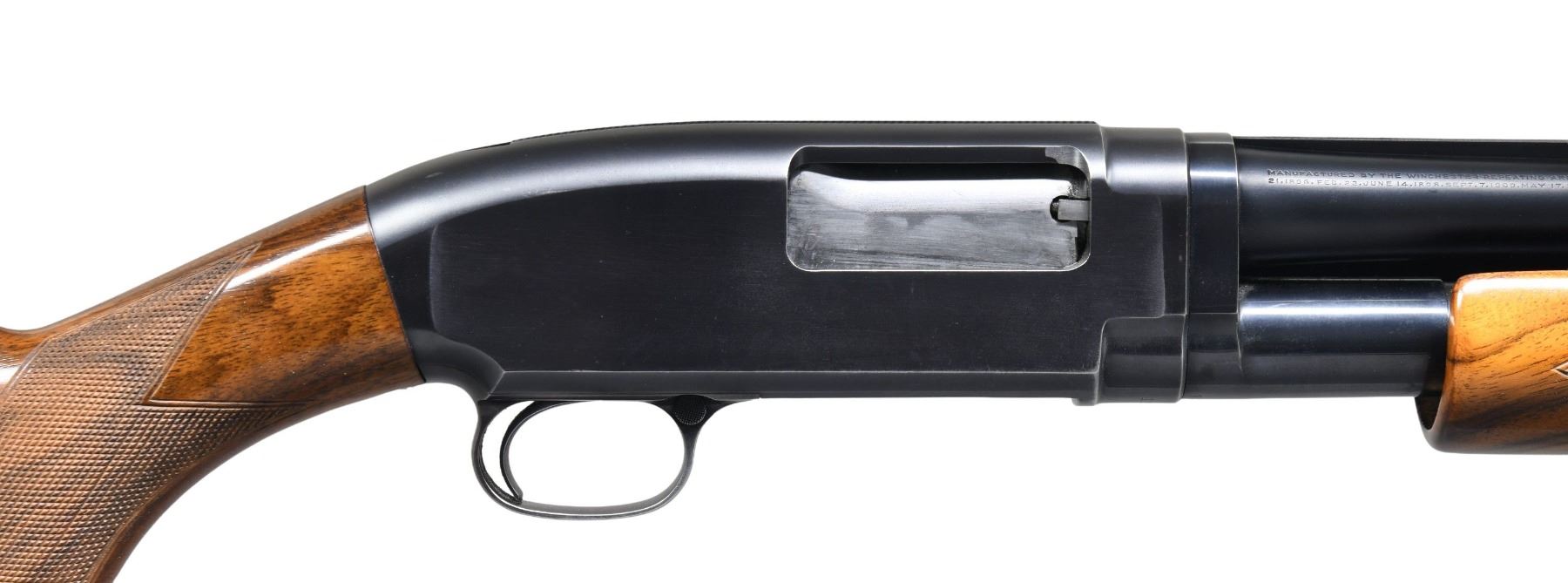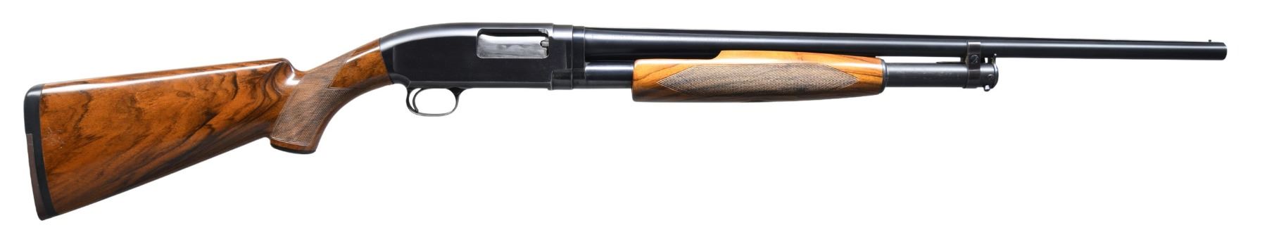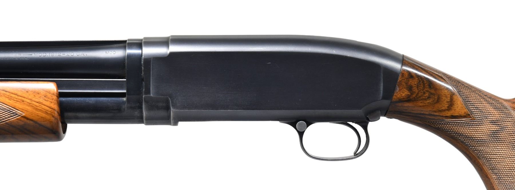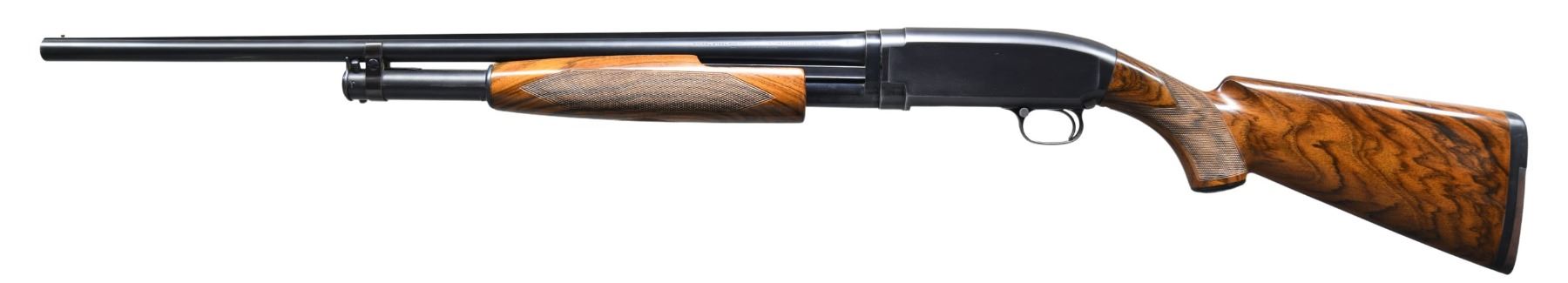 Cal. 20 GA, 2 5/8" original chamber length. S# 129365. Bbl. 25" of nickel steel, with a solid rib and brass front bead. Original choke marking was "FULL", choke is opened to IC, choke constriction is .009. Custom beavertail forearm and pistol grip stock, with reproduction Winchester grip cap of what appears to be gloss finished mesquite, with standard Winchester target pattern hand checkering. LOP: 14" over a Universal sporting clays style pad. Mfg. in 1916. CONDITION: good reblued finish, with bead blasted receiver top, shows slide and carry wear. Stocks have good custom finish. Chamber is lengthened to 2 3/4", with lengthened forcing cone. Headspace ring is 3-notches taken up. Good bore. (25-2438/DS). CURIO. $700-1,000.