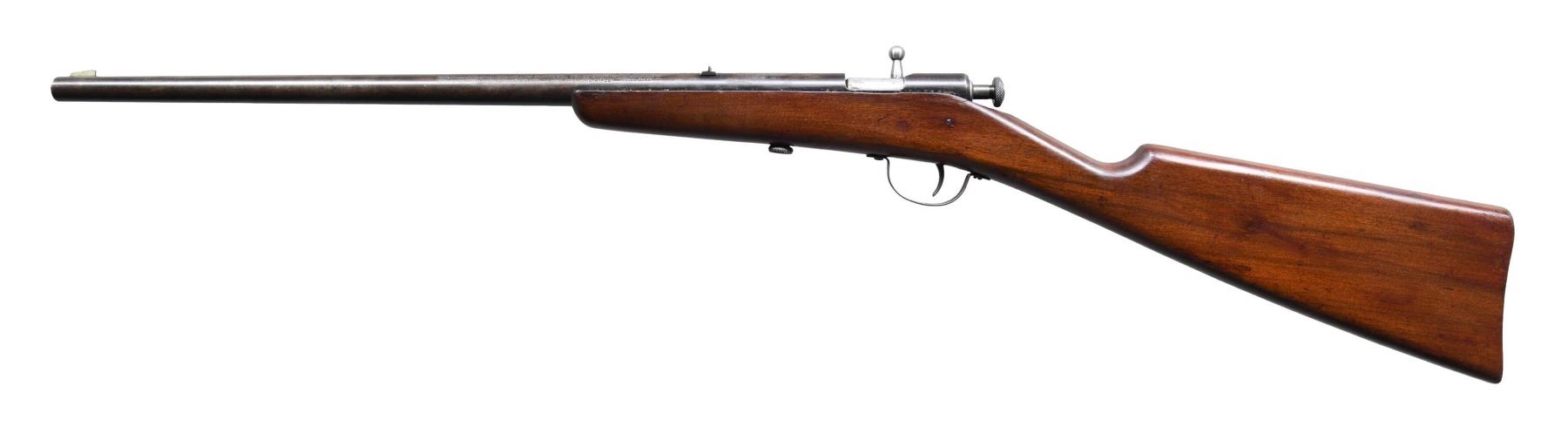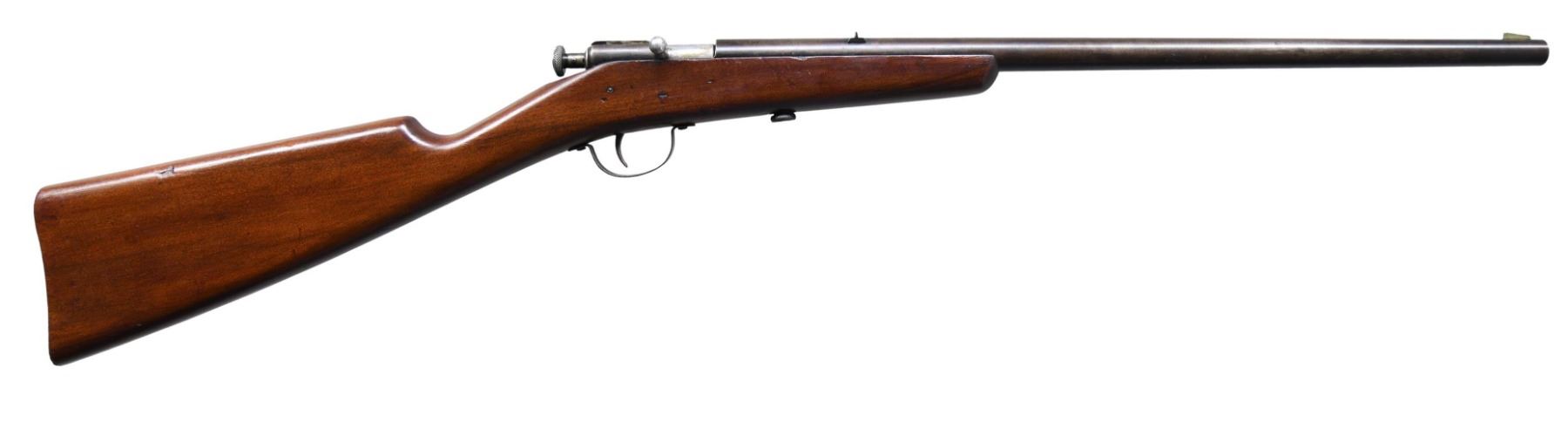 Cal. 22 S, L, LR. NSN. Bbl. 18". Model 58 single shot bolt action rifle mfg. by Winchester between 1928-1934. Left side of the bbl. is marked with Winchester's mfg. and patent information, followed by the model and cal. designations, as well as the Winchester trademark logo. Metal components exhibit a blue finish overall, save for on the bolt, which is polished in-the-white. 1-piece plain wood straight grip buttstock has been lightly sanded and revarnished at one time. German silver blade front sight, with dovetailed V-notch rear sight. CONDITION: metal components retain fair amounts of their original factory blue finish, exhibiting wear and thinning overall that shows through to gray and brown patinas, with some scattered spots of light surface oxidation. Bolt shows scattered spots of age related discoloration. Very bright bore, exhibiting a few scattered spots of light to mild pitting, while retaining strong rifling throughout. Stock shows scattered marks and impressions from handling and storage, with a small crack on the left side at the rear of the receiver. (25-1793/MLW). CURIO. $200-400.