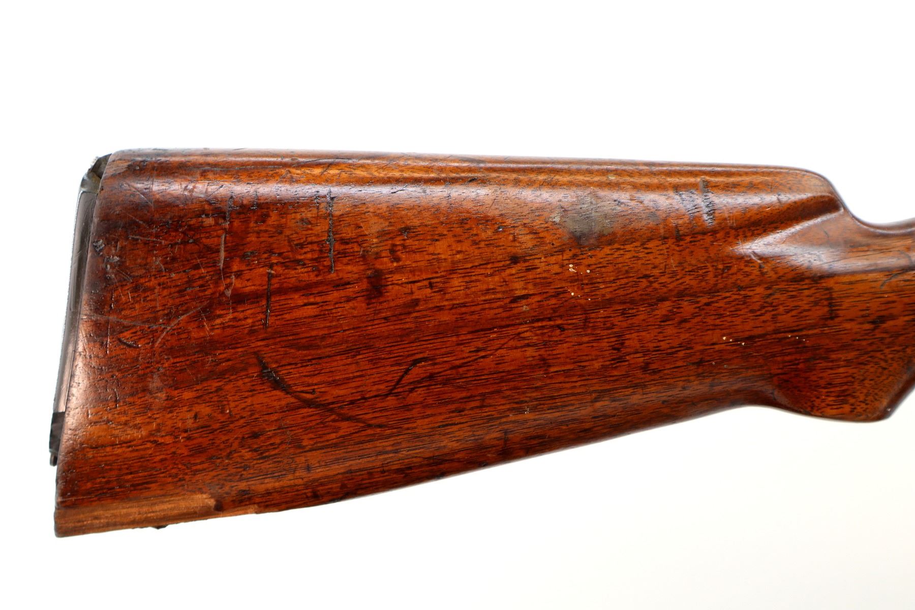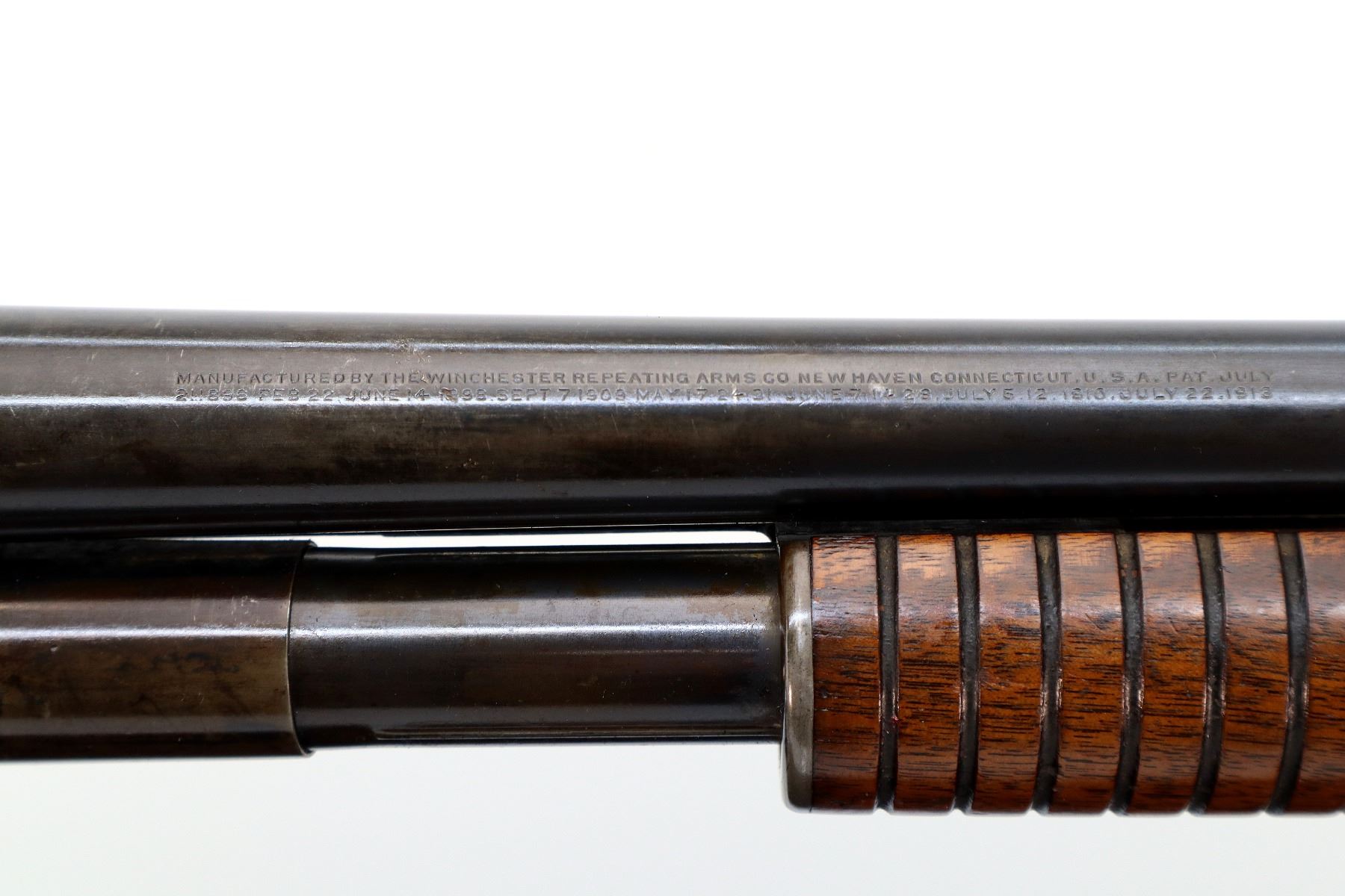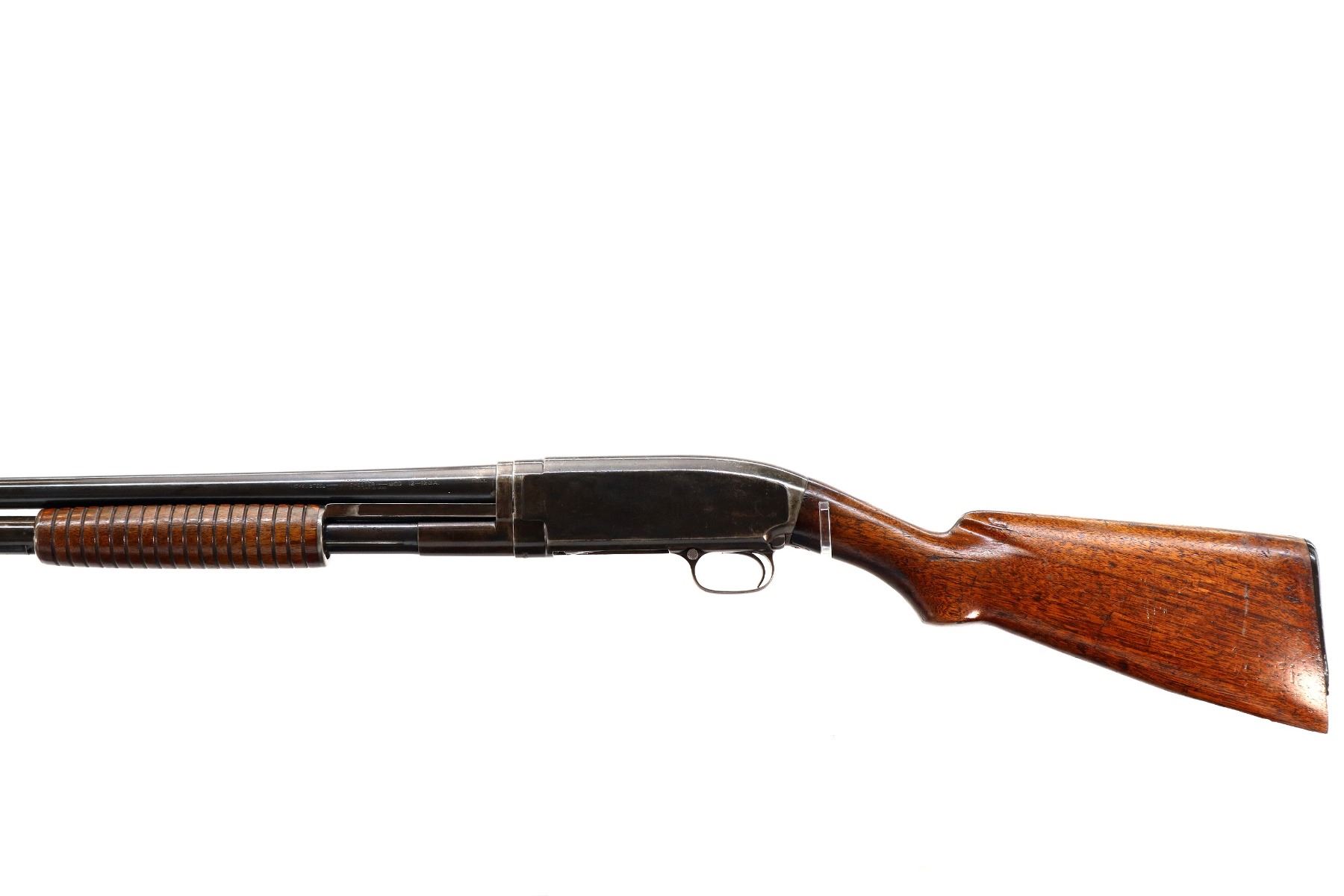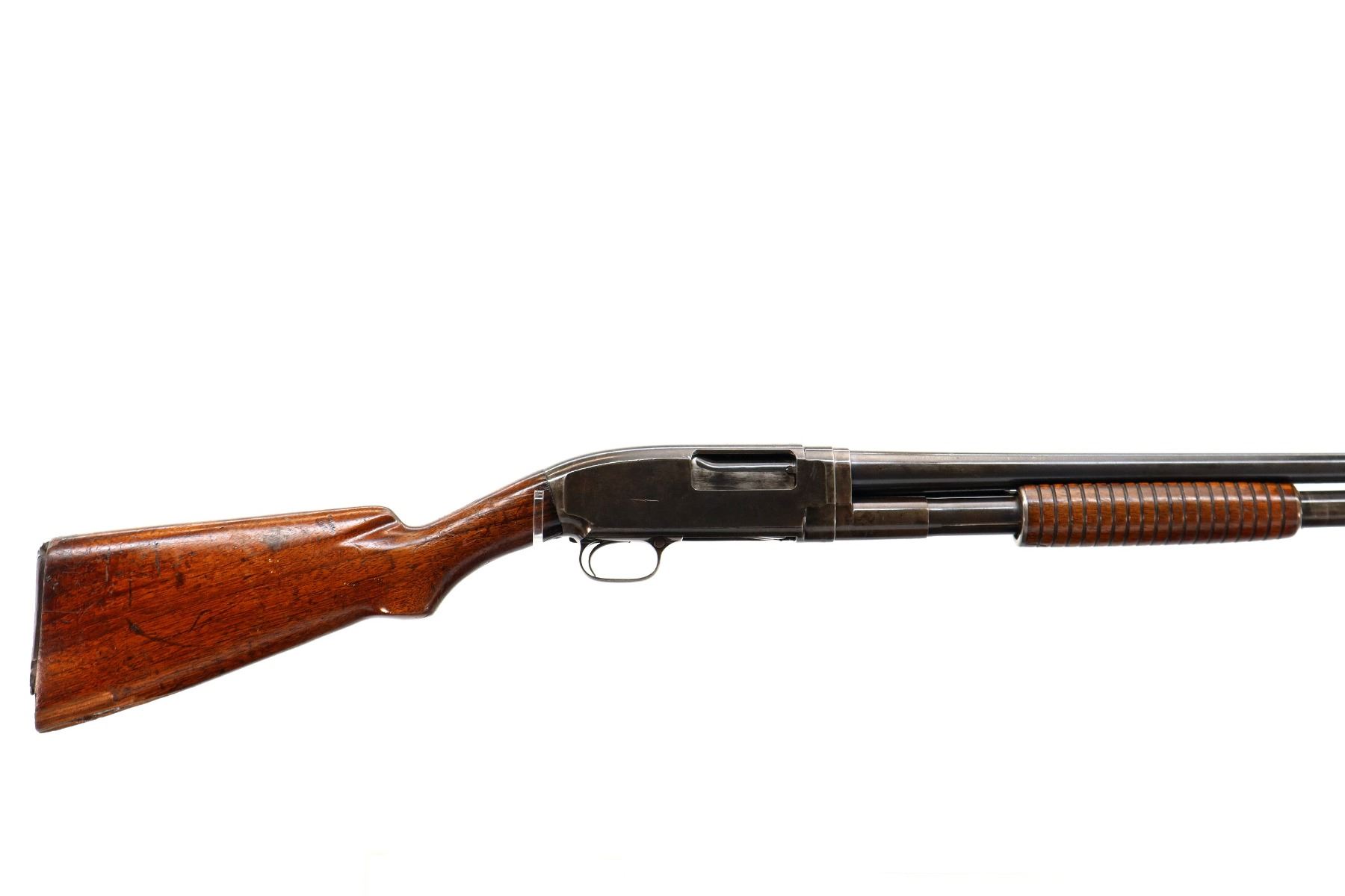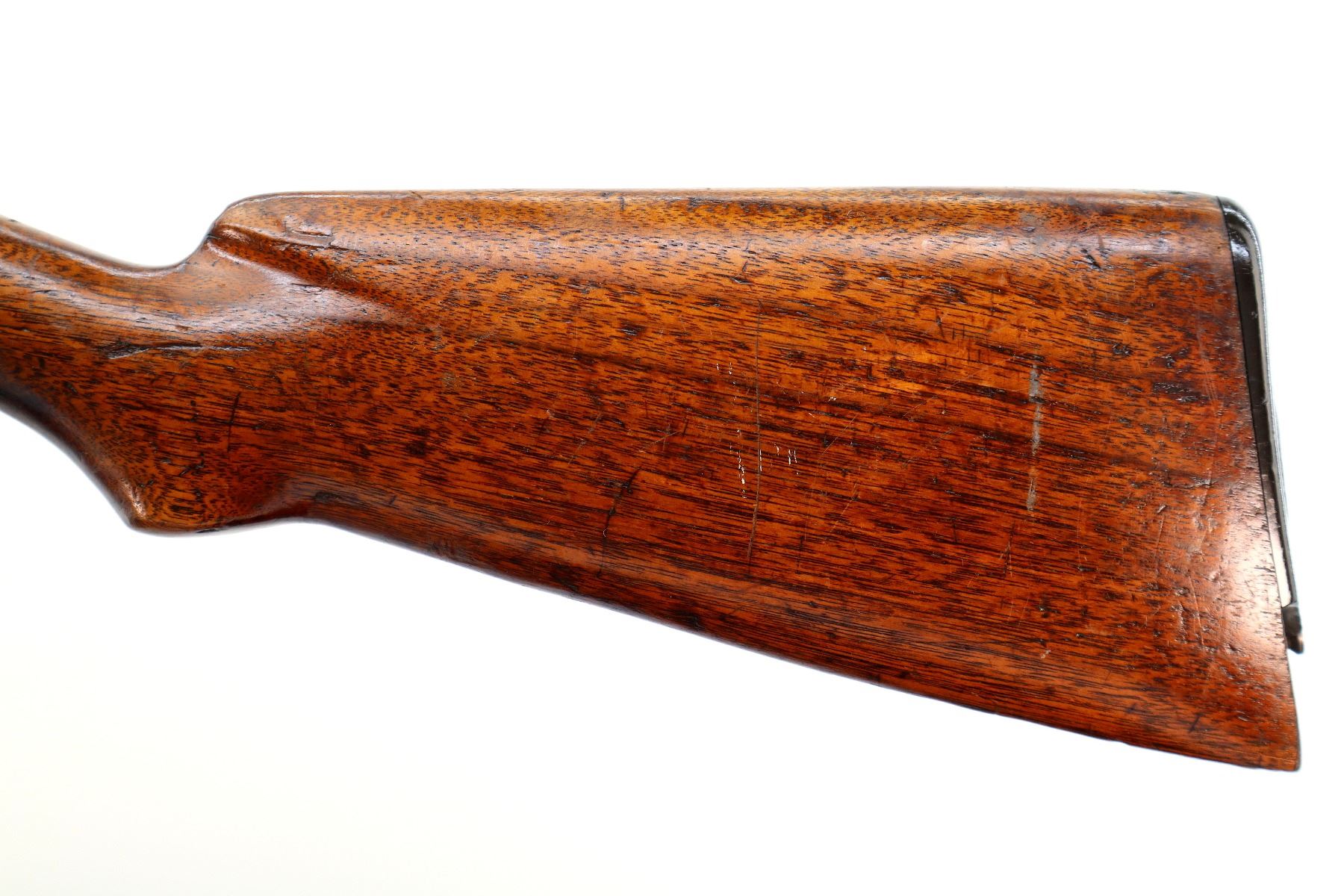 Main Description: Manufactured 1920. Brass bead, metal has been reblued, round barrel. Two piece wood stocks, grooved forearm, pistol grip cracked behind receiver, checkered black polymer butt plate broken at heel and toe, stock is chipped at toe.