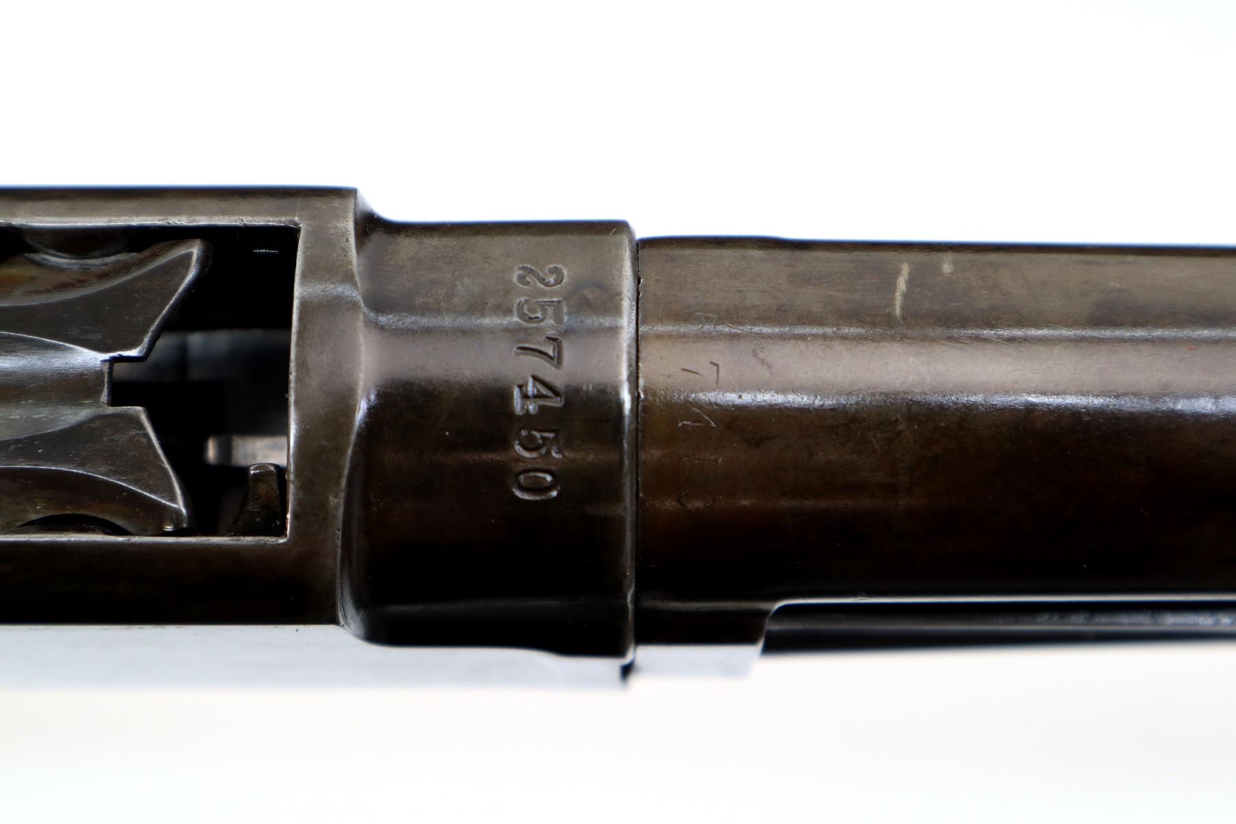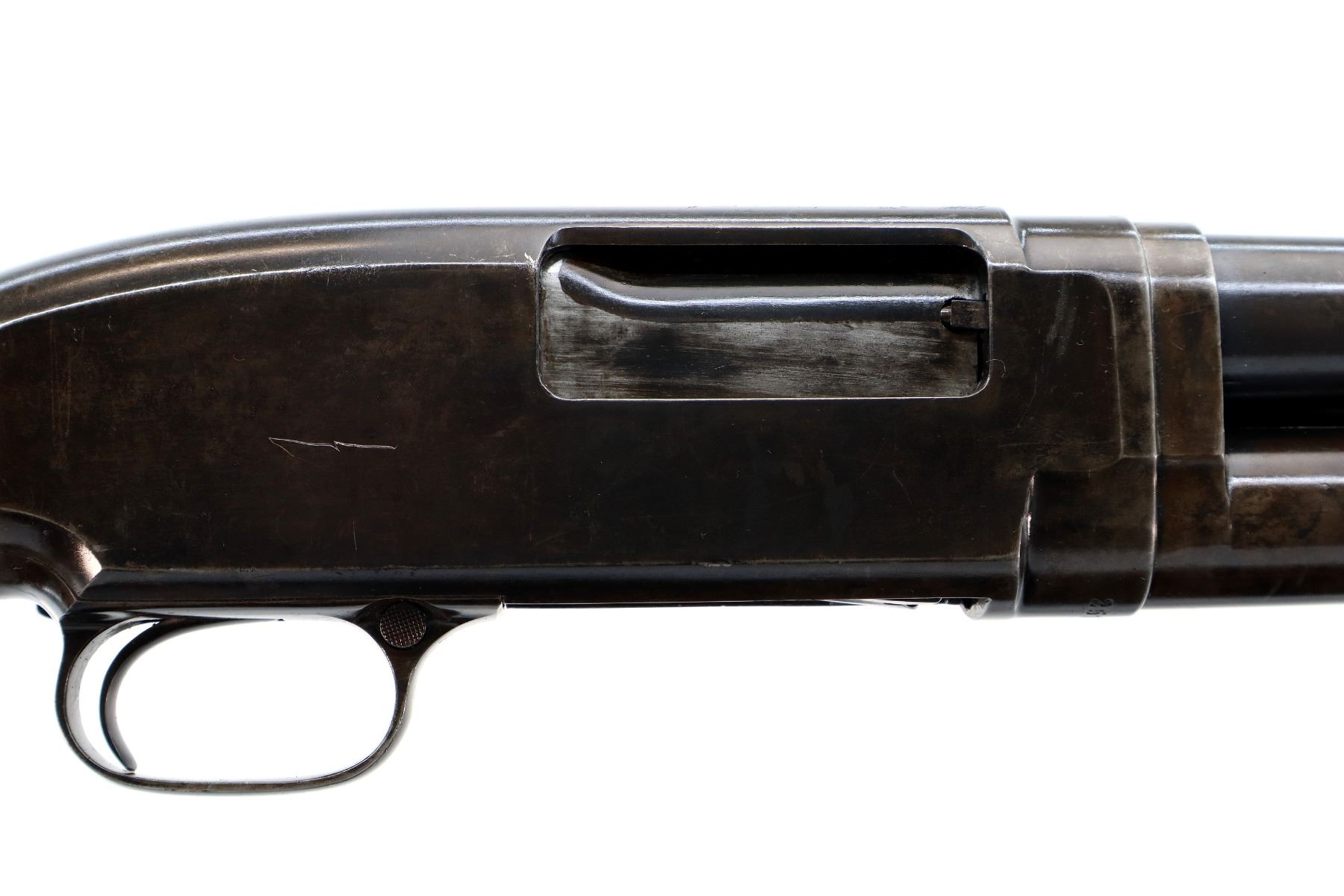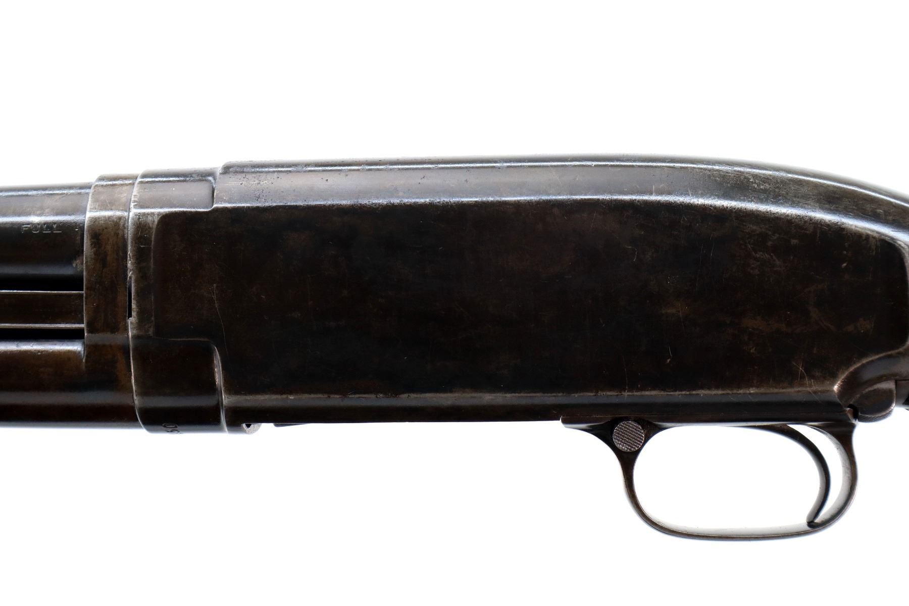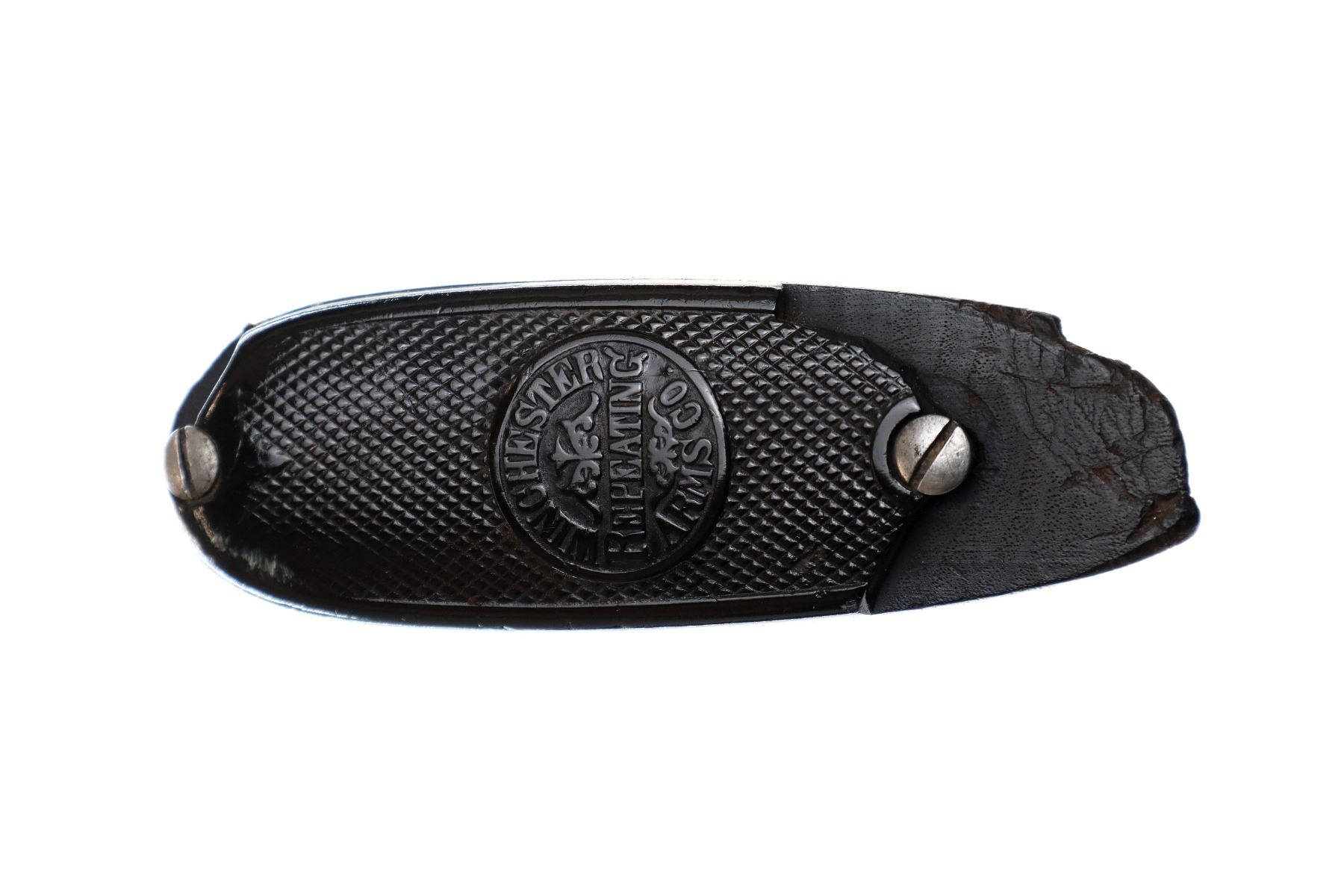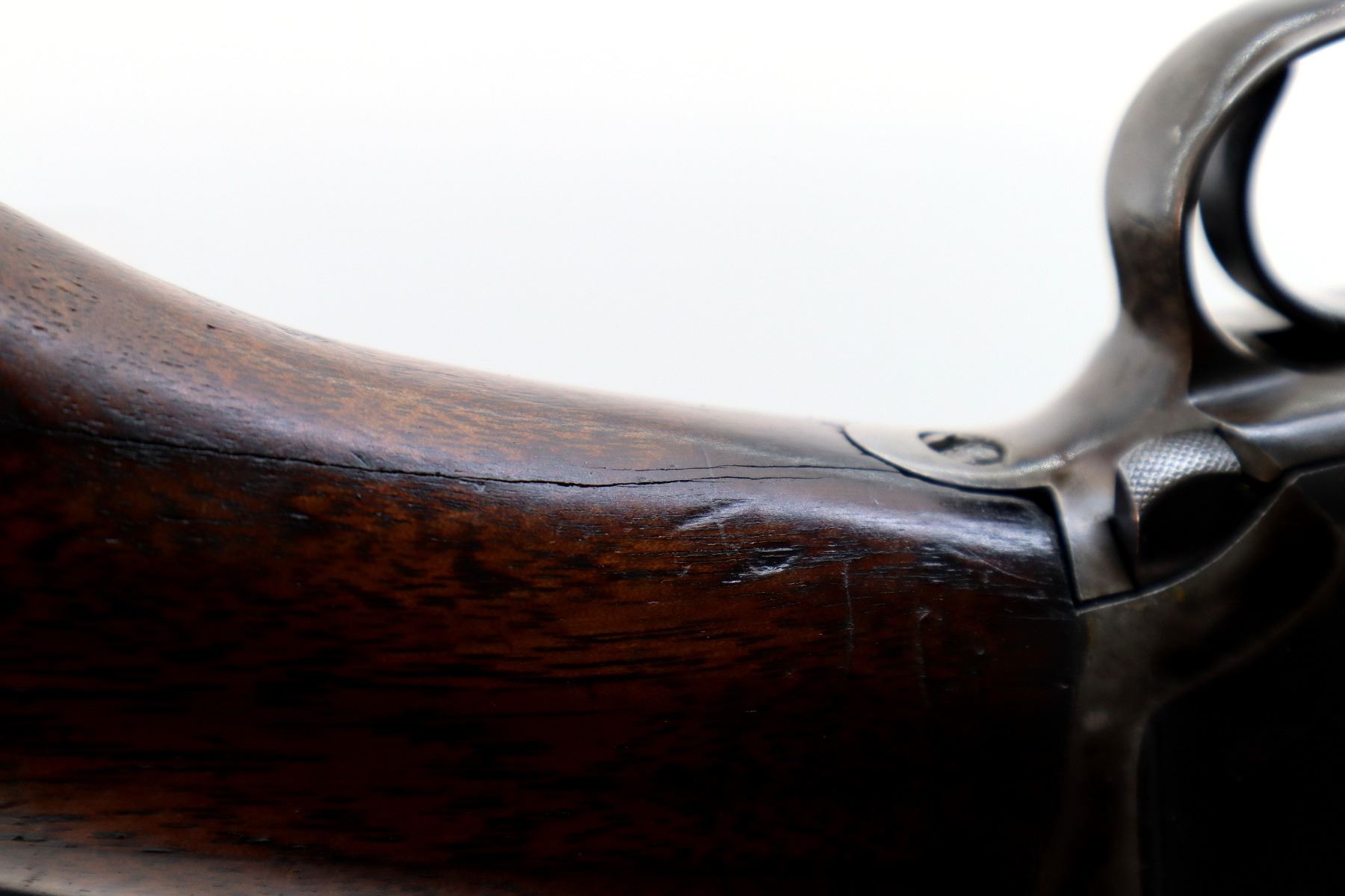 Main Description: Manufactured 1920. Brass bead, metal has been reblued, round barrel. Two piece wood stocks, grooved forearm, pistol grip cracked behind receiver, checkered black polymer butt plate broken at heel and toe, stock is chipped at toe.