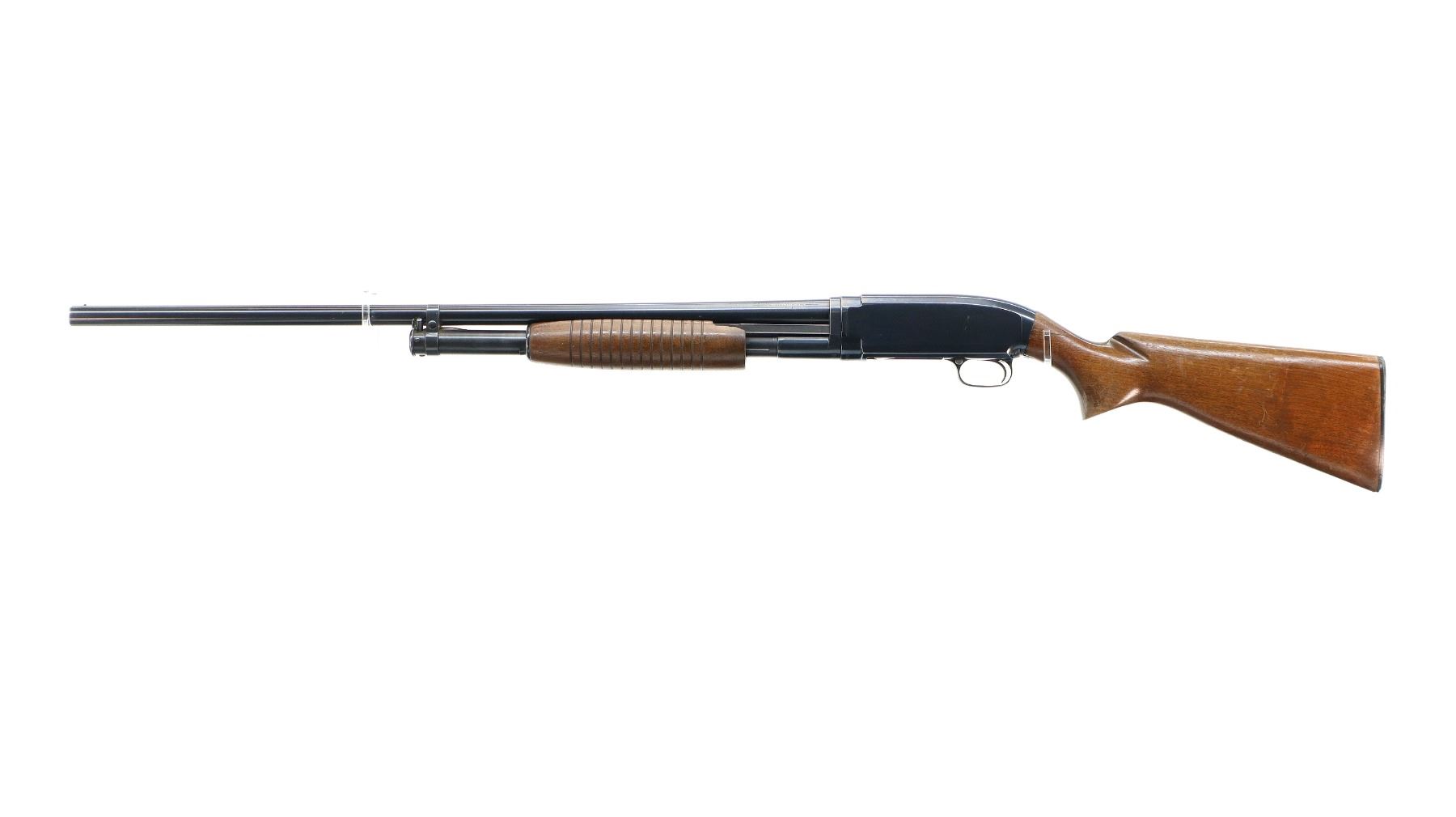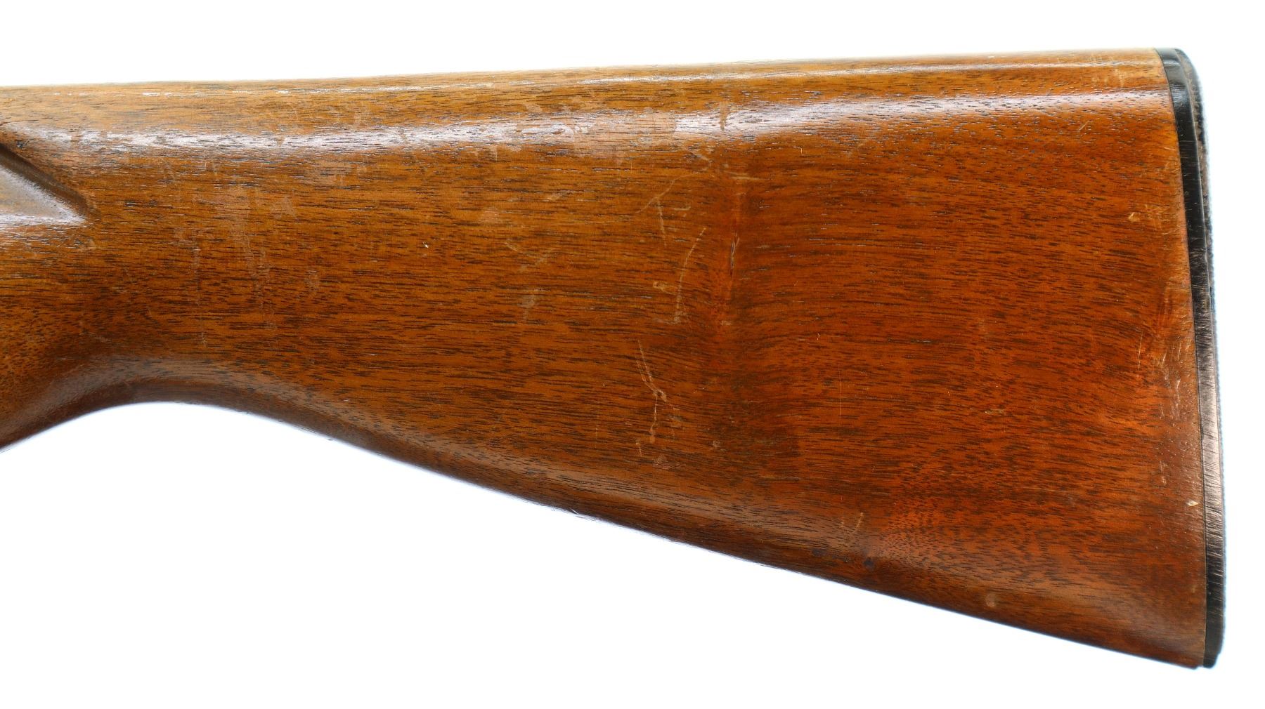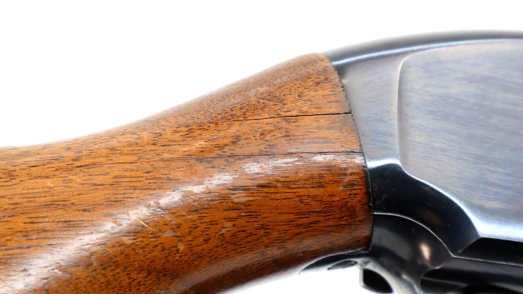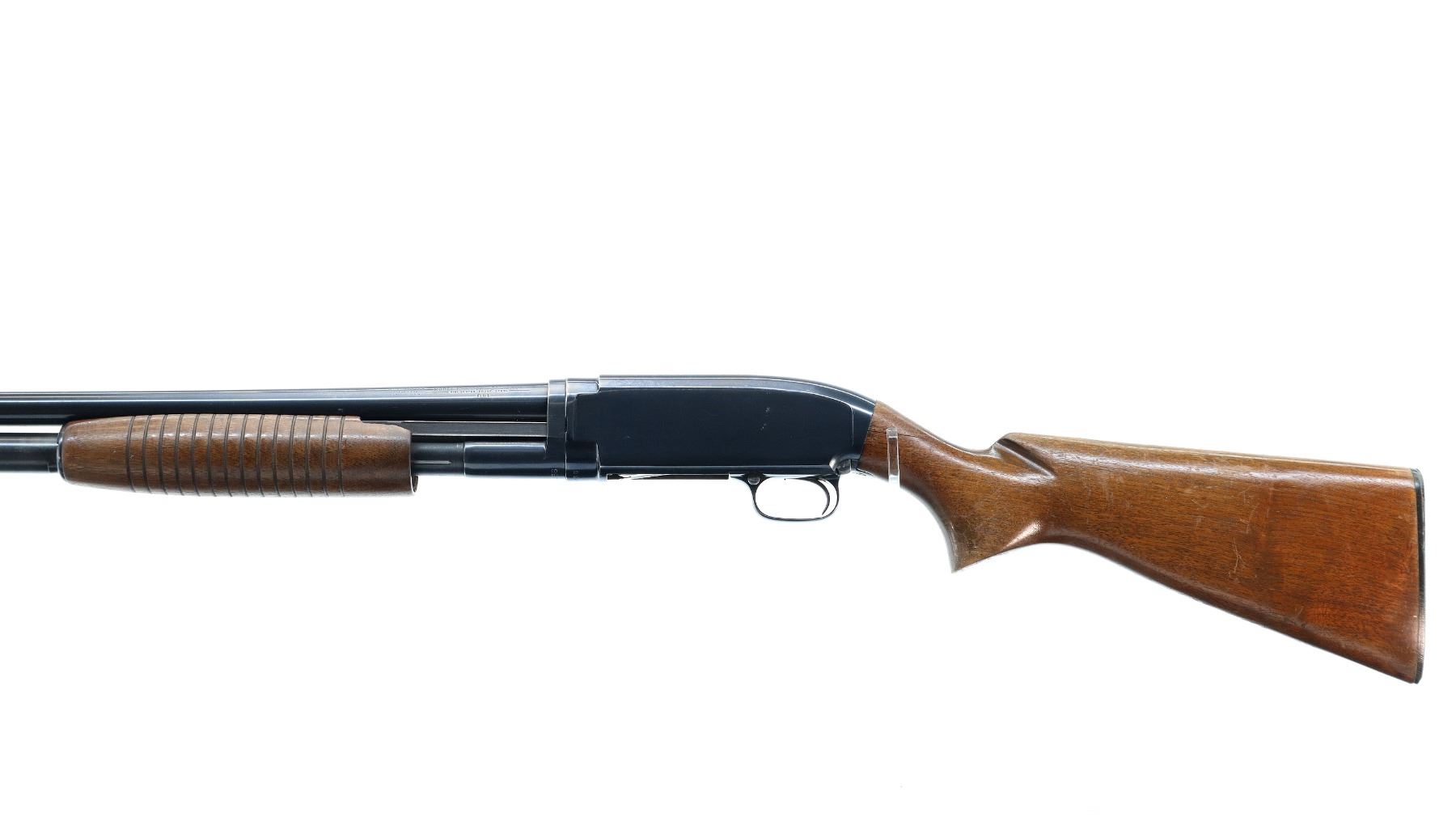Main Description: Manufactured 1957. Silver bead, blued finish, round barrel. Two piece wood stocks, grooved forearm, small chip on left side, pistol grip cracked behind receiver, checkered black polymer butt plate.
