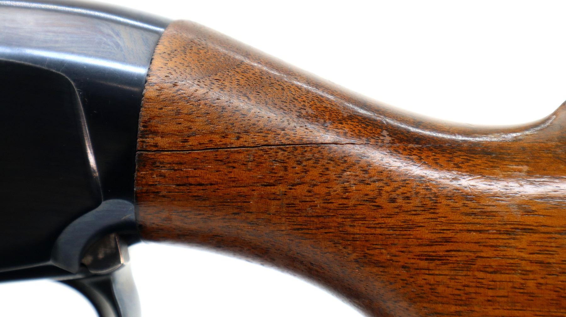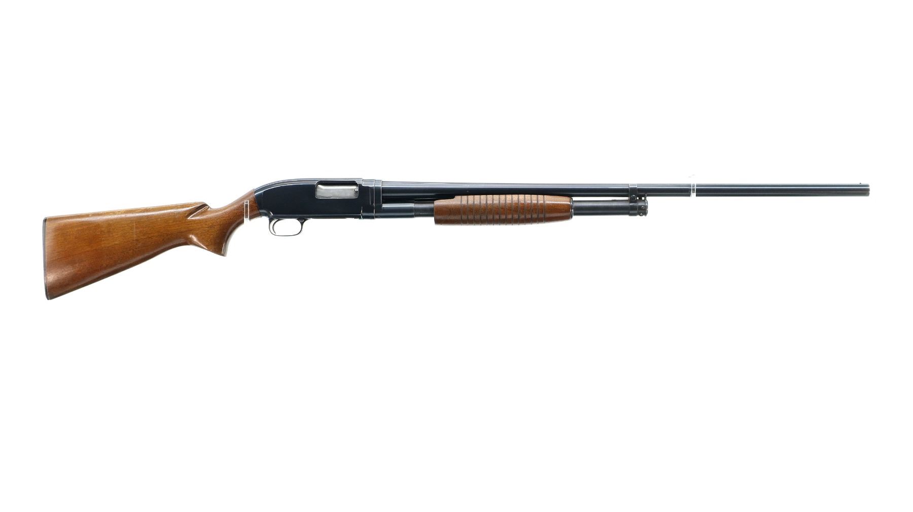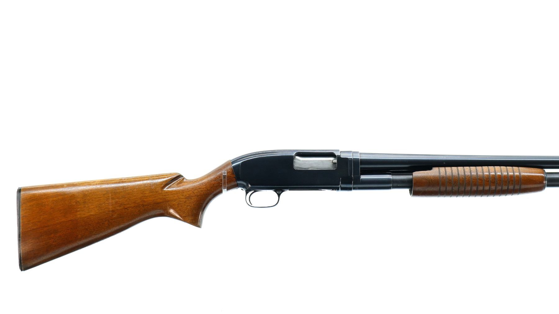 Main Description: Manufactured 1957. Silver bead, blued finish, round barrel. Two piece wood stocks, grooved forearm, small chip on left side, pistol grip cracked behind receiver, checkered black polymer butt plate.