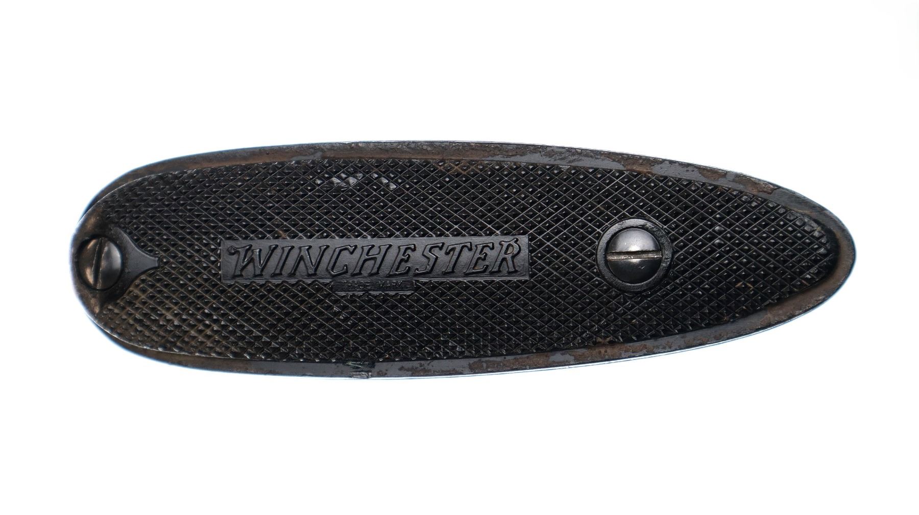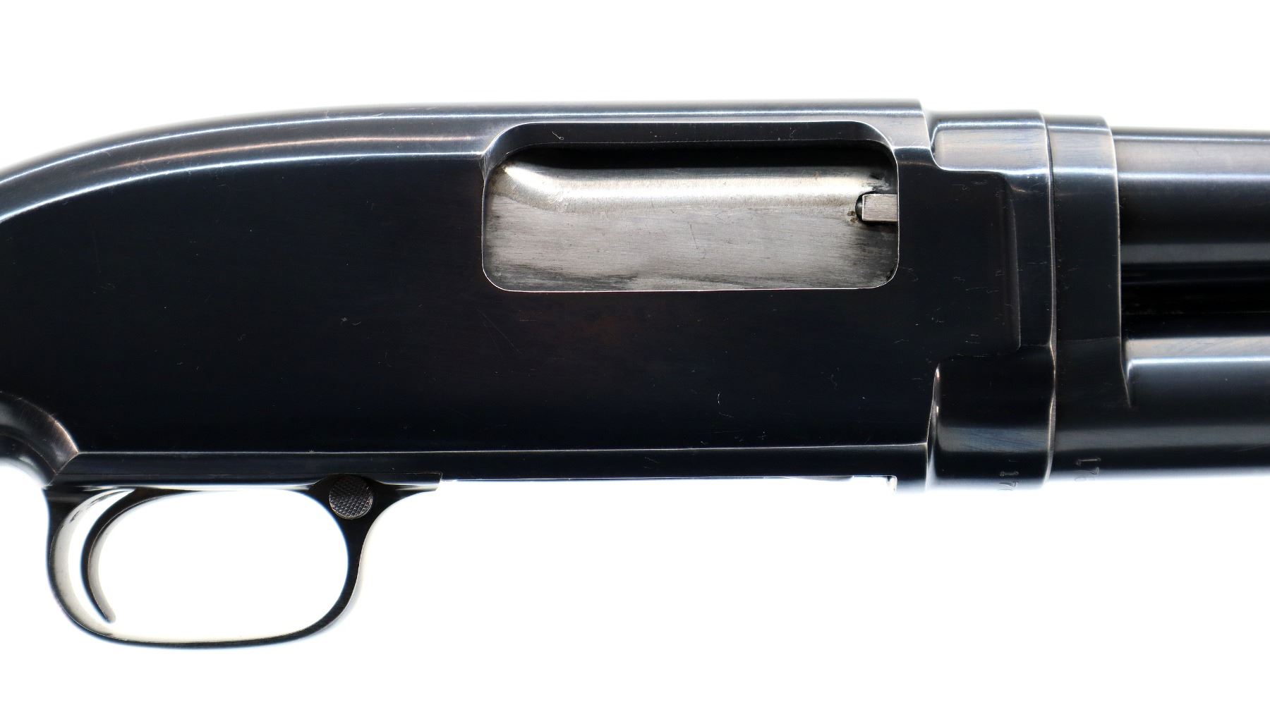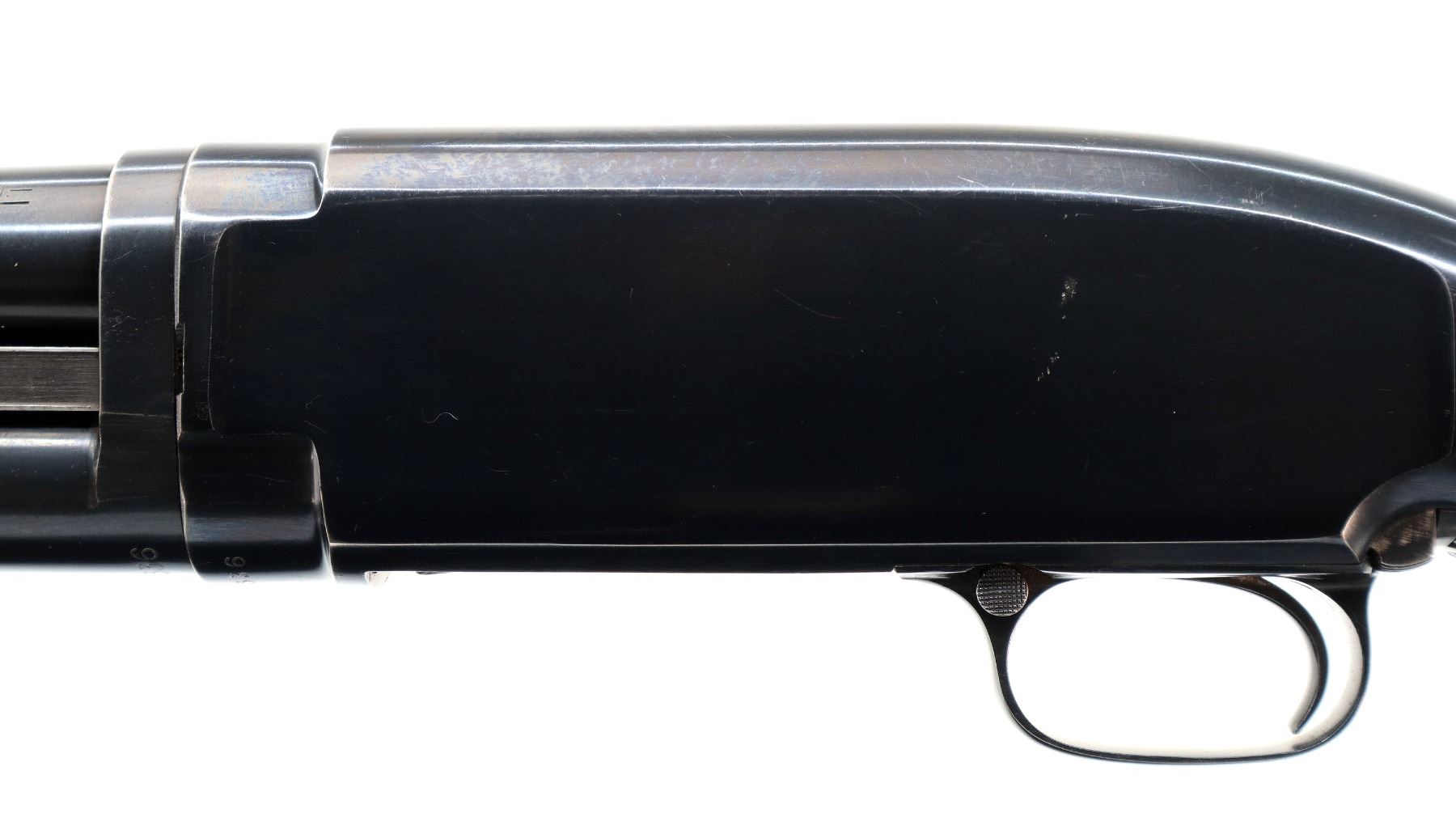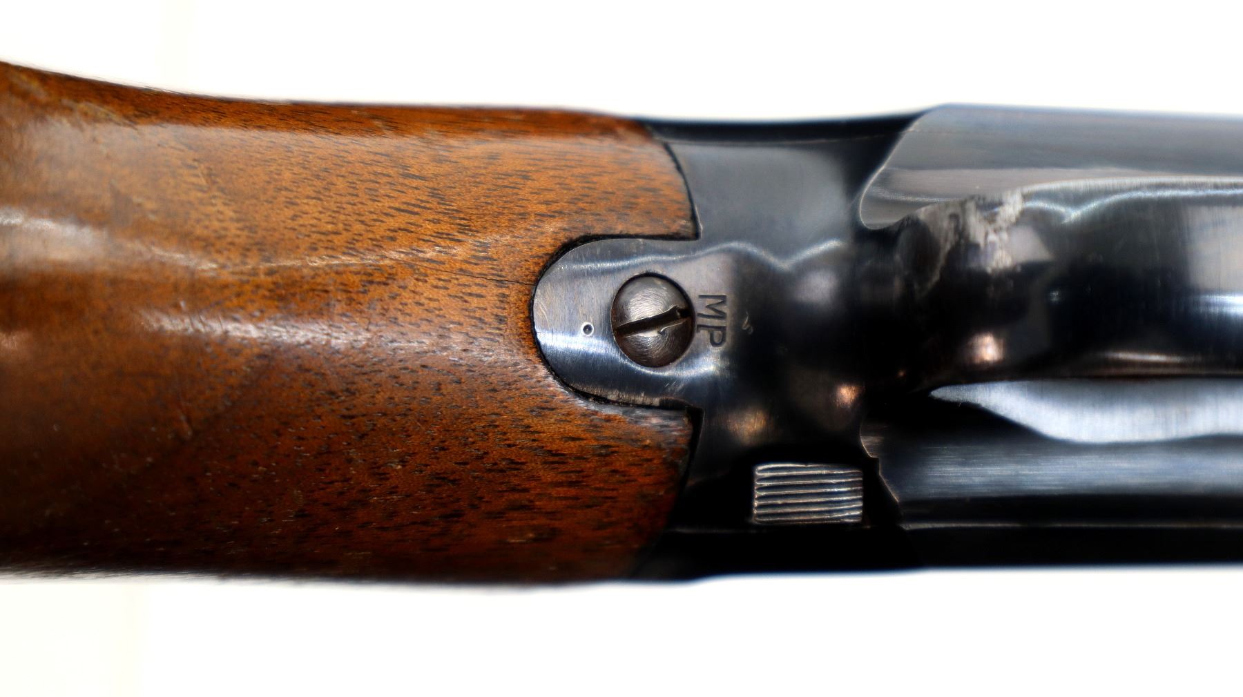 Main Description: Manufactured 1957. Silver bead, blued finish, round barrel. Two piece wood stocks, grooved forearm, small chip on left side, pistol grip cracked behind receiver, checkered black polymer butt plate.