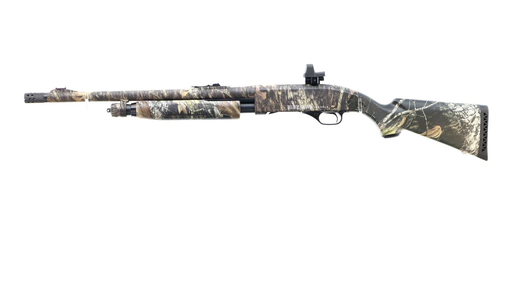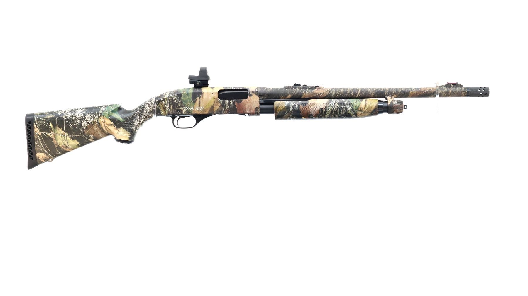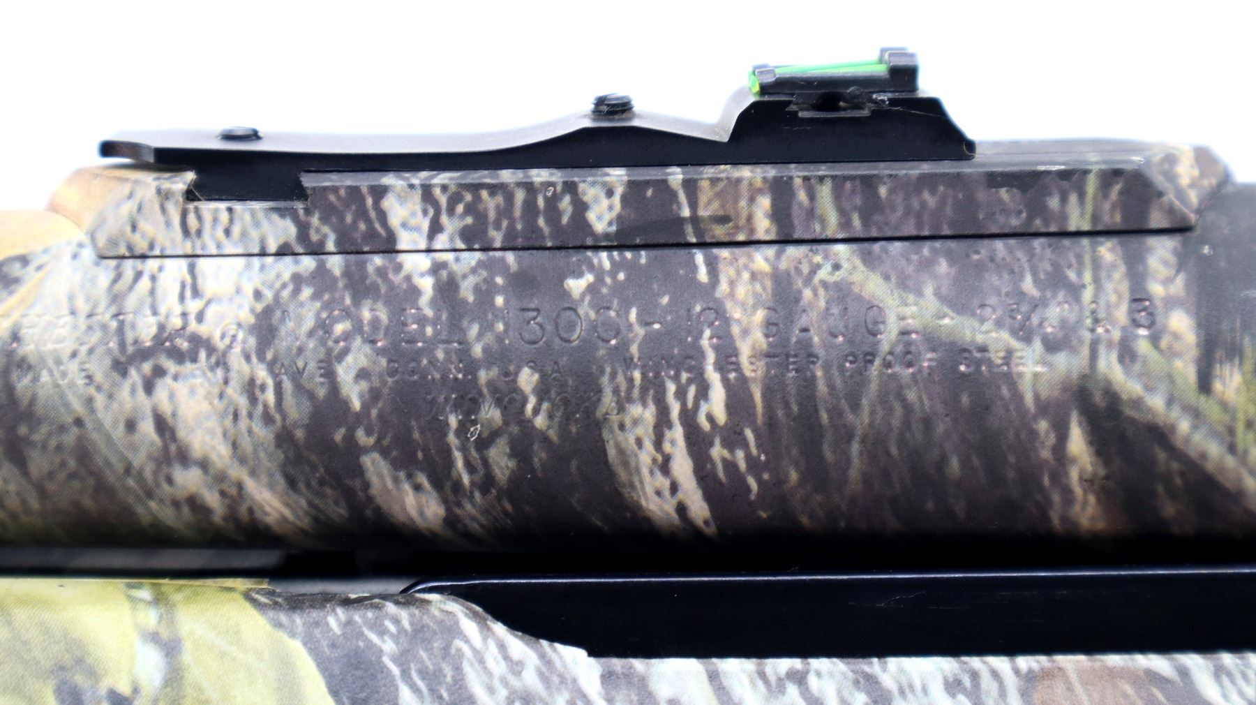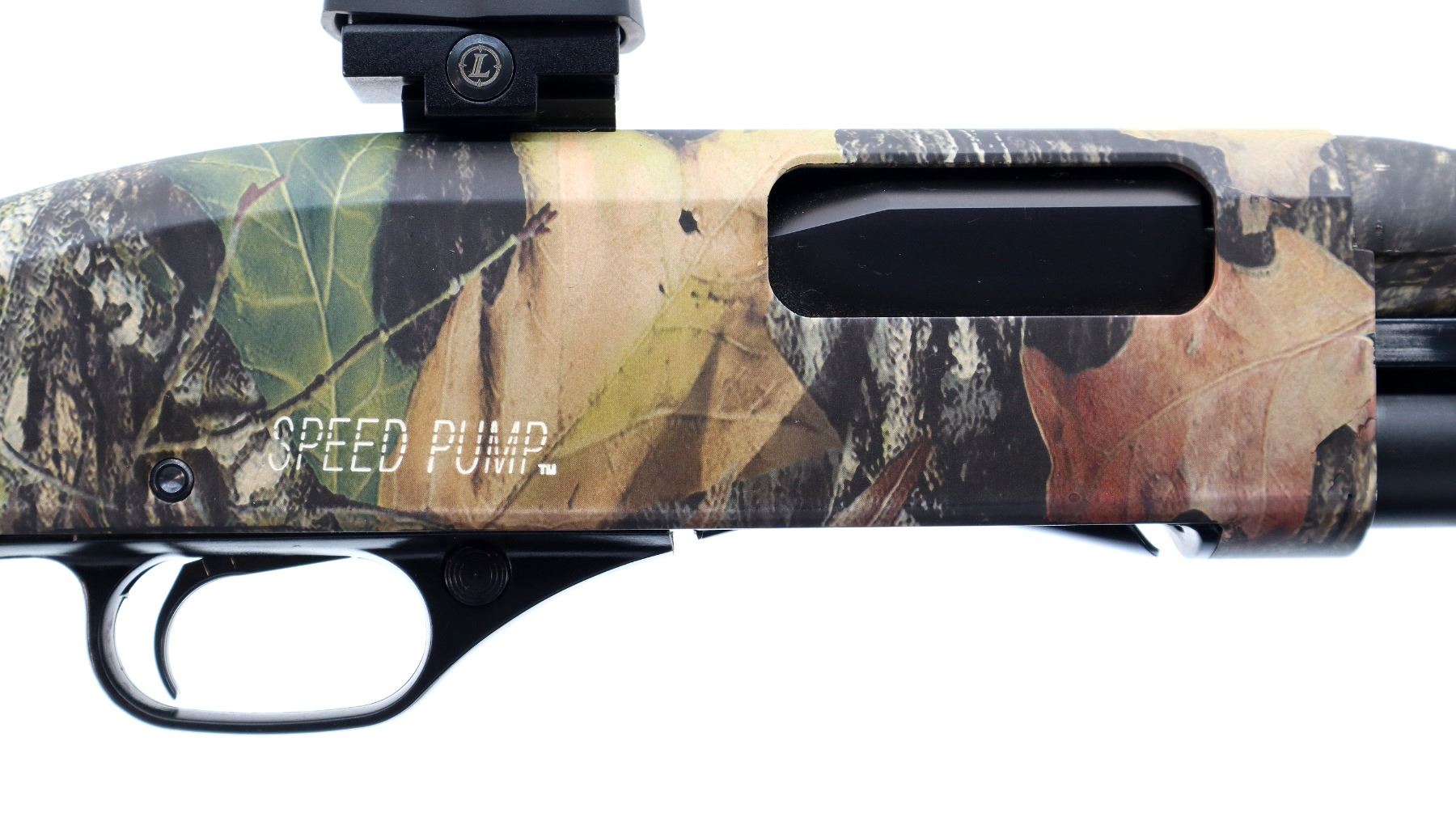 Main Description: Red fiber optic blade front sight with ramp, adjustable u notched green fiber optic rear sight, Mossy Oak Breakup camo overall, receiver drilled and tapped with Leupold D. Holo sight installed, clear optics (functions). Two piece synthetic stocks, checkered forearm and pistol grip, black vented rubber recoil pad, grip cap, NWTF, swivel studs.