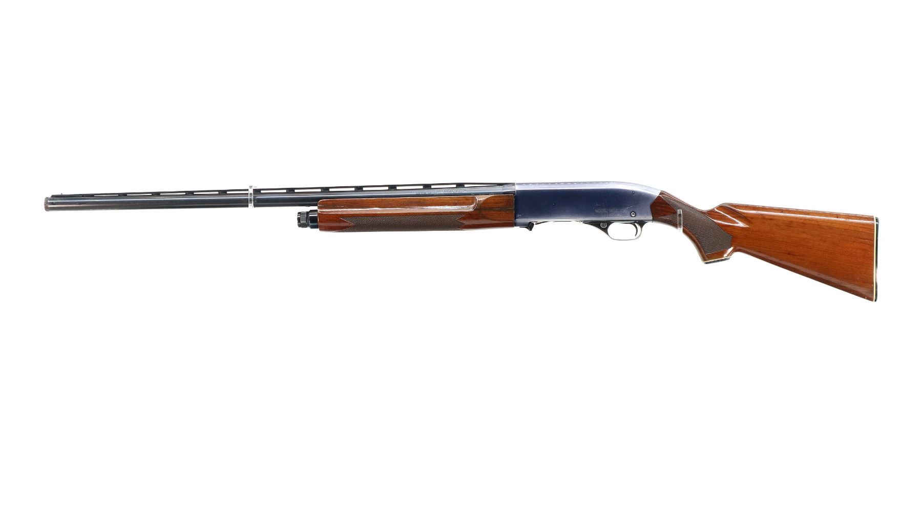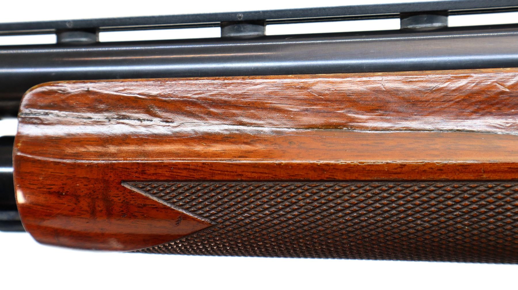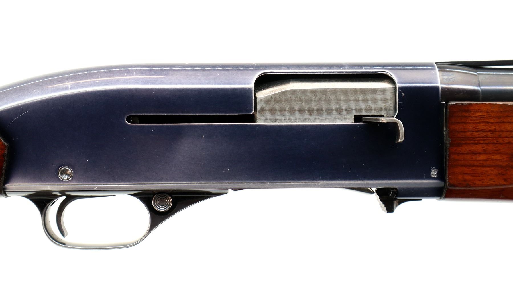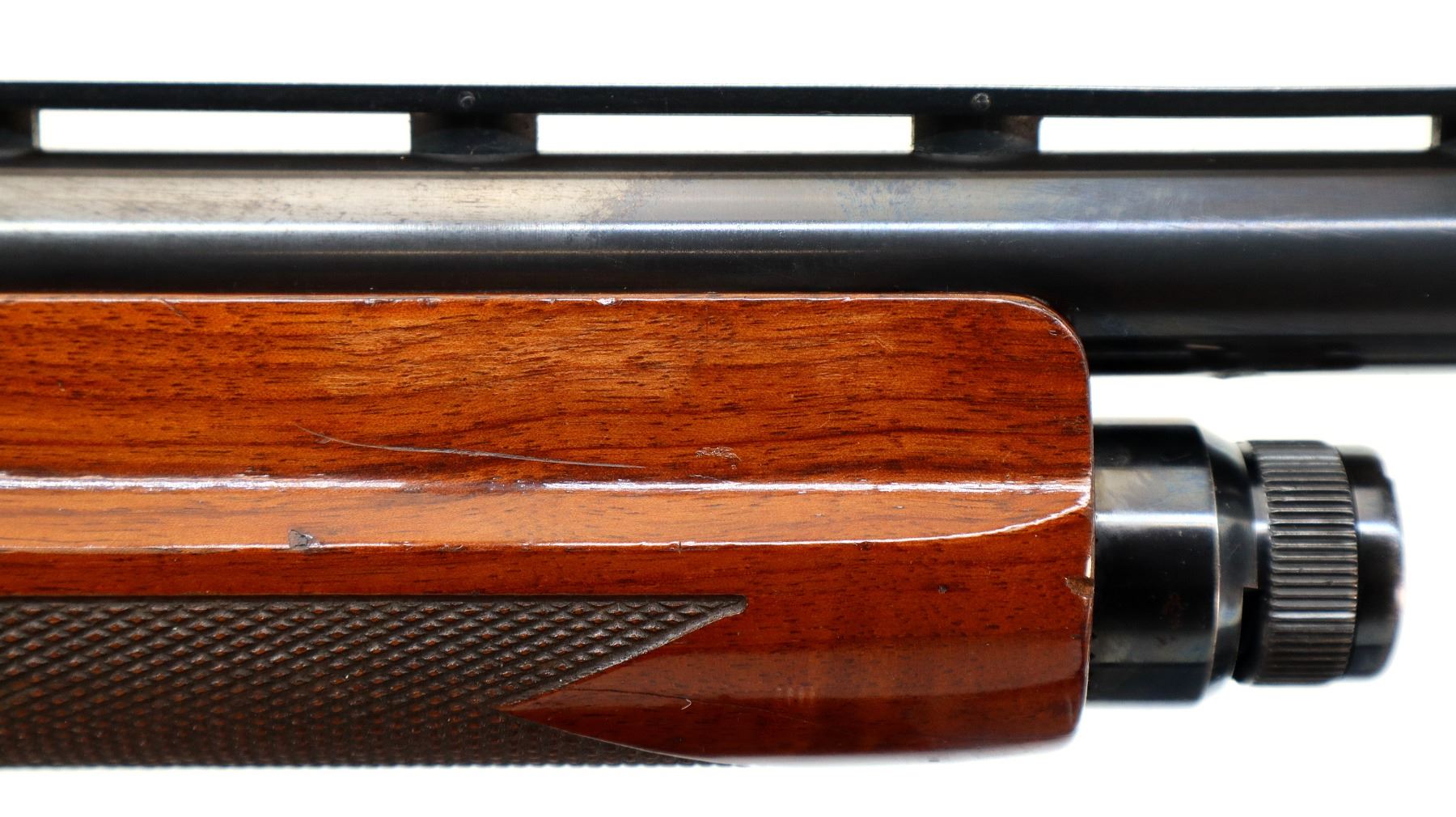 Main Description: Brass bead, blued vent rib barrel, black alloy receiver, jeweled bolt, slide release does not function requires parts, adjustment or repair. Two piece wood stocks, checkered forearm which is cracked and repaired, checkered pistol grip and black polymer butt plate, steel grip cap.