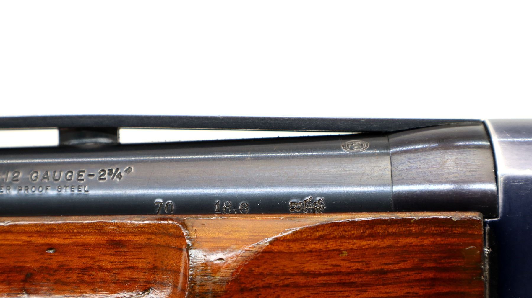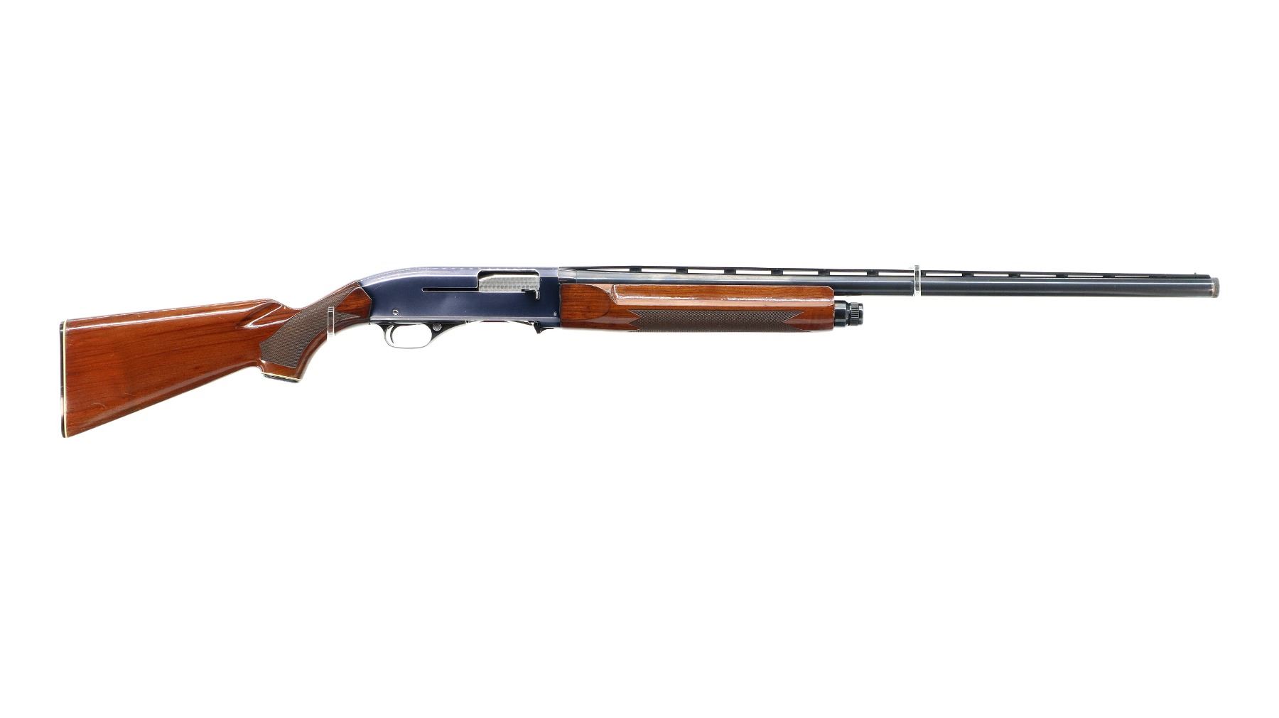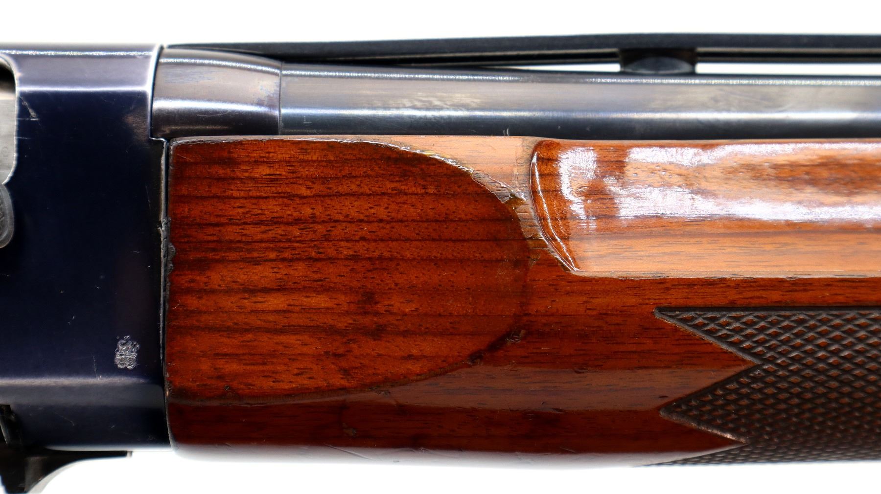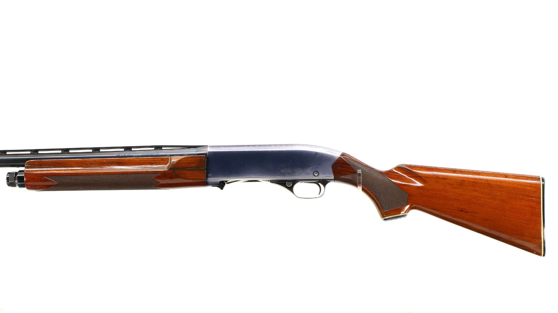 Main Description: Brass bead, blued vent rib barrel, black alloy receiver, jeweled bolt, slide release does not function requires parts, adjustment or repair. Two piece wood stocks, checkered forearm which is cracked and repaired, checkered pistol grip and black polymer butt plate, steel grip cap.