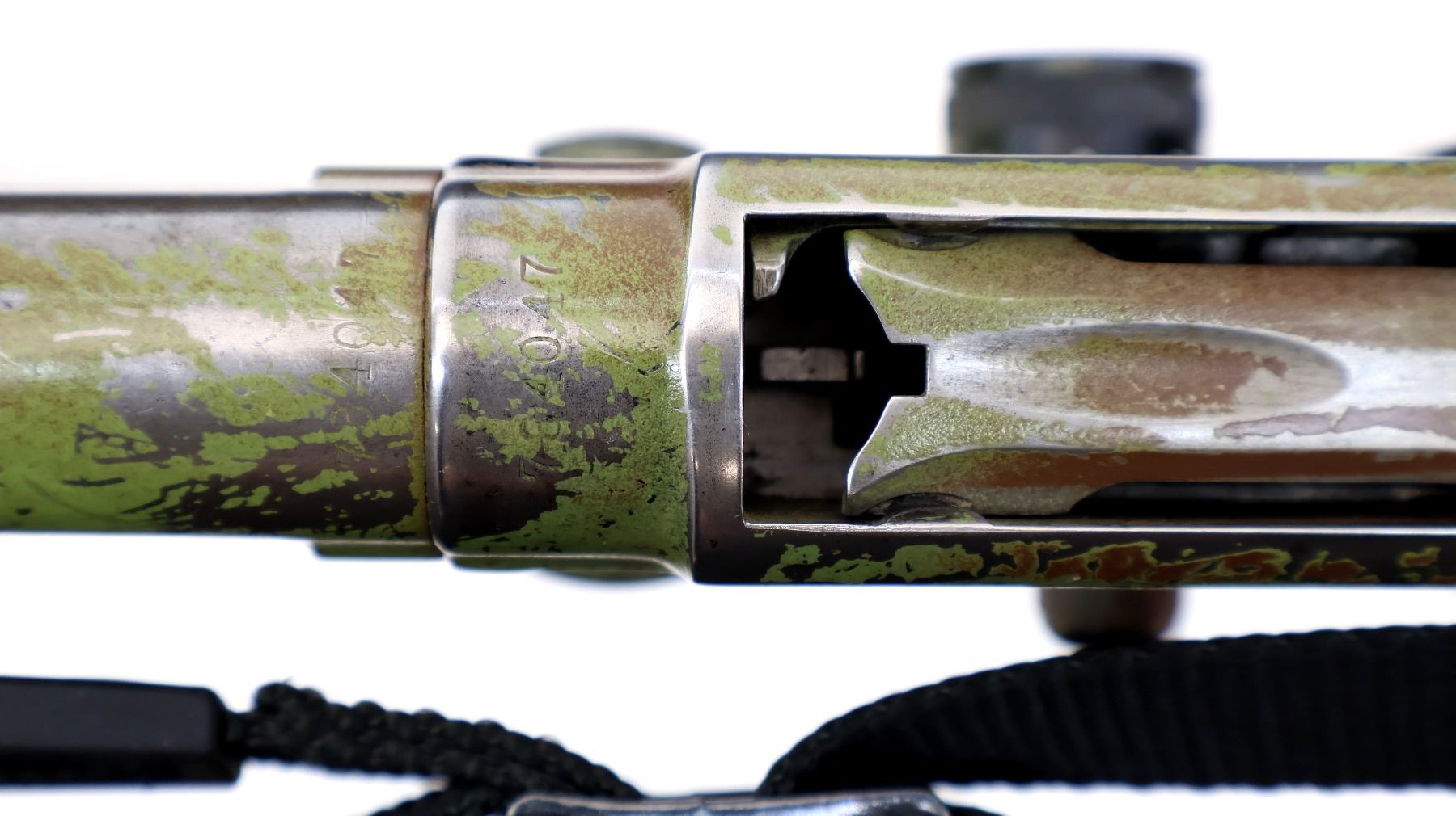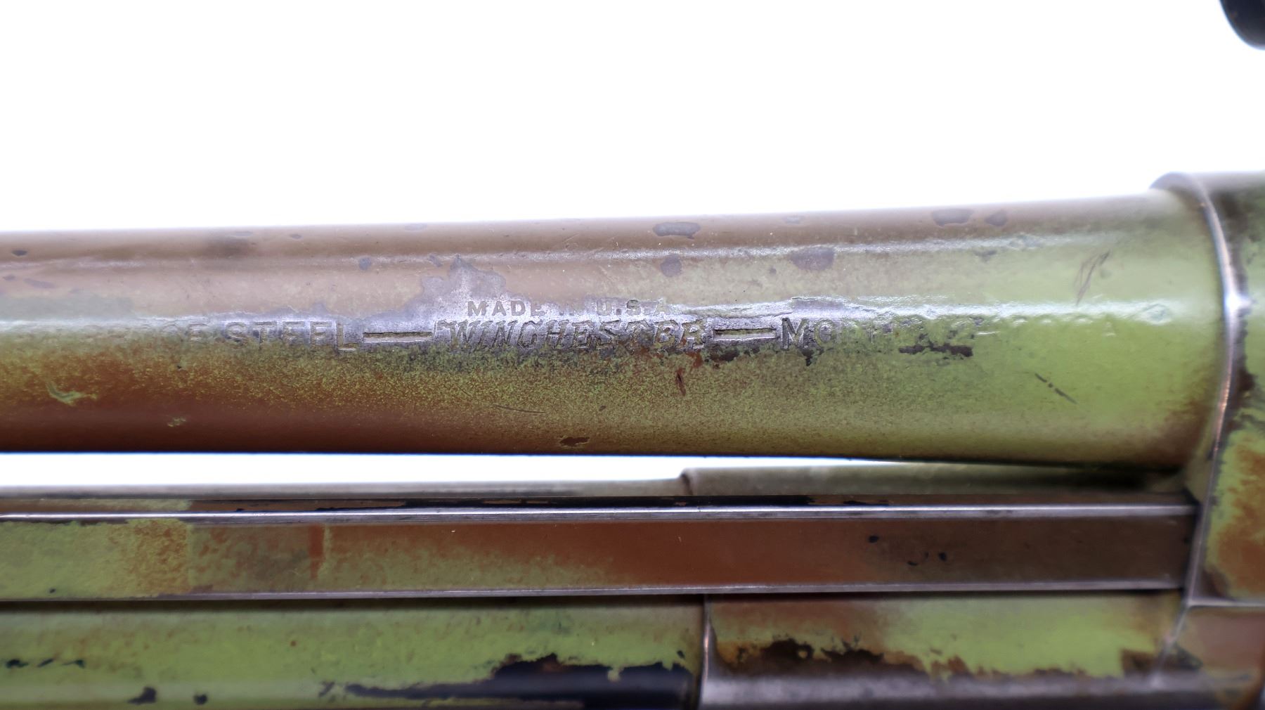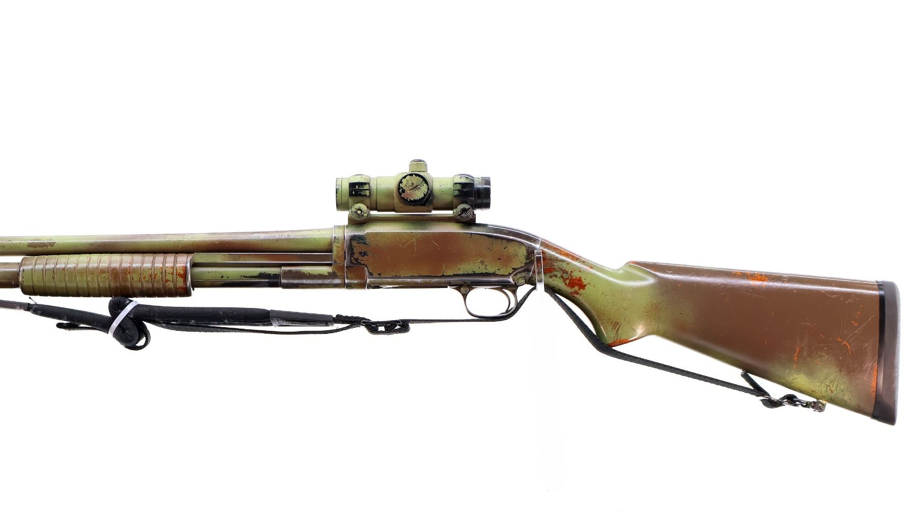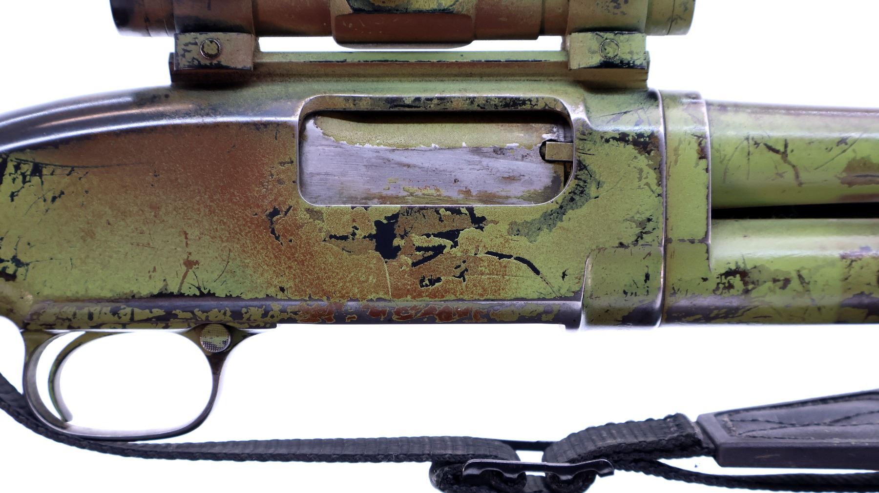 Main Description: Manufactured 1936. Silver bead, custom camo painted finish overall, round barrel, receiver drilled and tapped with Bushnell Red Dot installed, clear optics that functions. Two piece wood stocks, grooved forearm, pistol grip cracked behind receiver, black rubber recoil pad, sling swivels with black nylon sling.