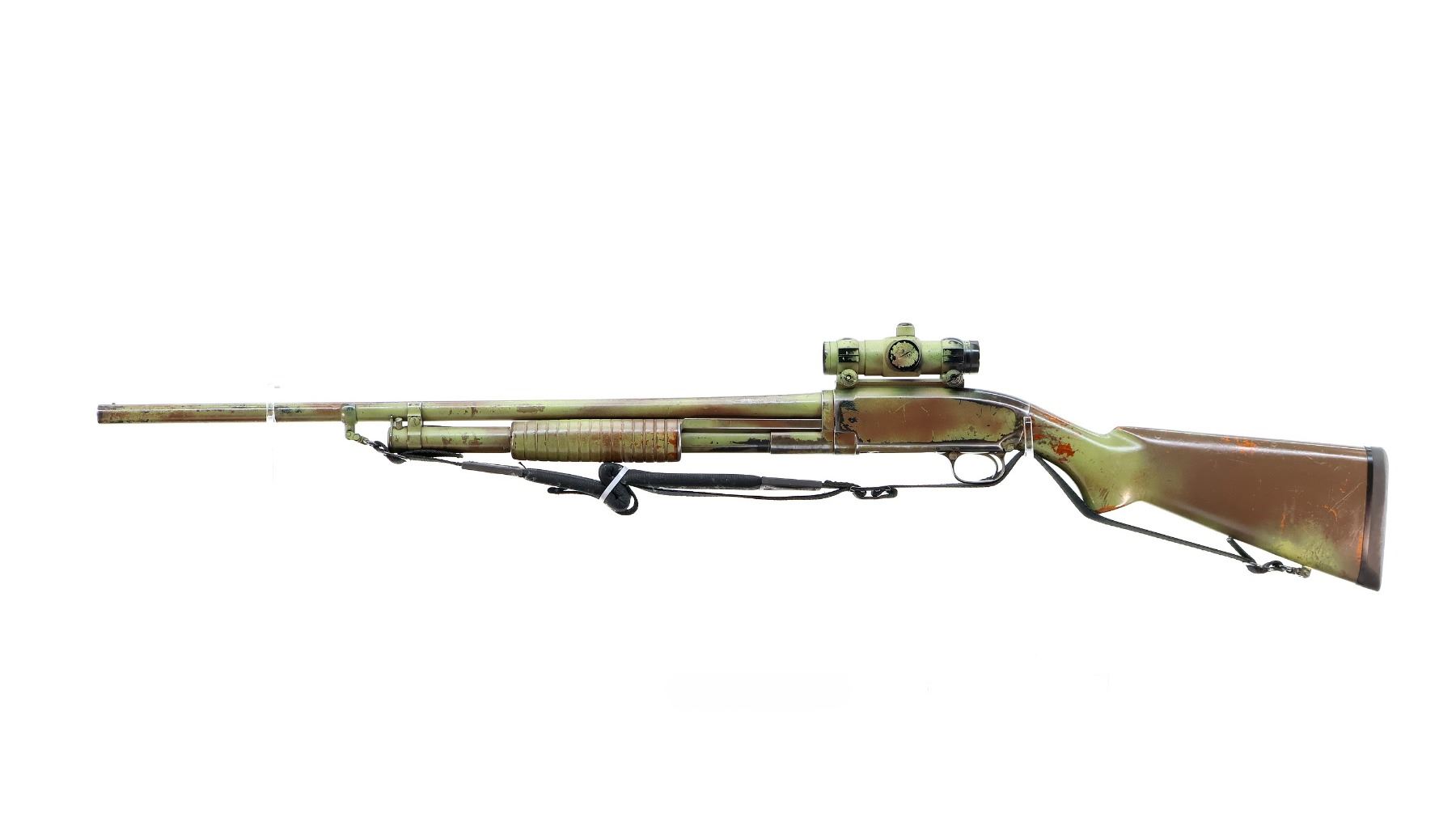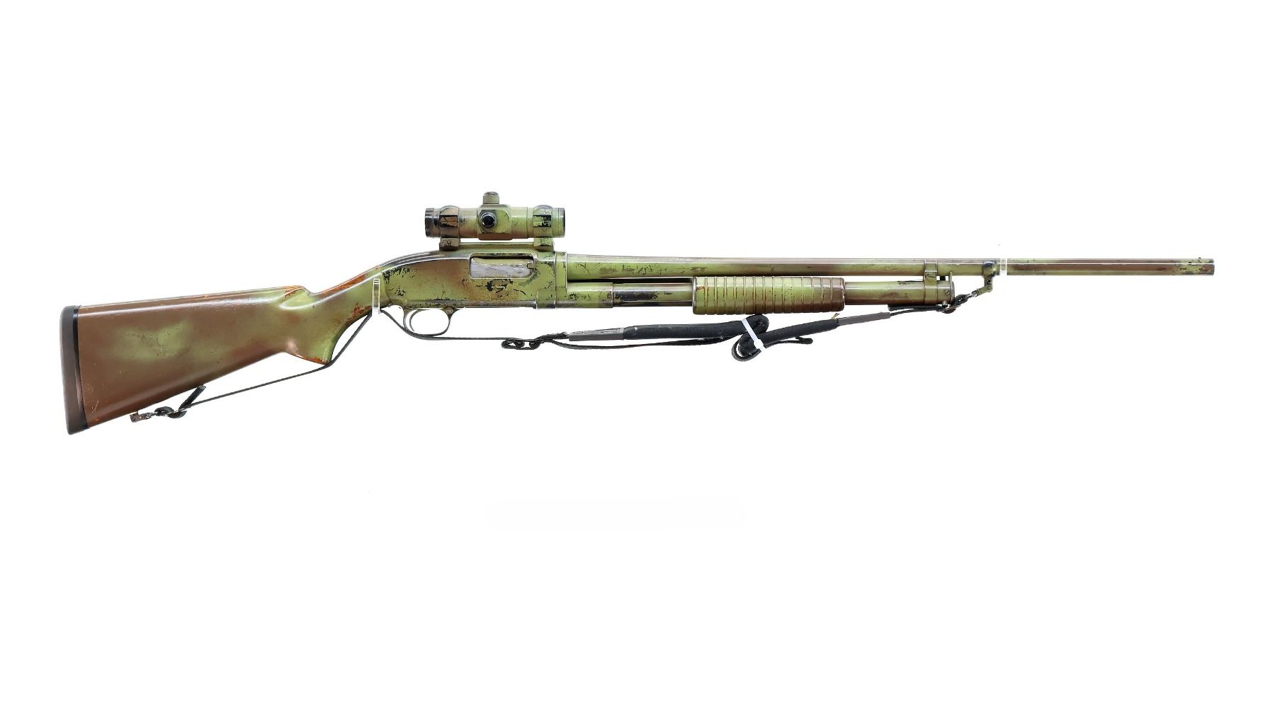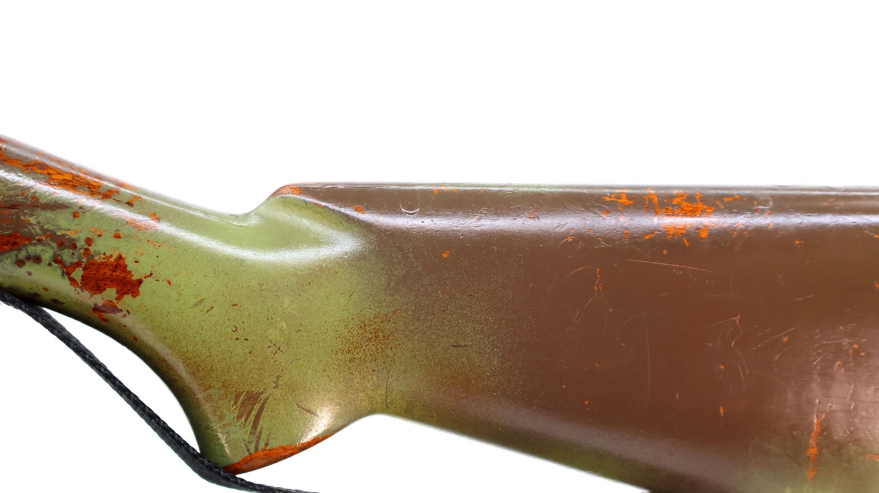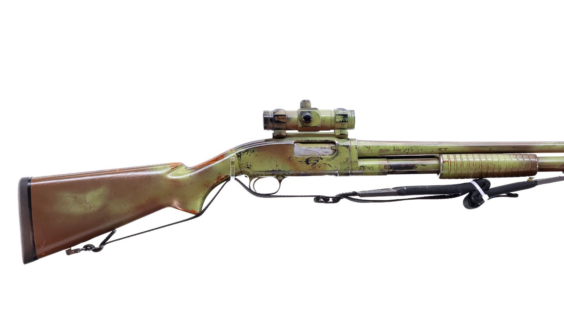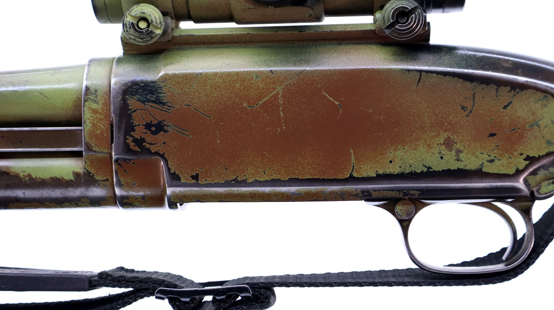 Main Description: Manufactured 1936. Silver bead, custom camo painted finish overall, round barrel, receiver drilled and tapped with Bushnell Red Dot installed, clear optics that functions. Two piece wood stocks, grooved forearm, pistol grip cracked behind receiver, black rubber recoil pad, sling swivels with black nylon sling.