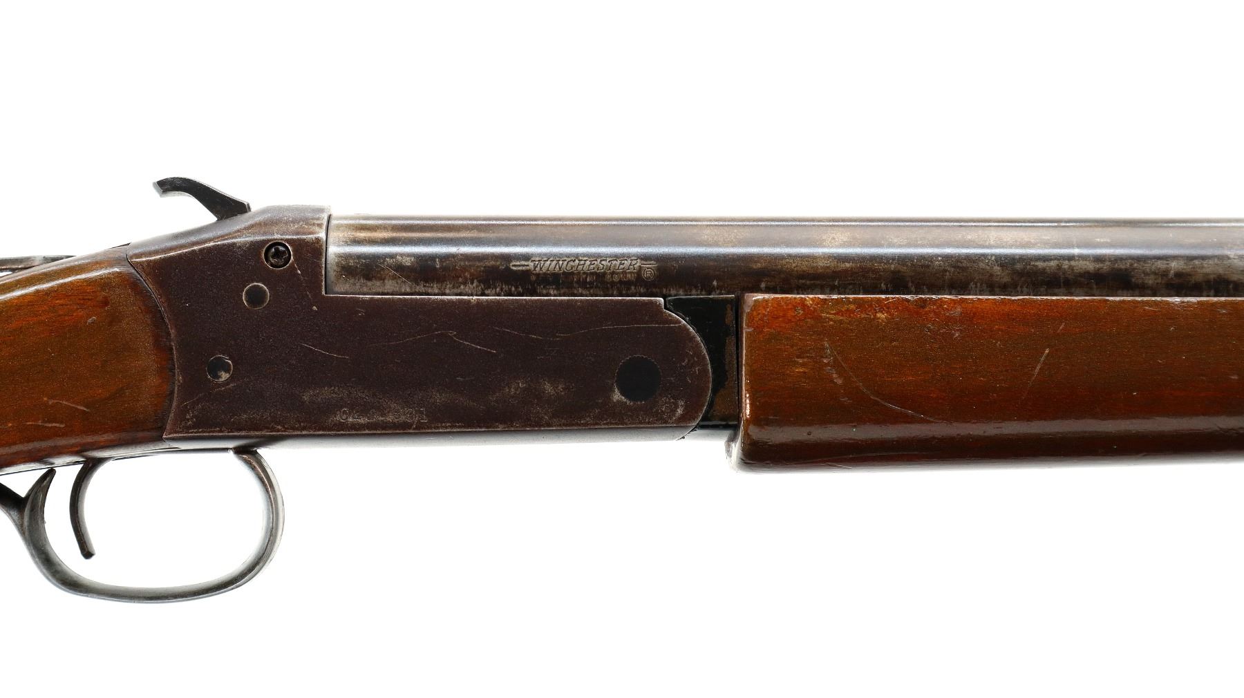 Main Description: Broken bead, round barrel, grooved spur hammer, ejector. Two piece wood stocks, forend is loose, pistol grip, grooved black polymer butt plate.