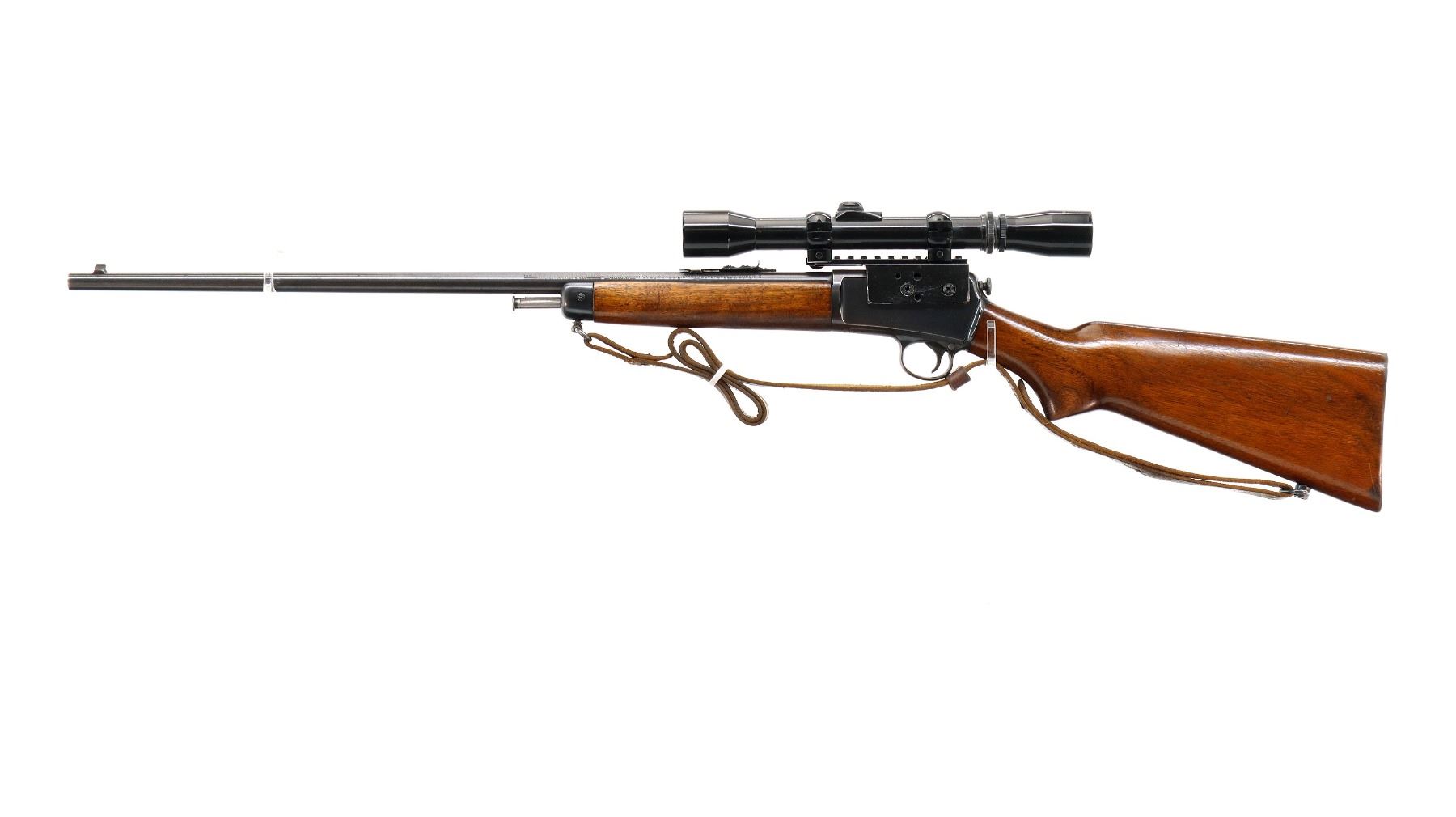 Main Description: Manufactured 1947. Blade front sight, adjustable u notched rear sight, blued finish, receiver drilled and tapped with Mono Scope 3-7x31 installed, clear optics with fine crosshair. Two piece wood stocks, pistol grip, smooth steel butt plate, sling swivels with brown leather sling.