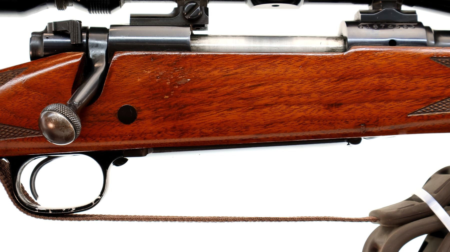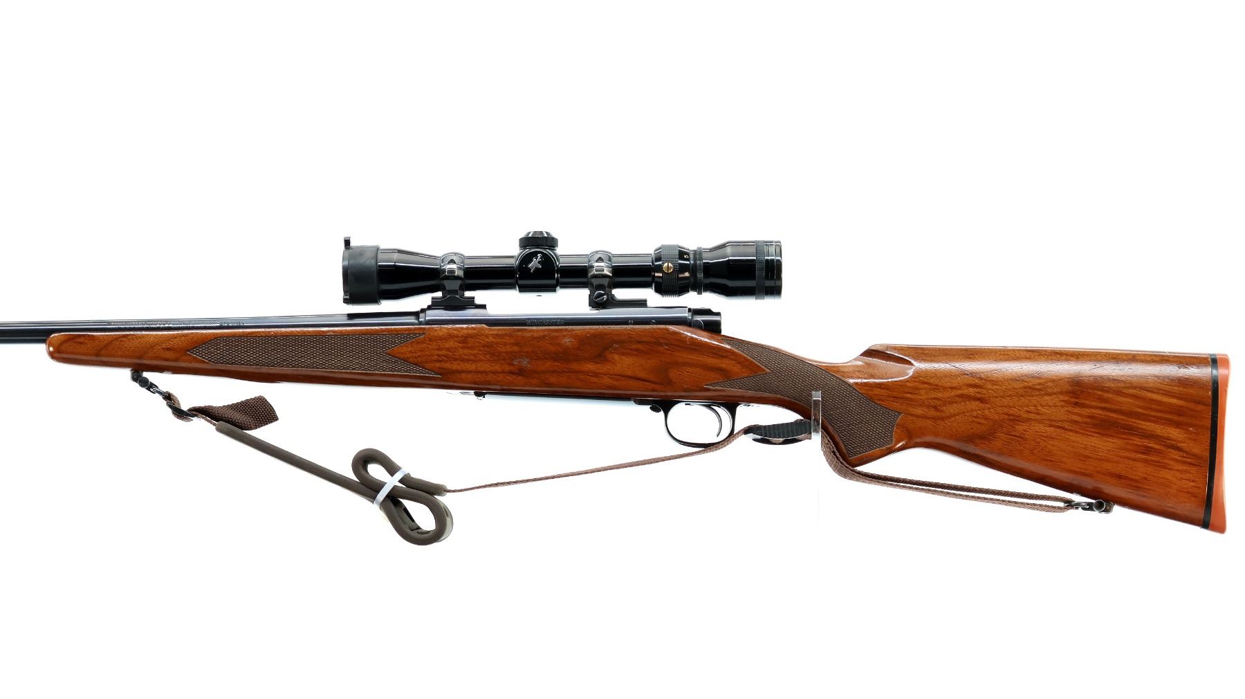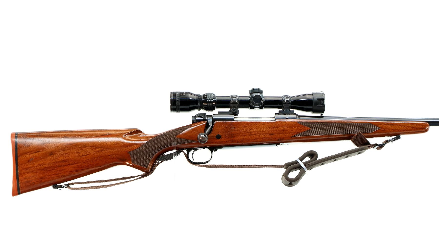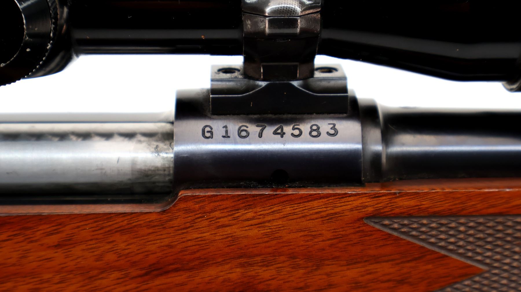 Main Description: No sights, blued finish, receiver drilled and tapped with Tasco 2-7x32 scope installed, clear optics with duplex crosshair. Jeweled push feed bolt with checkered knob. One piece wood stock, checkered forearm and pistol grip, red rubber recoil pad, 13.5" LOP, hinged floor plate, sling swivels with black/brown nylon sling