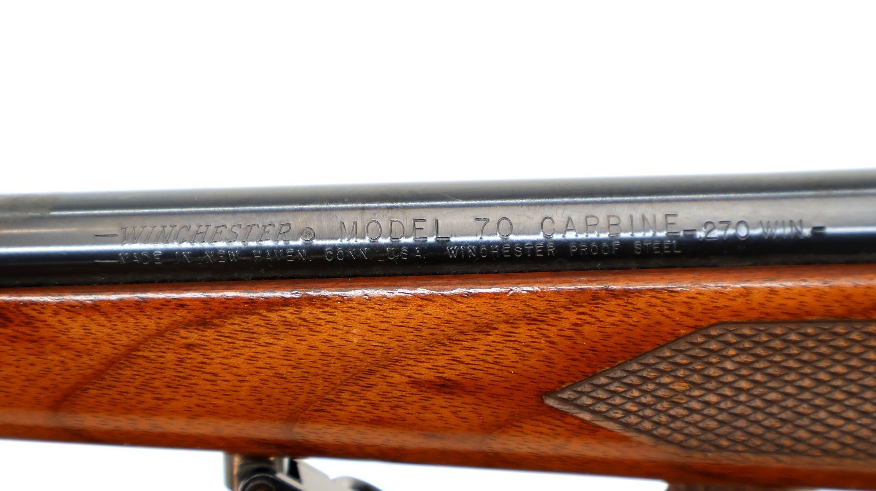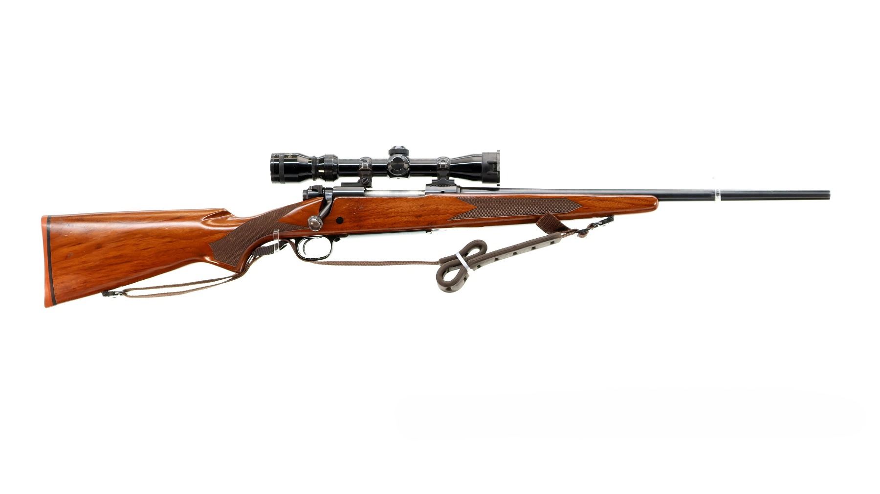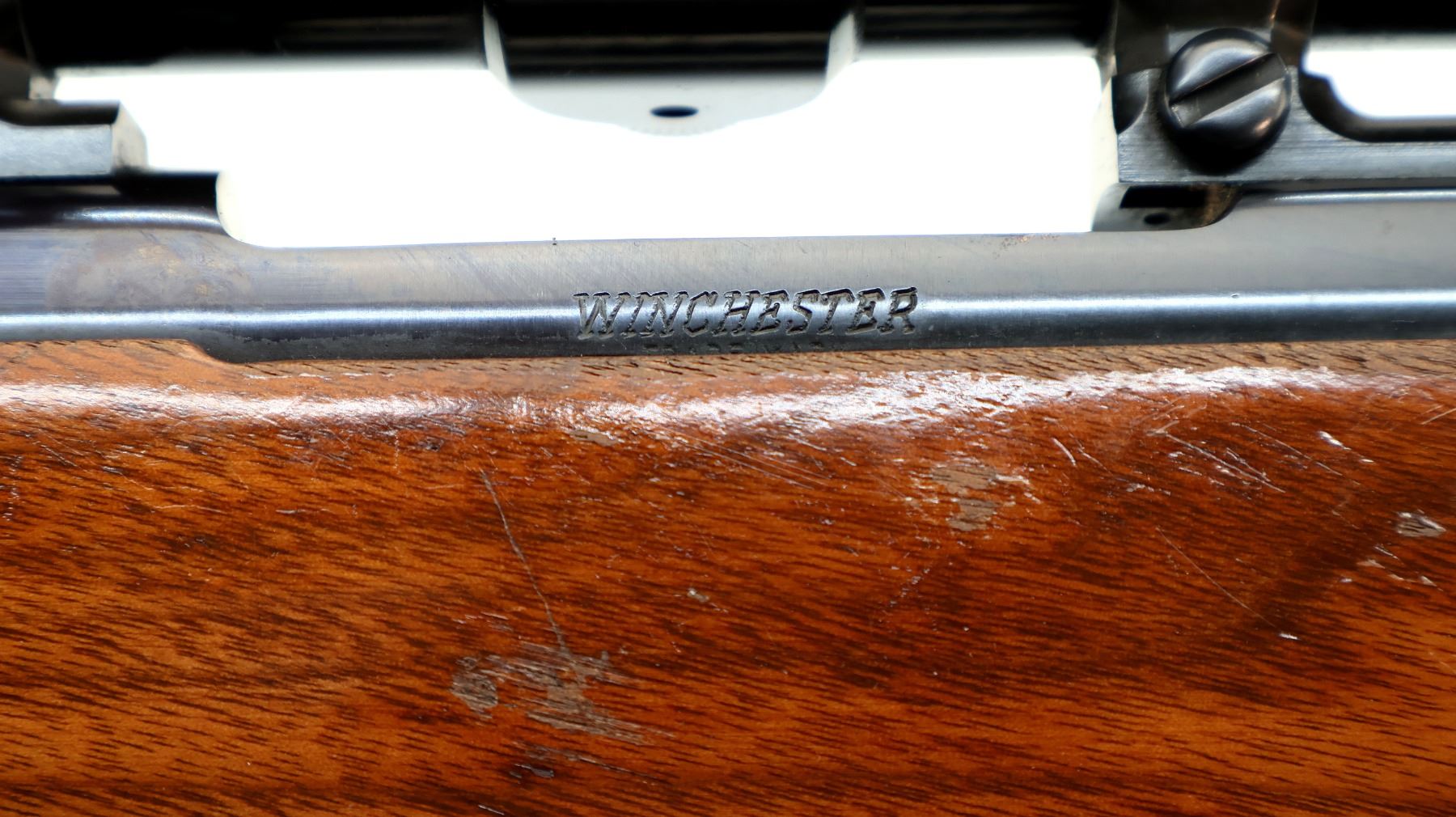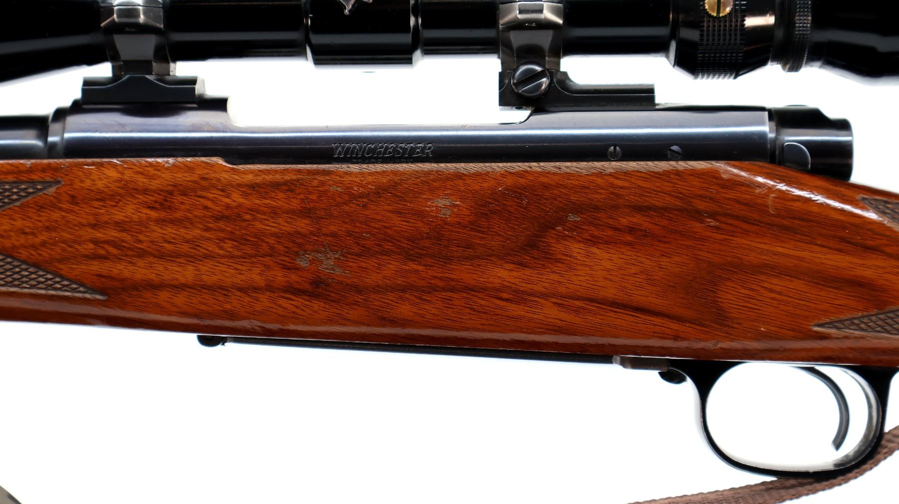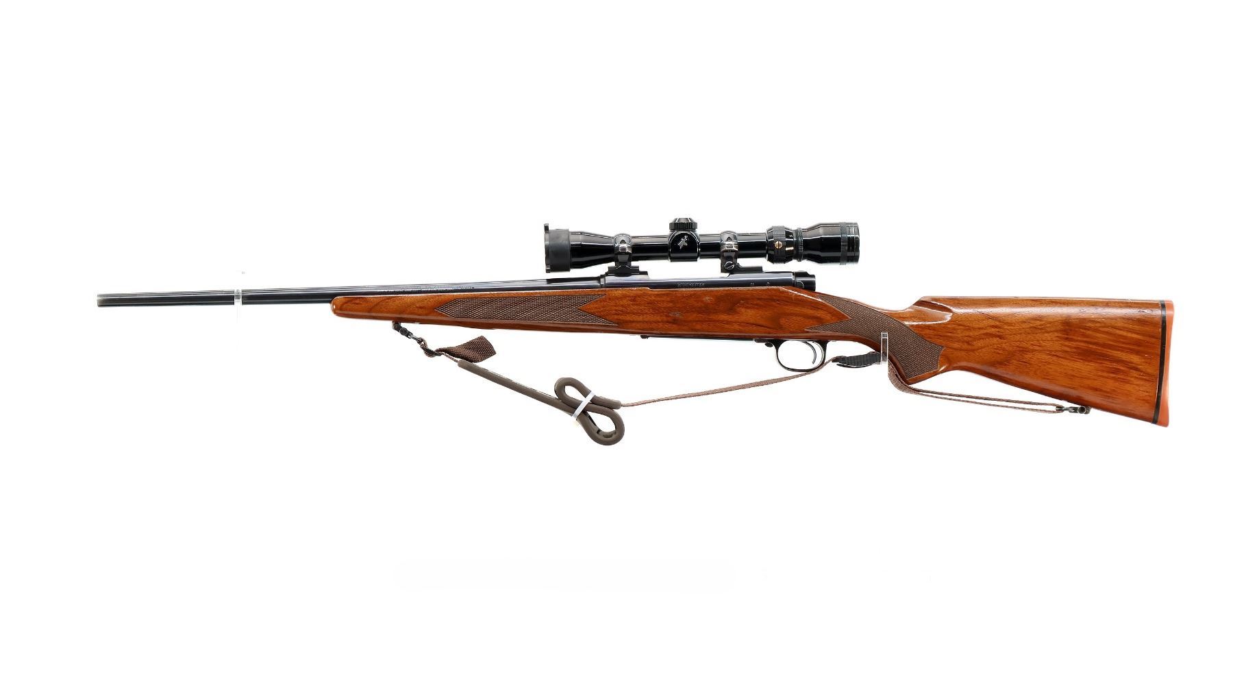 Main Description: No sights, blued finish, receiver drilled and tapped with Tasco 2-7x32 scope installed, clear optics with duplex crosshair. Jeweled push feed bolt with checkered knob. One piece wood stock, checkered forearm and pistol grip, red rubber recoil pad, 13.5" LOP, hinged floor plate, sling swivels with black/brown nylon sling