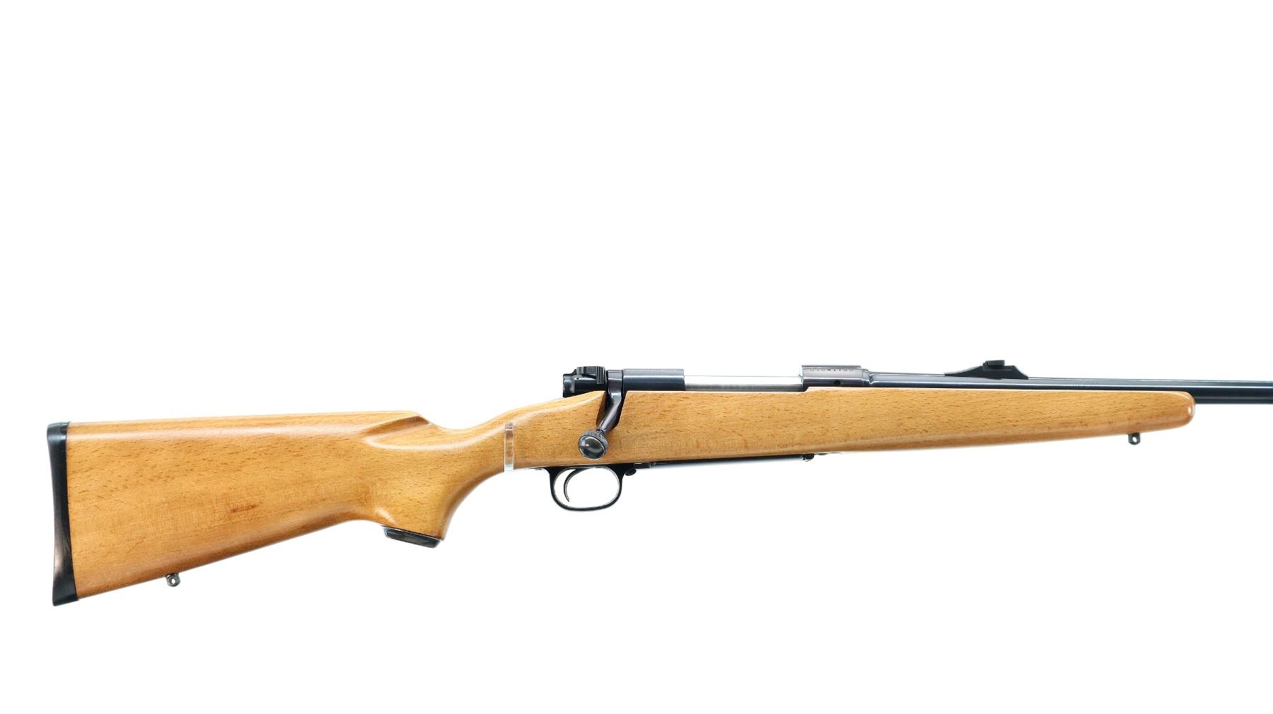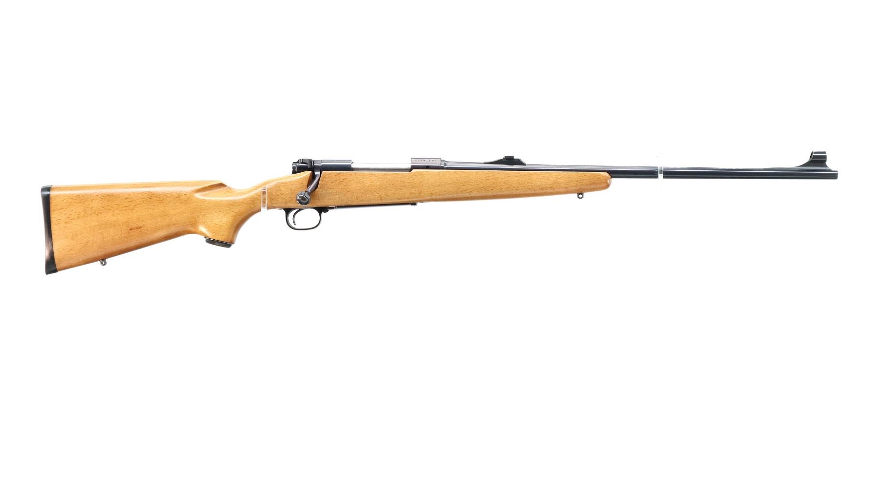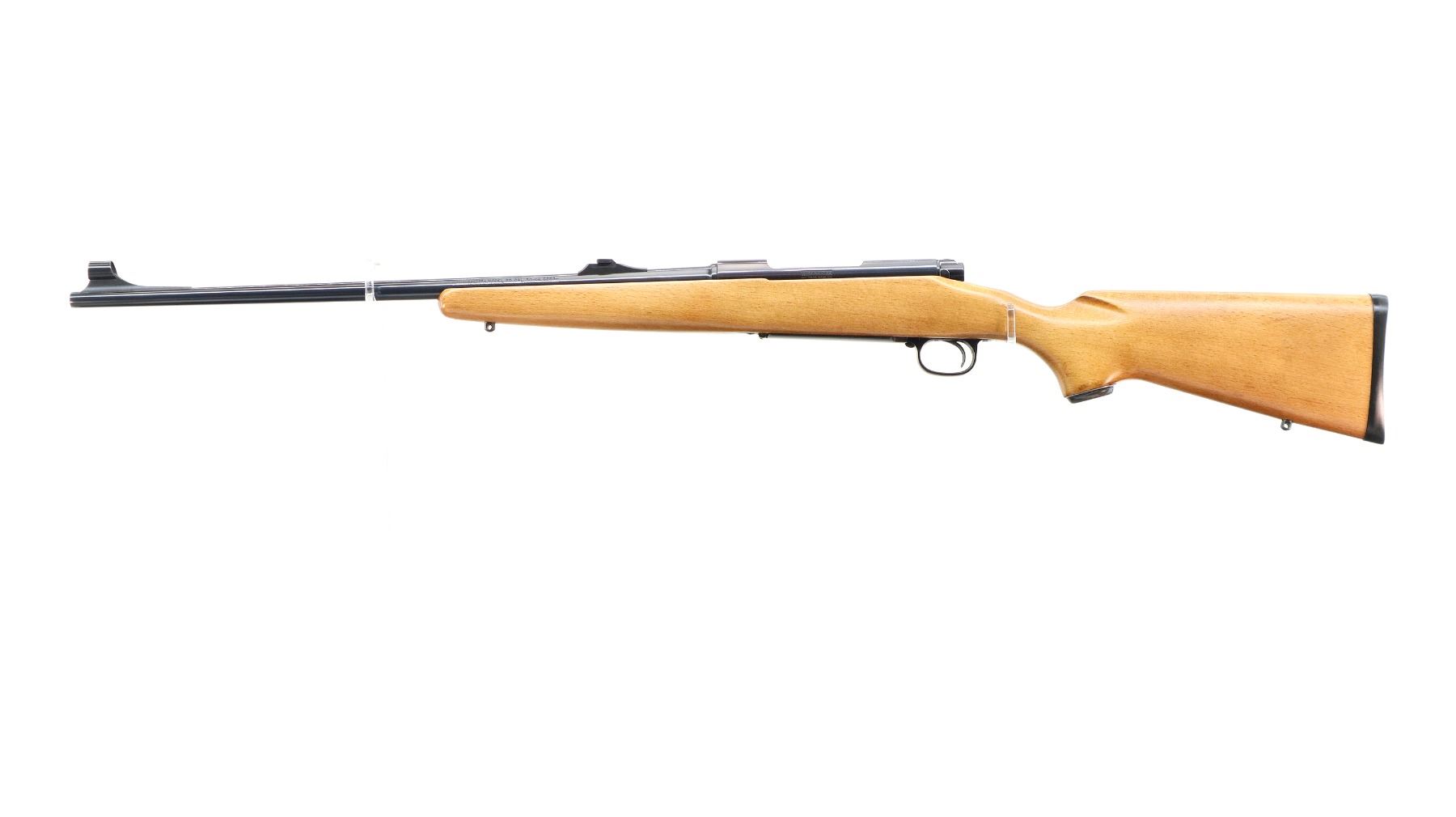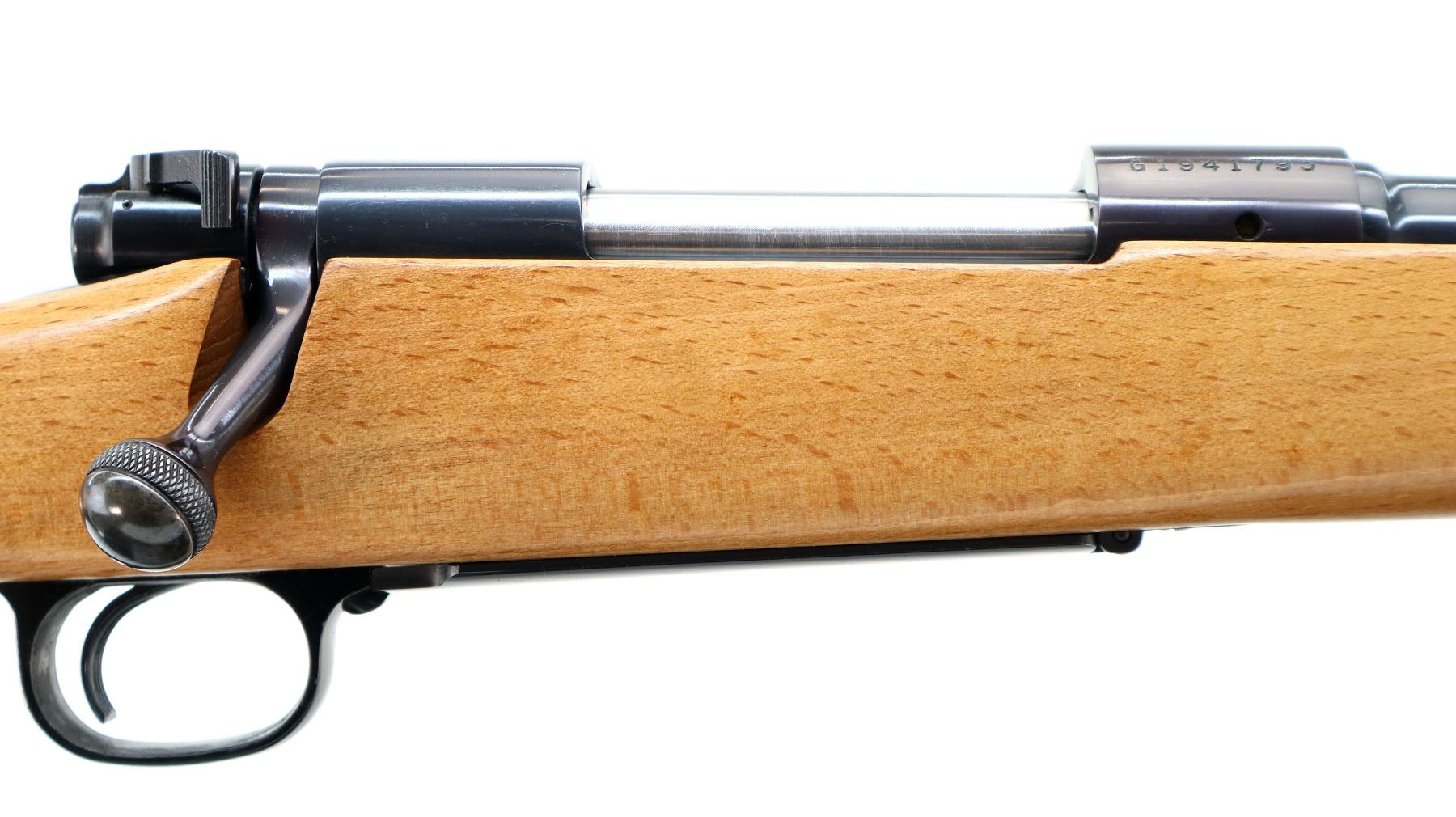 Main Description: Blade front sight with hood and ramp, adjustable folding u notched rear sight with ramp, blued finish, receiver drilled and tapped with plug screws installed, checkered bolt knob. One piece wood stock, pistol grip, black rubber recoil pad, 13.75" LOP, steel grip cap, hinged floor plate, swivel studs.