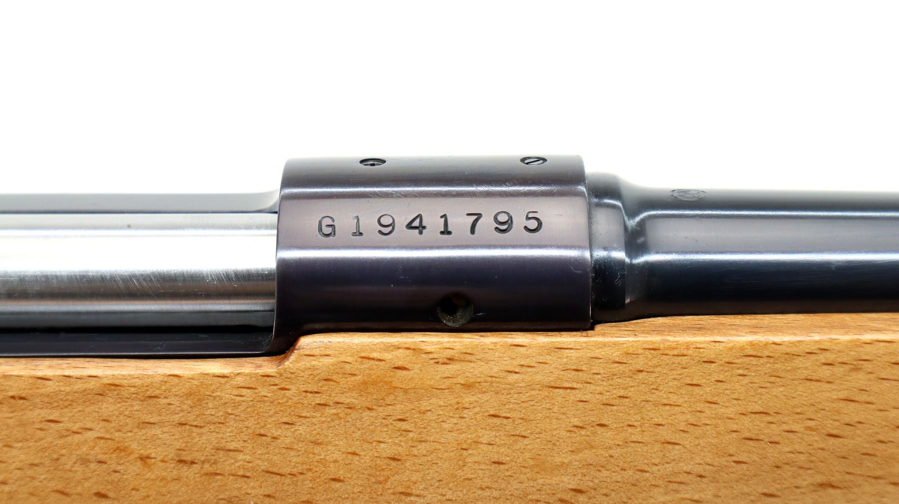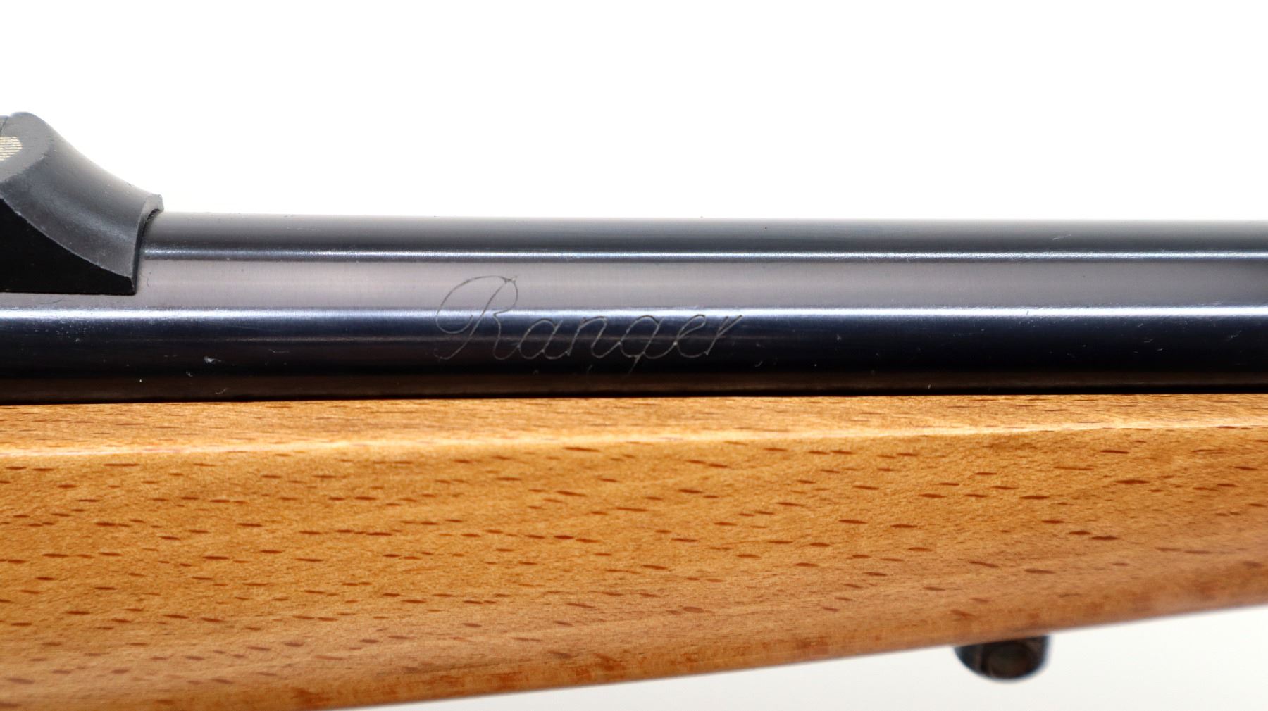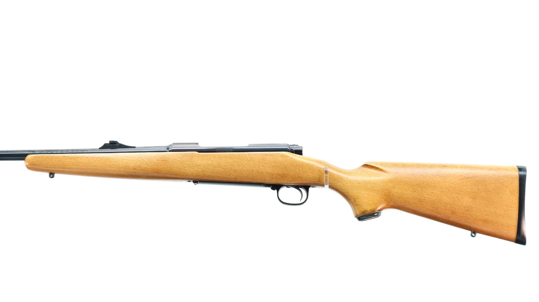 Main Description: Blade front sight with hood and ramp, adjustable folding u notched rear sight with ramp, blued finish, receiver drilled and tapped with plug screws installed, checkered bolt knob. One piece wood stock, pistol grip, black rubber recoil pad, 13.75" LOP, steel grip cap, hinged floor plate, swivel studs.