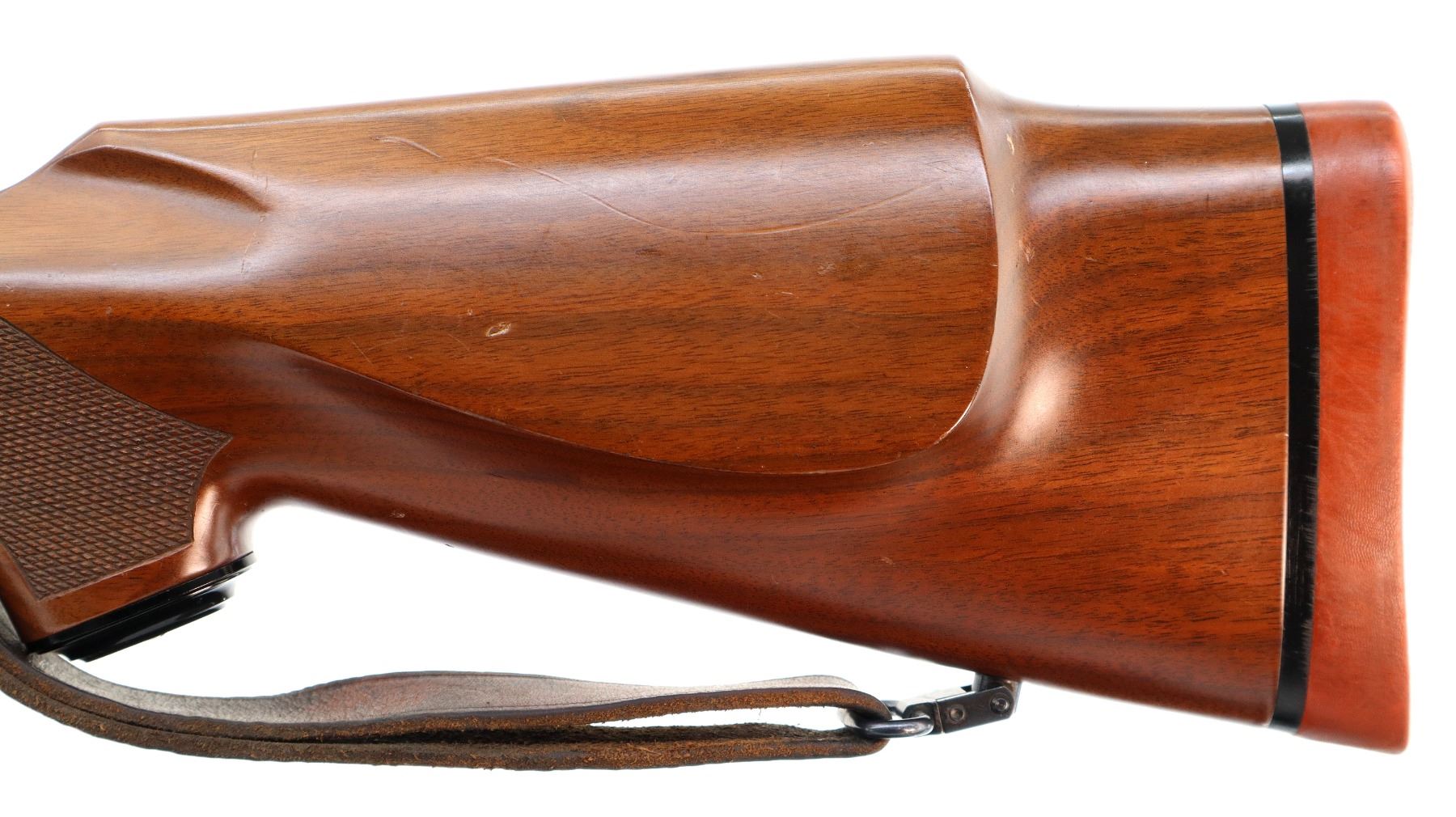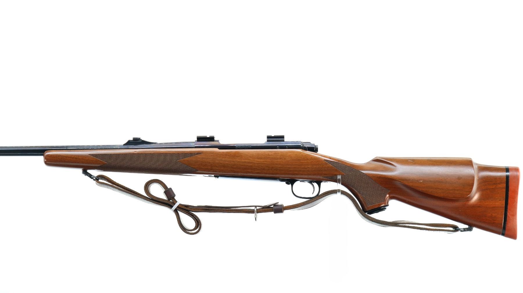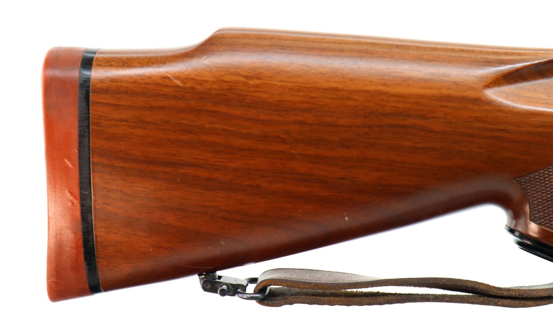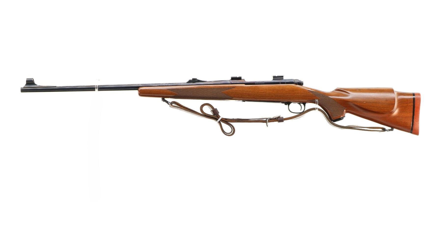 Main Description: Blade front sight with hood and ramp, adjustable folding u notched rear sight, polish blued finish, receiver drilled and tapped with two piece scope bases installed, jeweled push feed bolt with checkered knob. One piece satin finish wood stock, checkered forearm and pistol grip, cheek rest, red rubber recoil pad, 13.5" LOP, grip cap, hinged floor plate, sling swivels with brown leather sling.