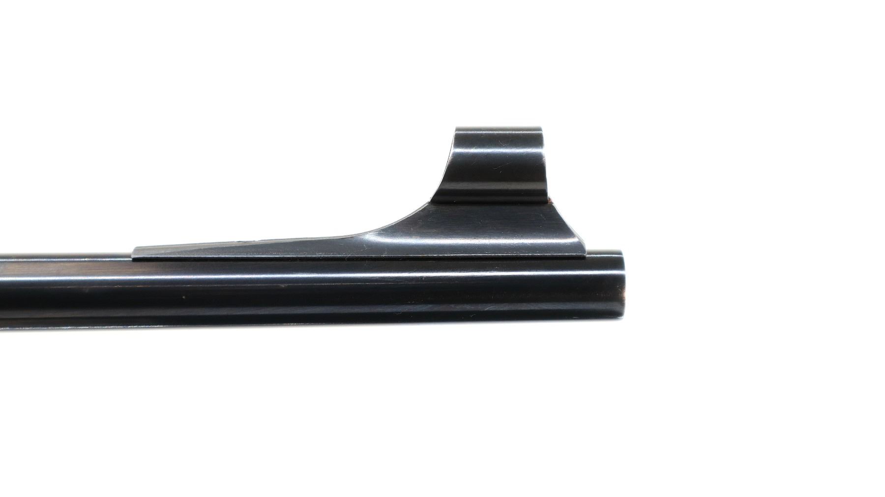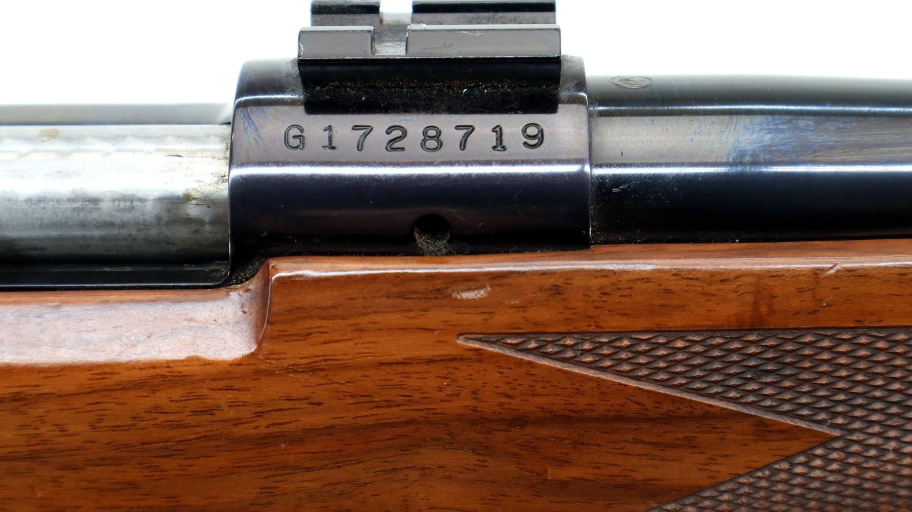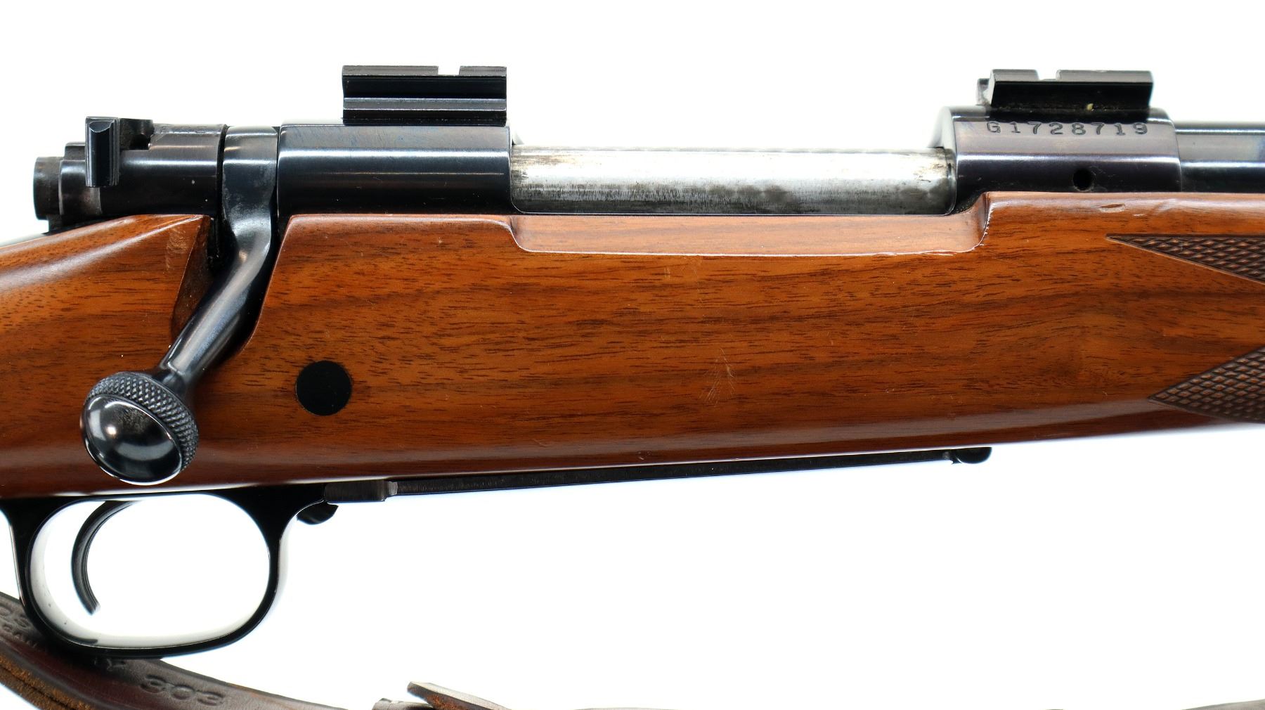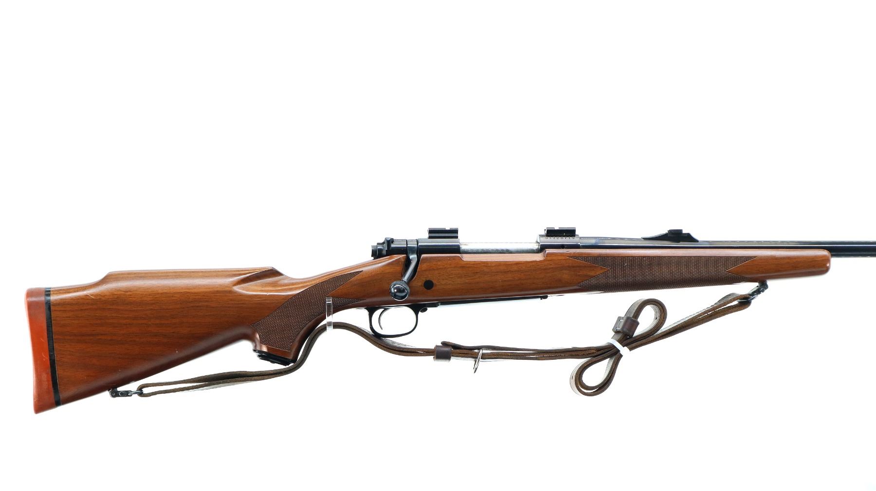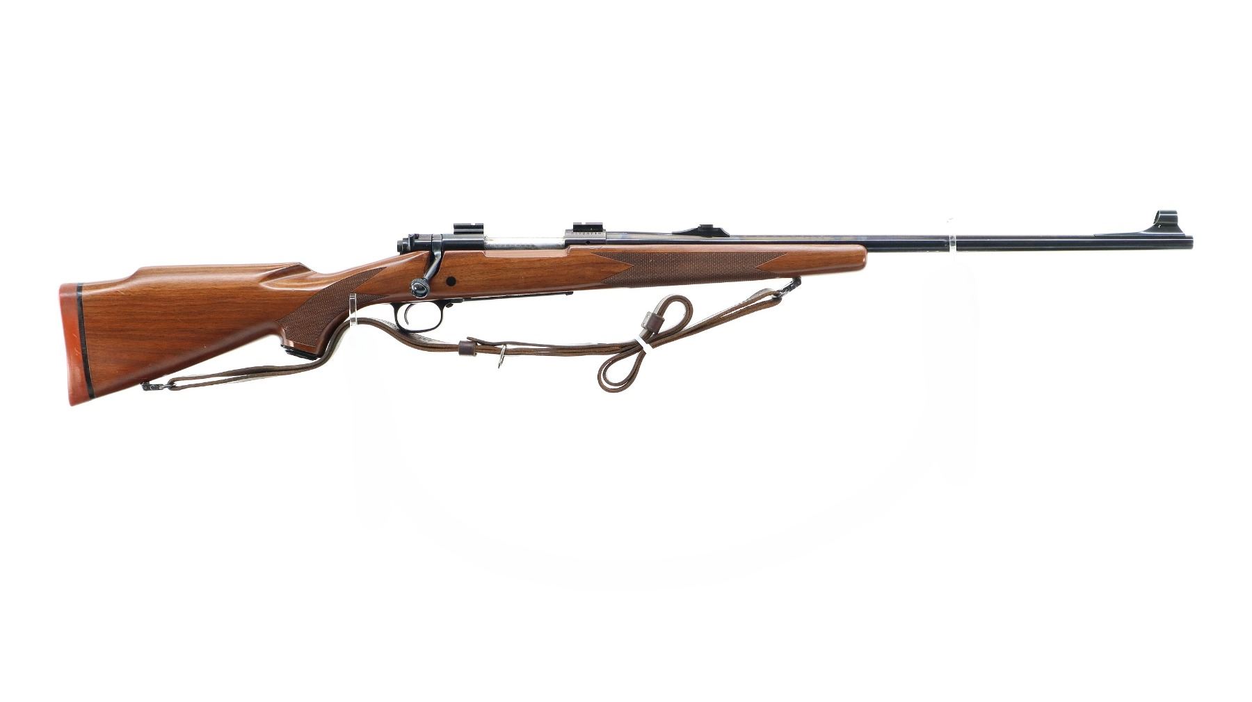 Main Description: Blade front sight with hood and ramp, adjustable folding u notched rear sight, polish blued finish, receiver drilled and tapped with two piece scope bases installed, jeweled push feed bolt with checkered knob. One piece satin finish wood stock, checkered forearm and pistol grip, cheek rest, red rubber recoil pad, 13.5" LOP, grip cap, hinged floor plate, sling swivels with brown leather sling.