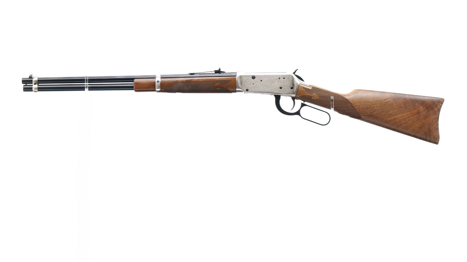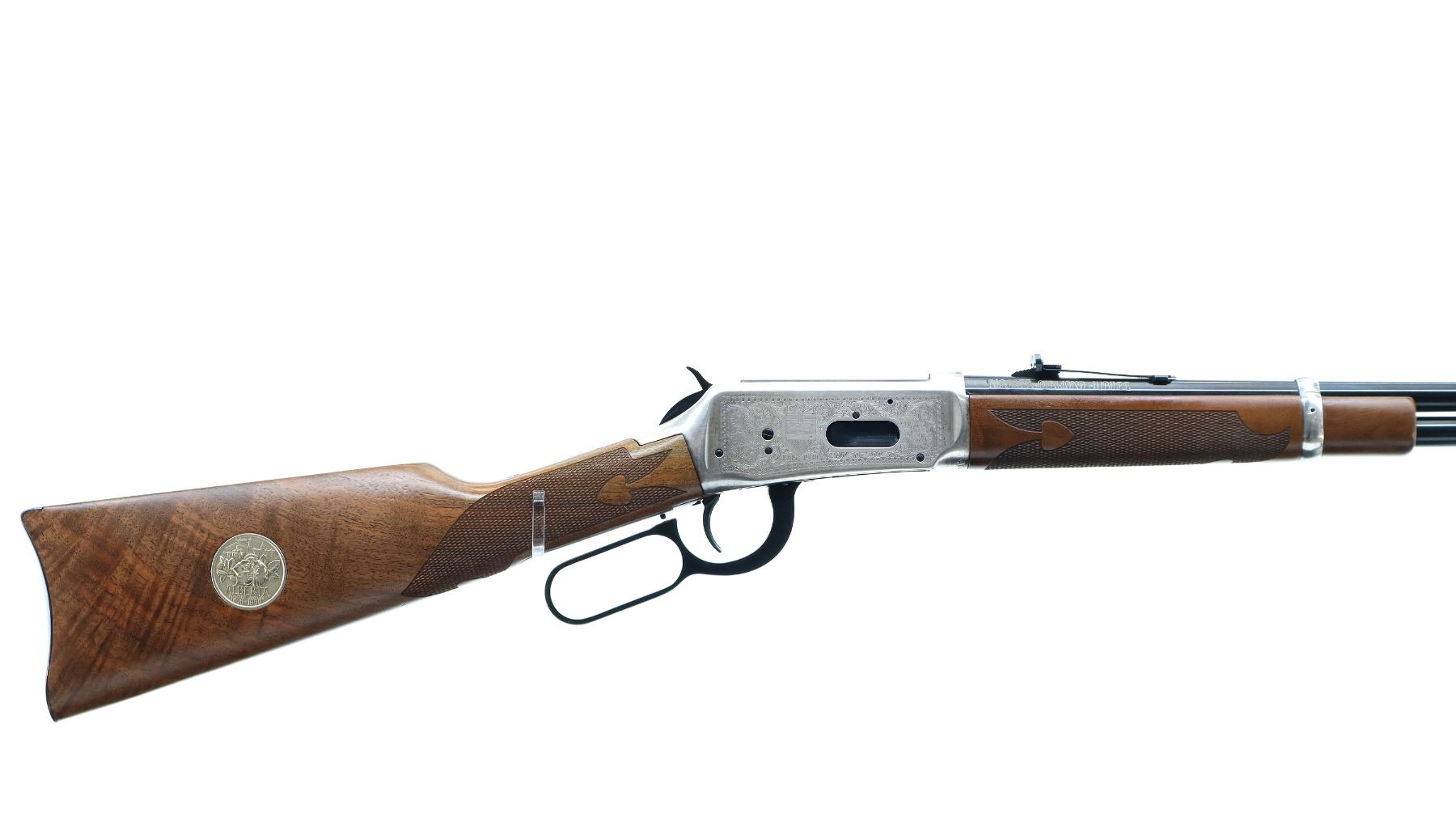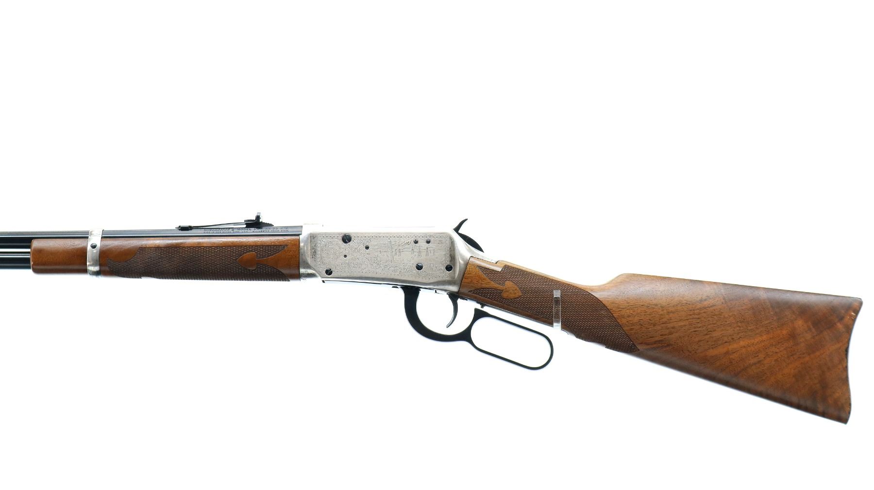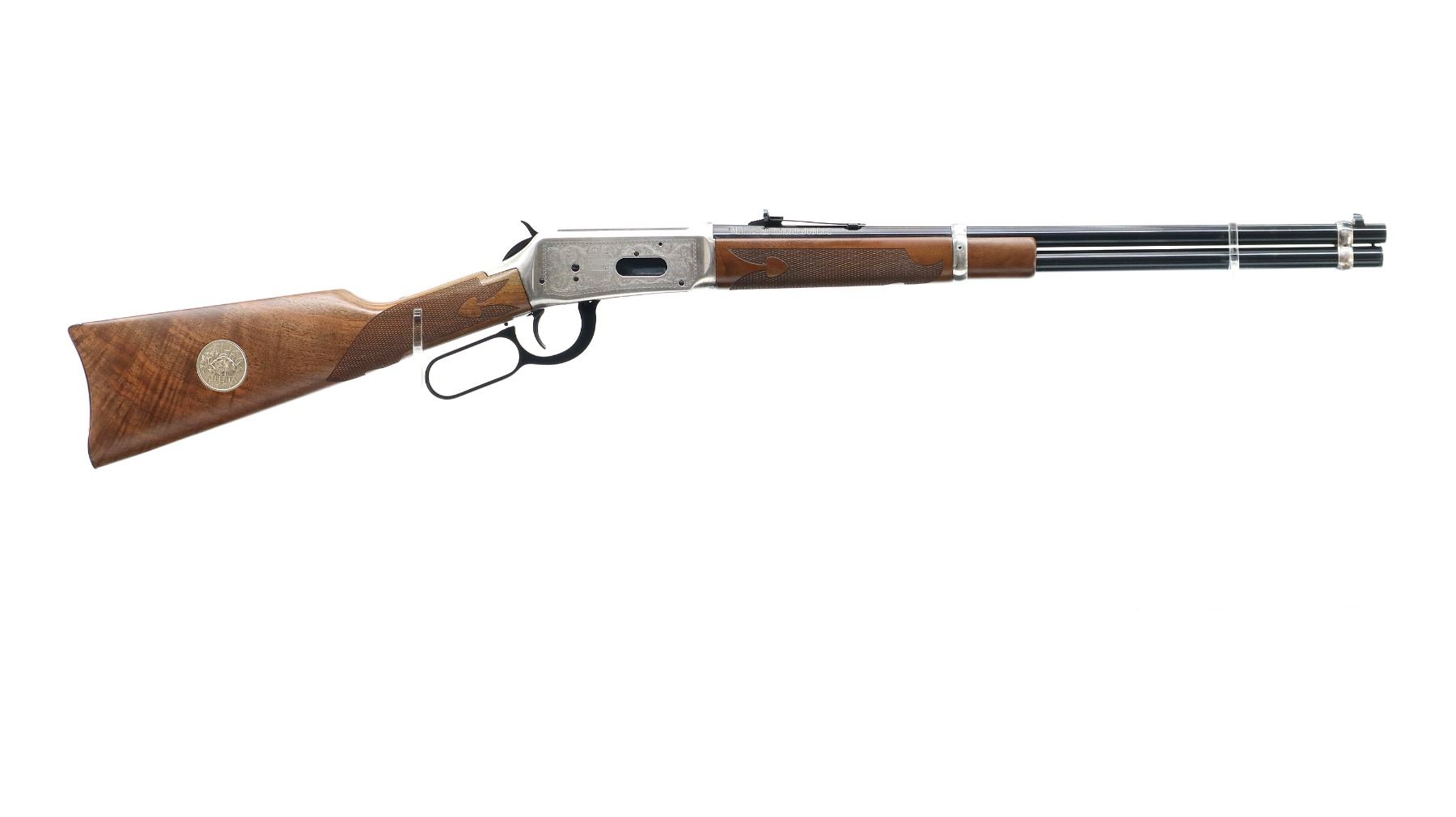 Main Description: Blade front sight, adjustable u notched rear sight, polish blued barrel, bolt, lever and full length magtube, engraved silver receiver. Two piece wood stocks, checkered forearm and straight grip, smooth curved steel butt plate which has some rust around the edges, medallion in right side of stock, 2 silver barrel bands.