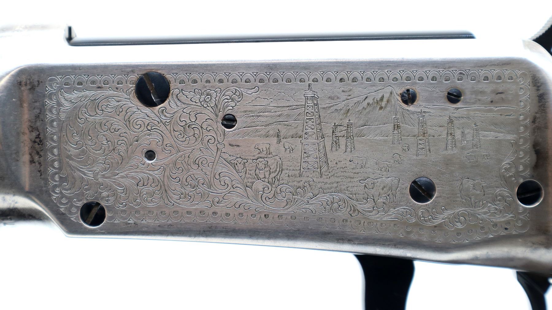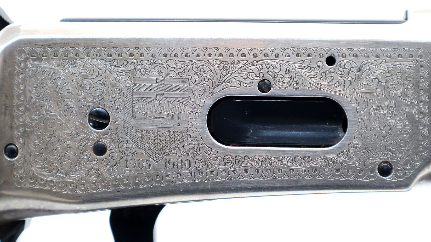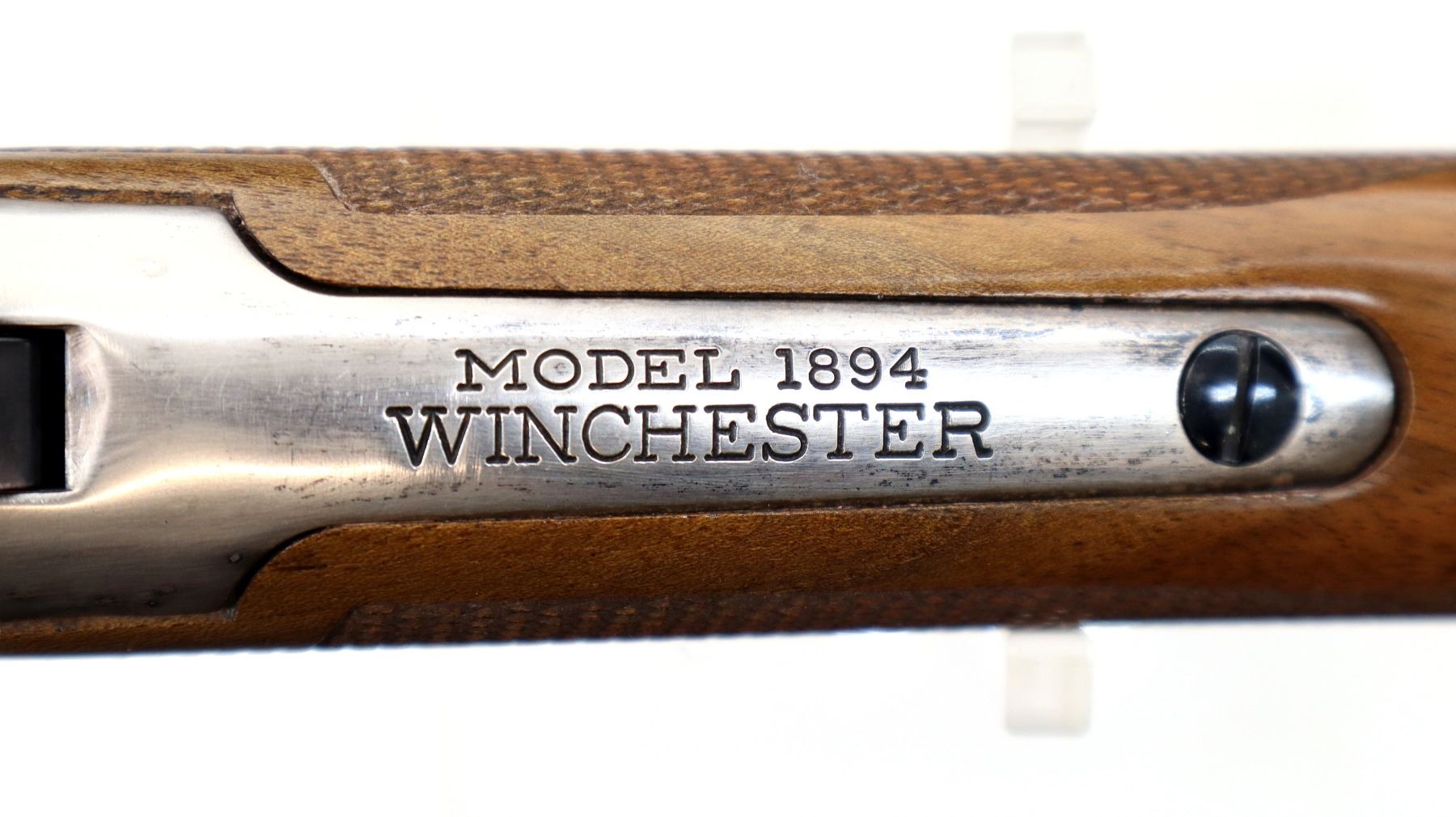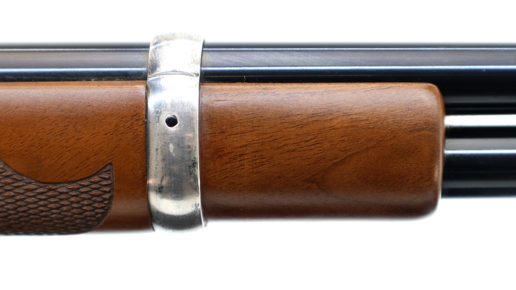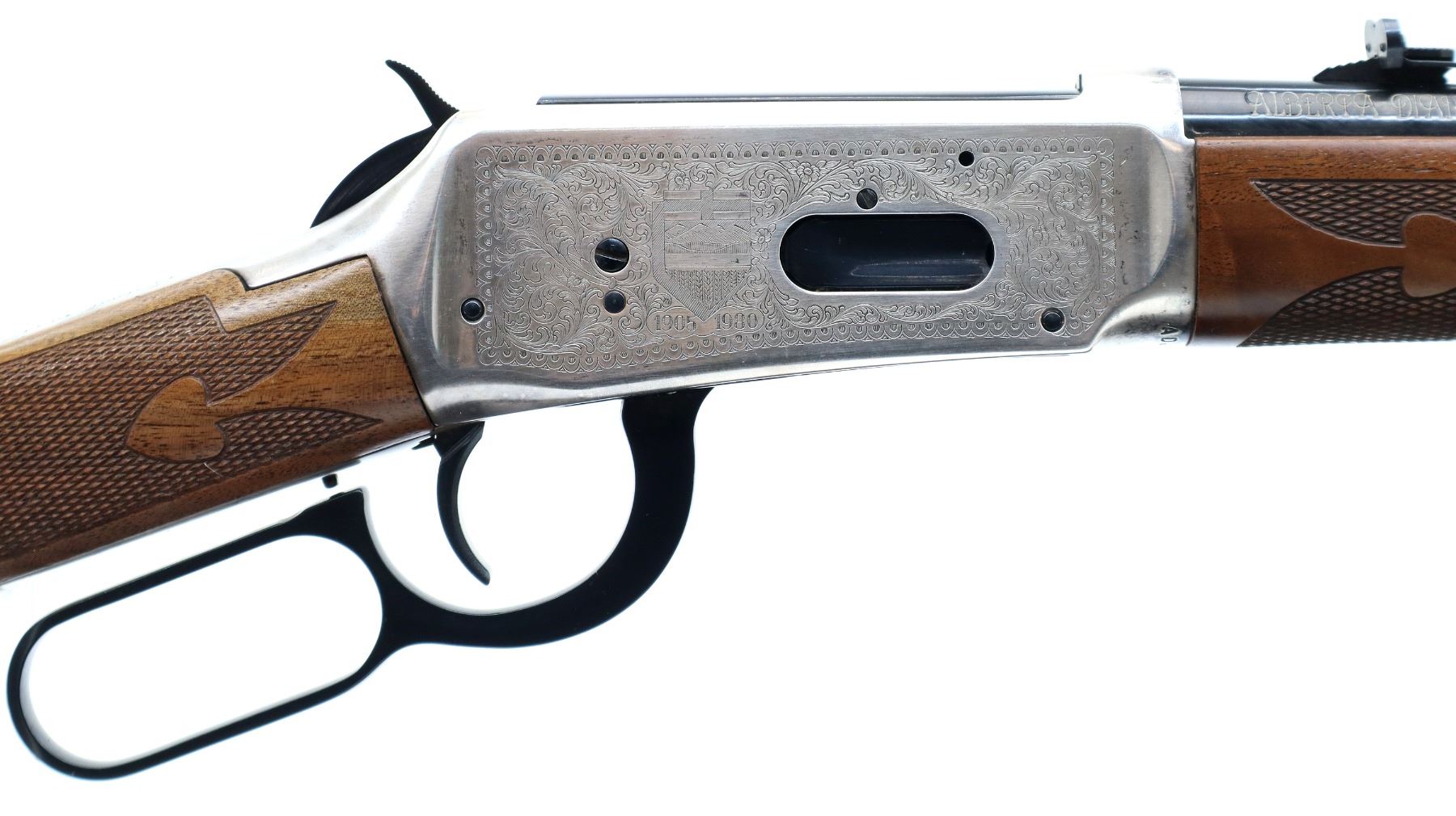 Main Description: Blade front sight, adjustable u notched rear sight, polish blued barrel, bolt, lever and full length magtube, engraved silver receiver. Two piece wood stocks, checkered forearm and straight grip, smooth curved steel butt plate which has some rust around the edges, medallion in right side of stock, 2 silver barrel bands.