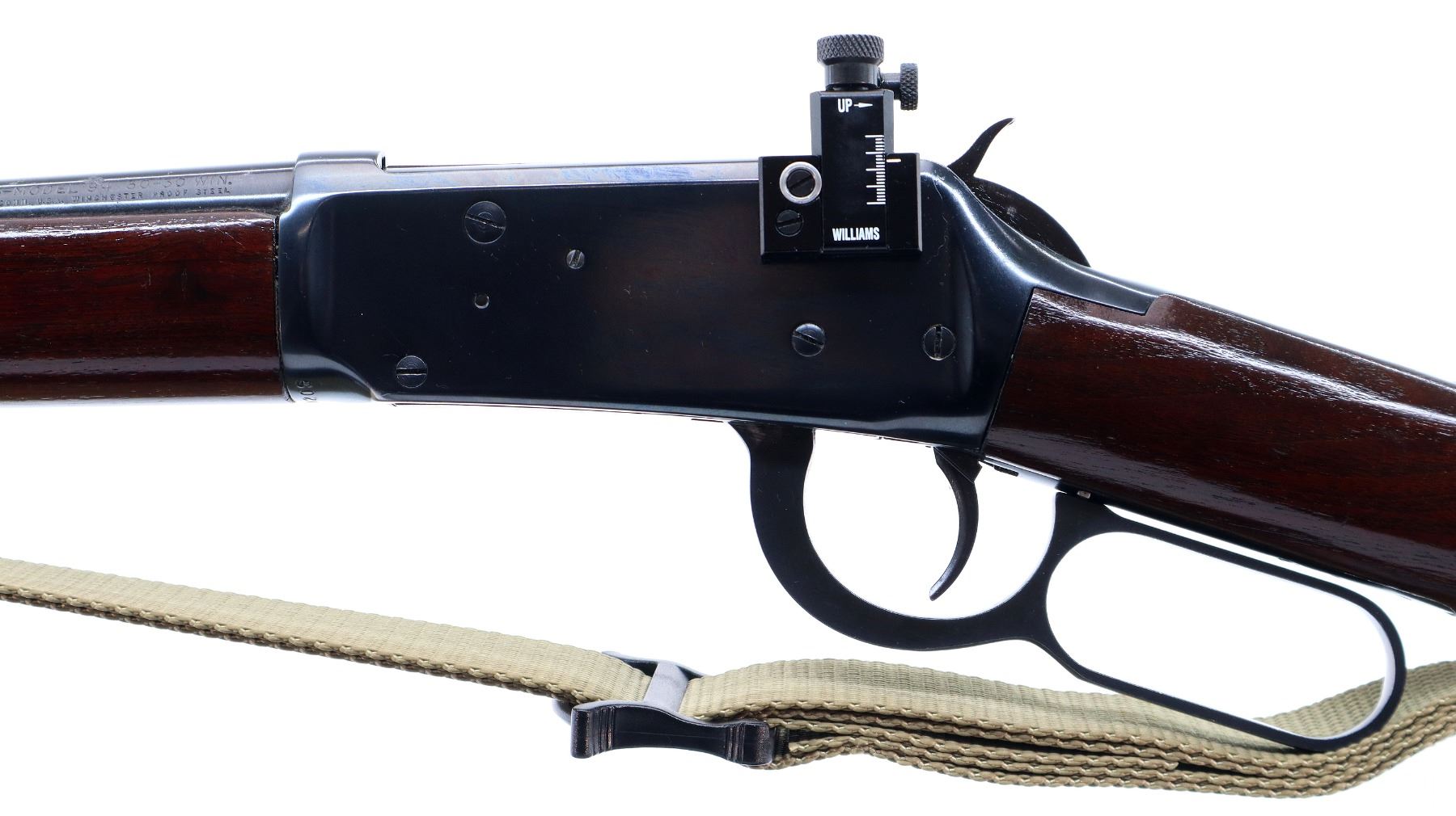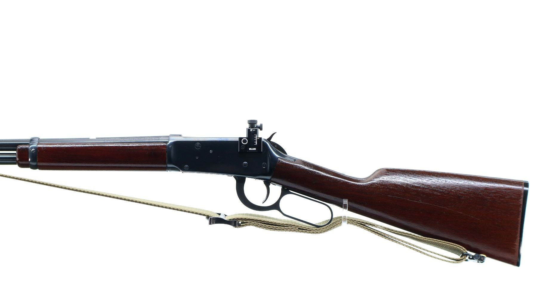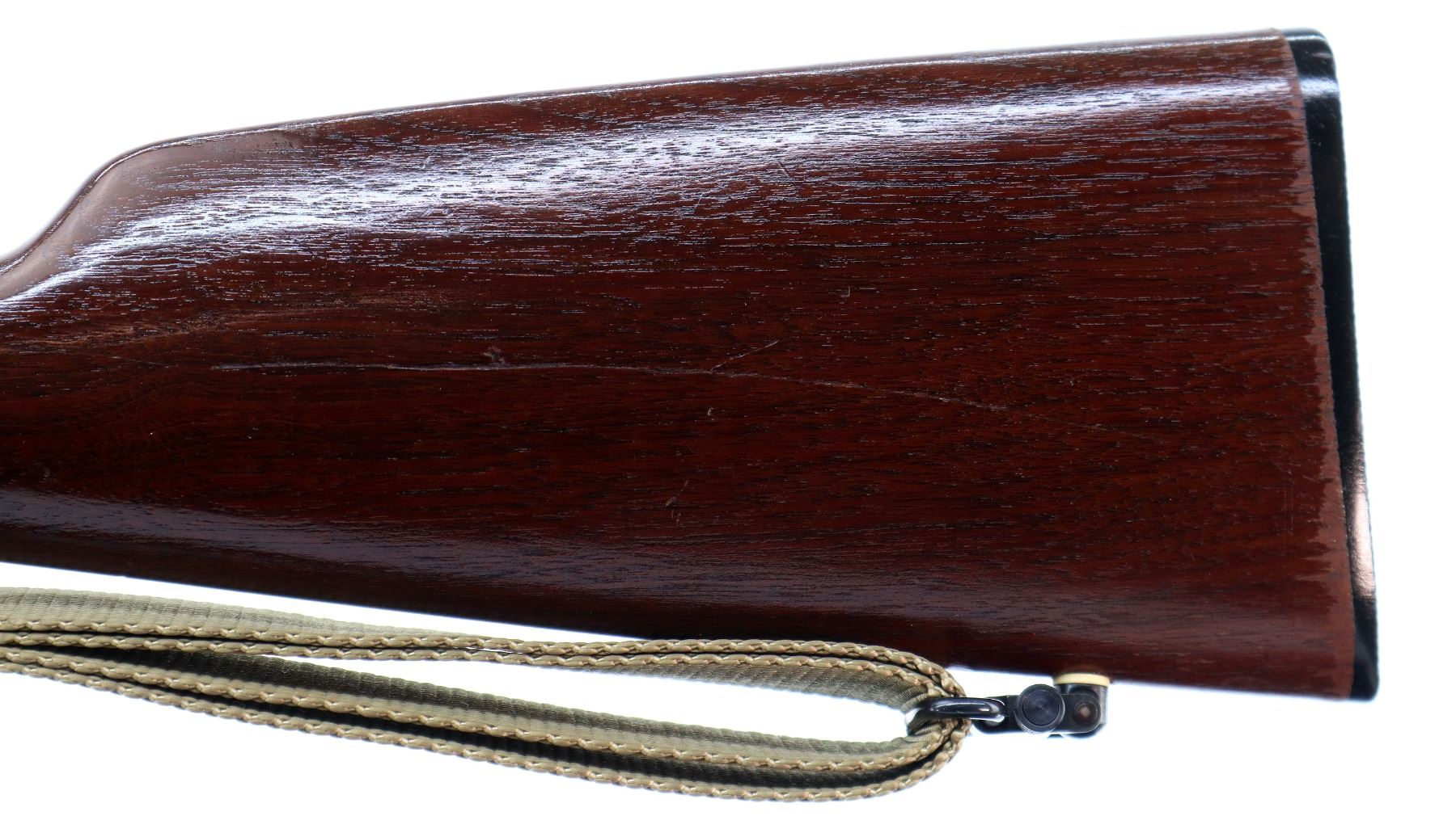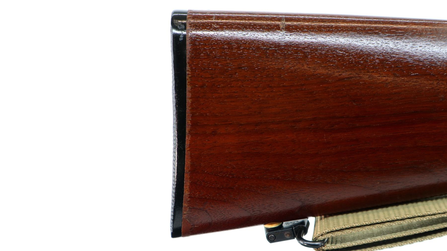 Main Description: Manufactured 1975. Red fiber optic blade front sight with ramp, missing rear sight dovetail present, receiver drilled and tapped with adjustable Williams peep sight installed, blued finish, grooved spur hammer. Two piece wood stocks, straight grip, checkered black polymer butt plate, sling swivels with tan nylon sling.