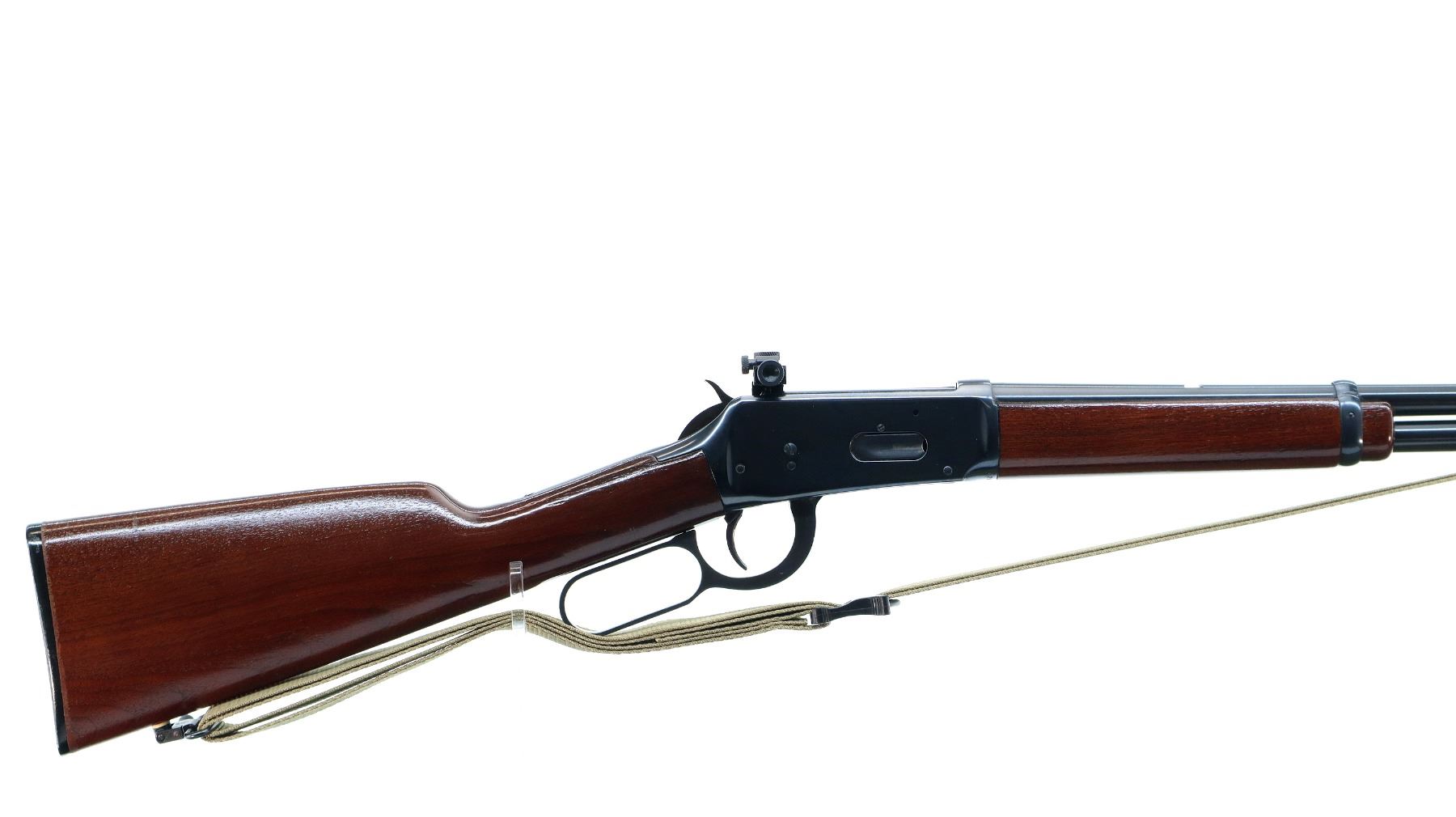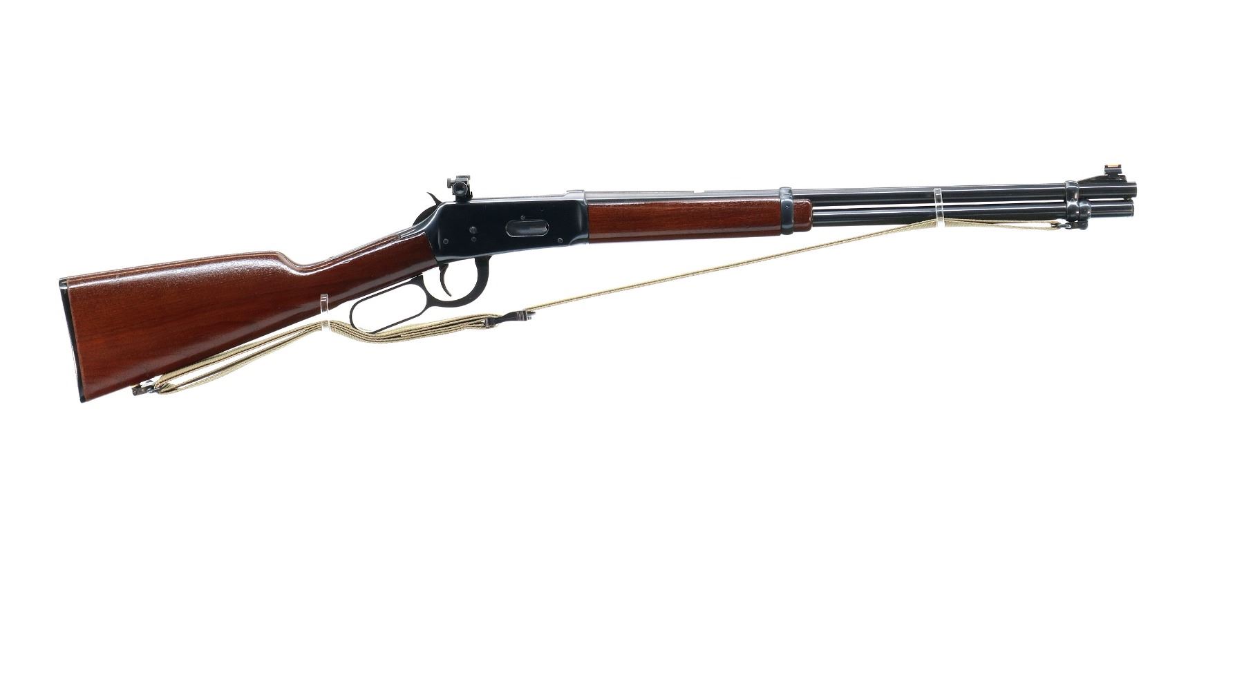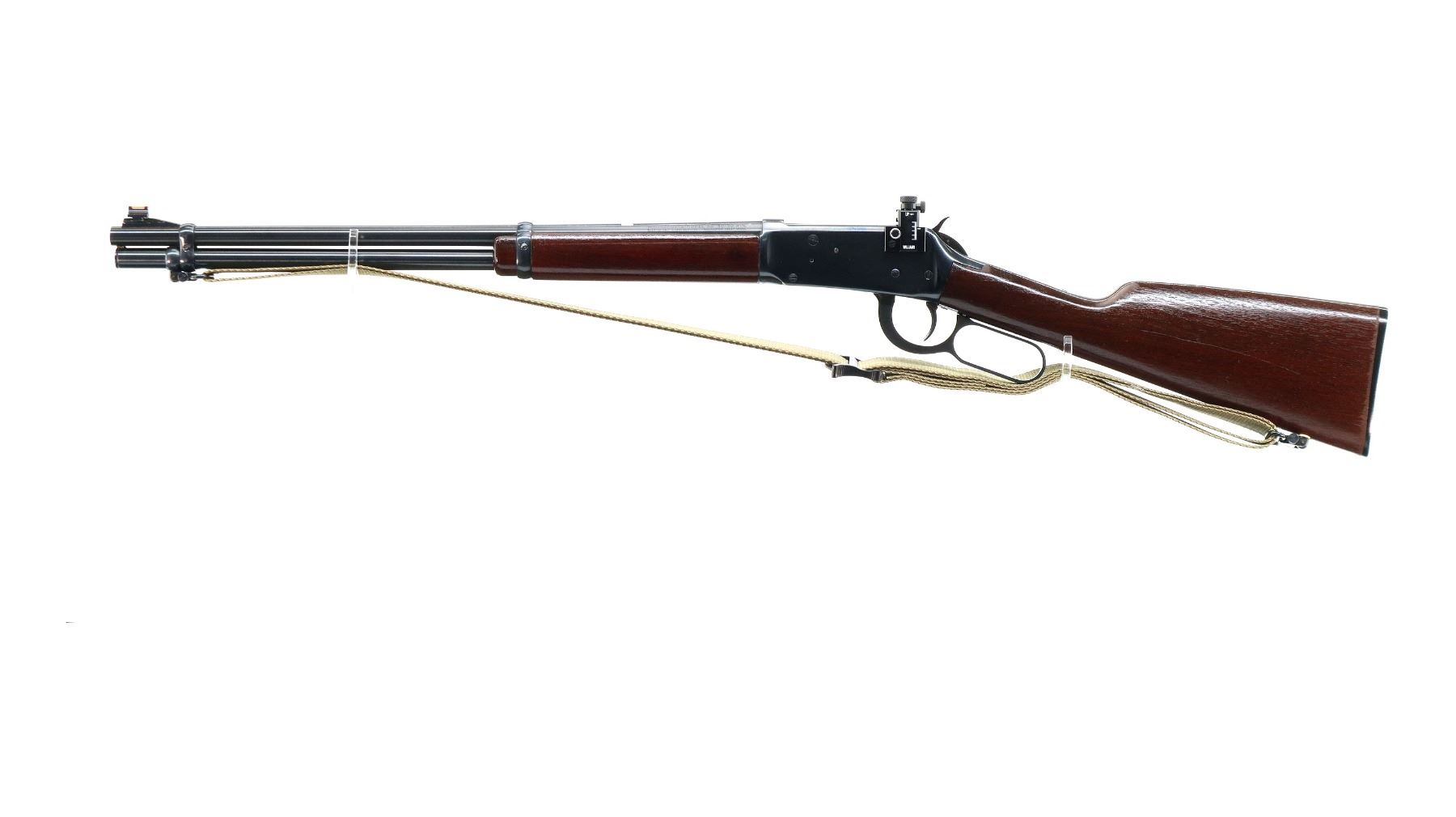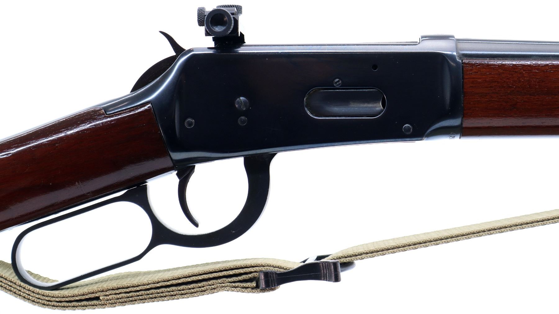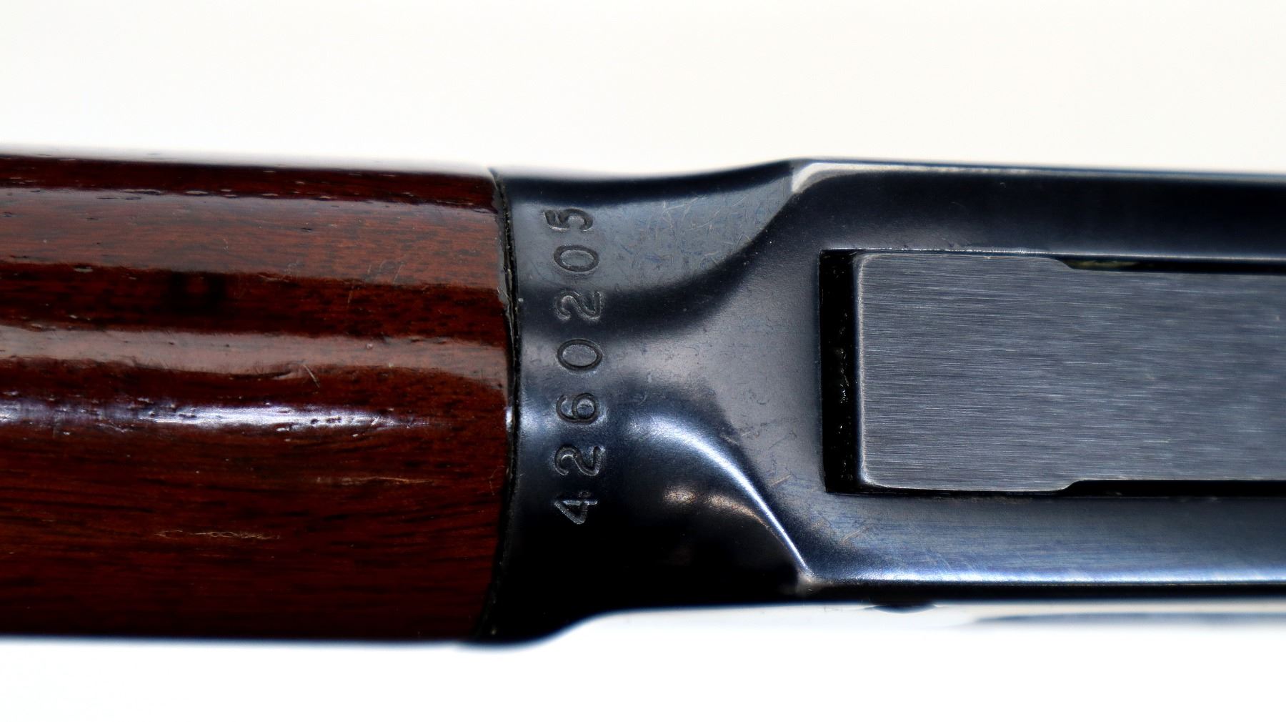 Main Description: Manufactured 1975. Red fiber optic blade front sight with ramp, missing rear sight dovetail present, receiver drilled and tapped with adjustable Williams peep sight installed, blued finish, grooved spur hammer. Two piece wood stocks, straight grip, checkered black polymer butt plate, sling swivels with tan nylon sling.