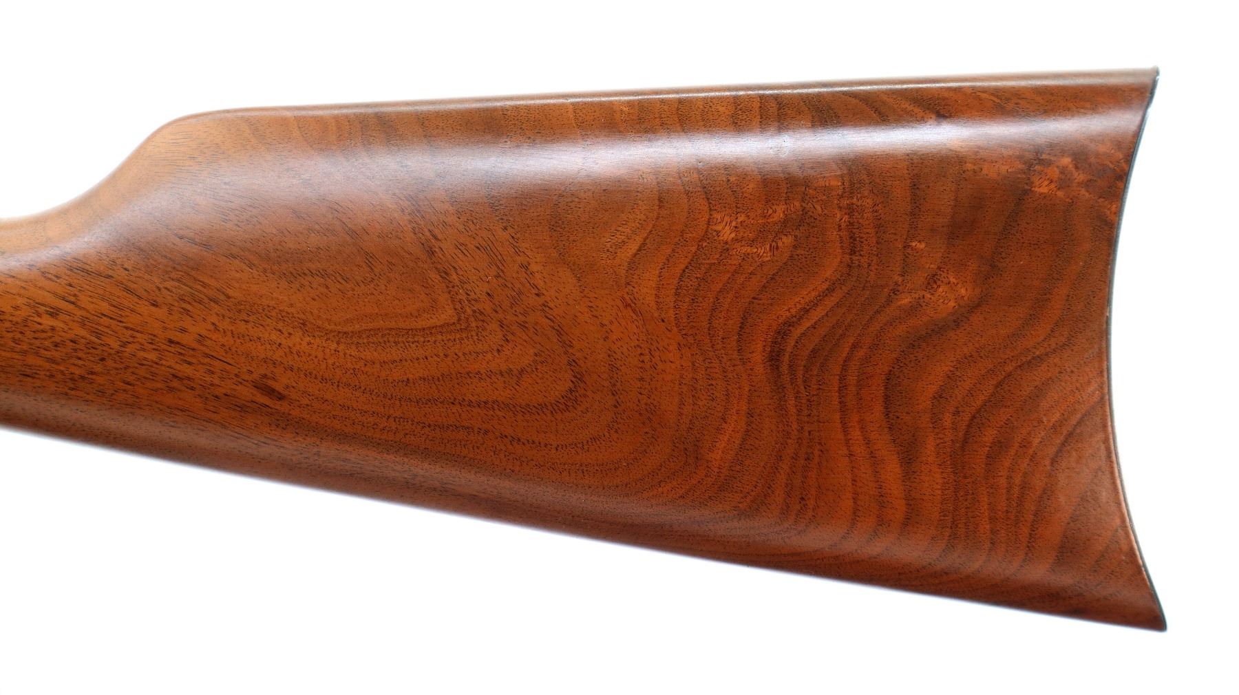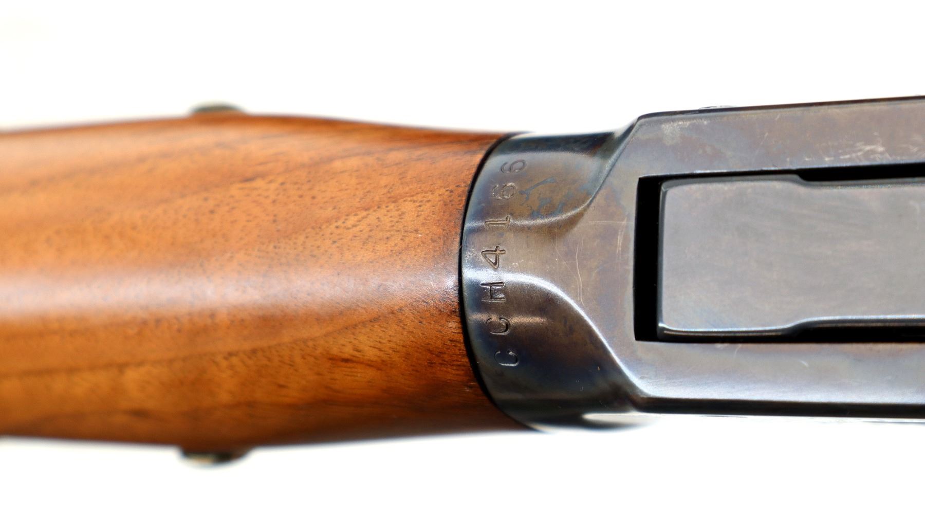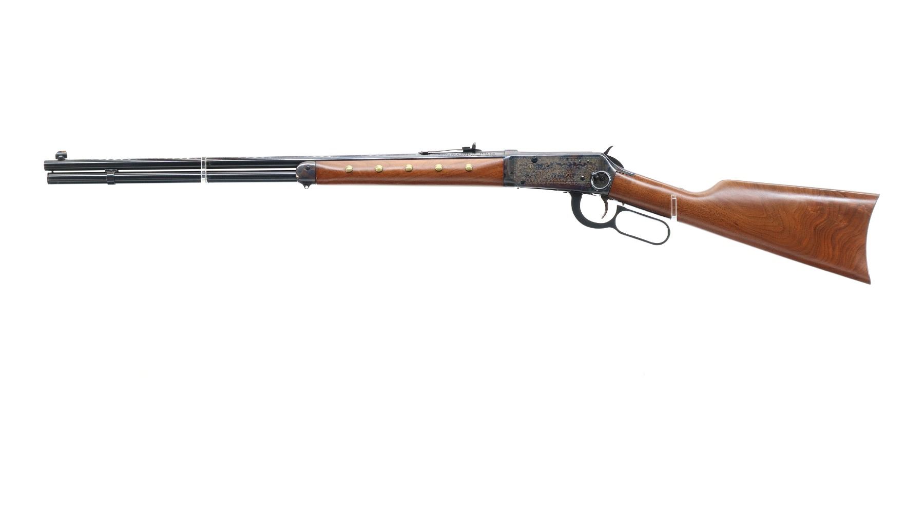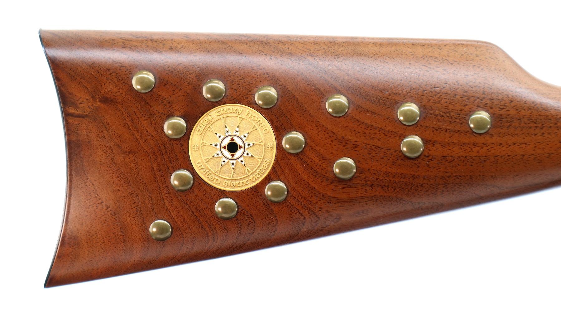 Main Description: Blade front sight with ramp, adjustable u notched rear sight, polish blued tapered round barrel, bolt, lever and full length magtube. Engraved colour case hardened receiver, grooved spur hammer, saddle ring and stud. Two piece wood stocks, 8 brass tacks in forearm, straight grip, smooth curved steel butt plate, medallion and brass tacks on right side of stock, colour case hardened nose cap.
