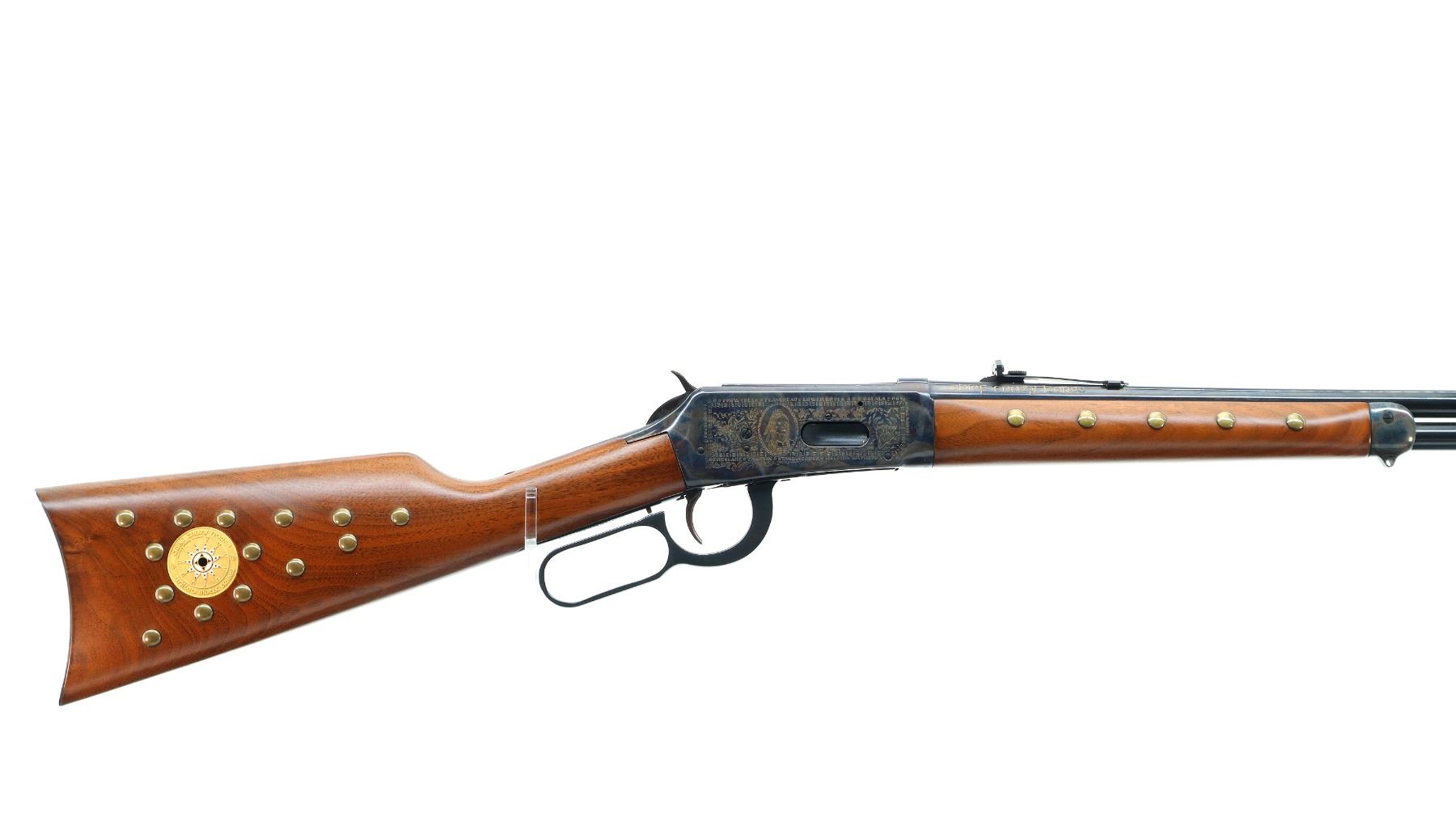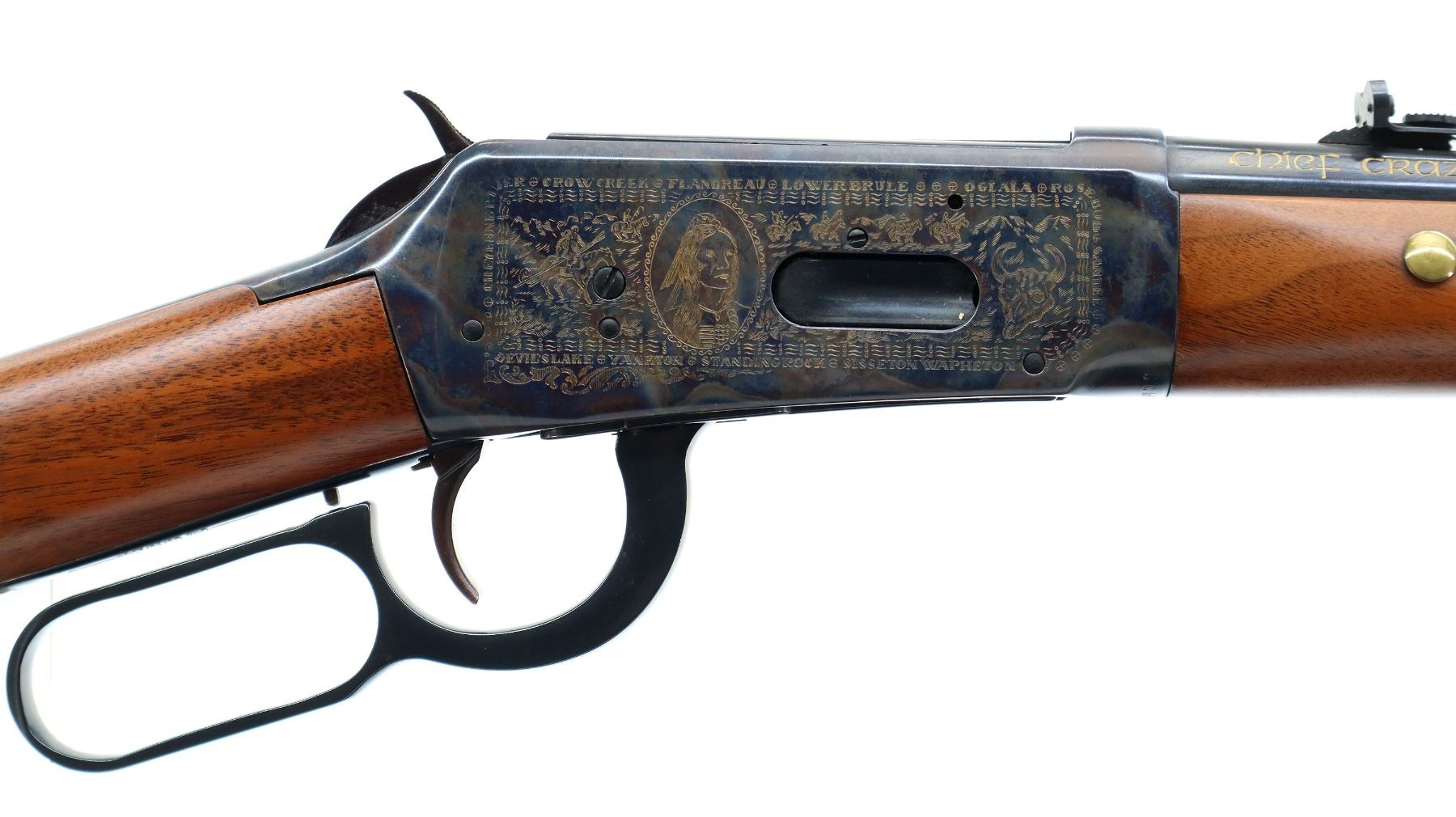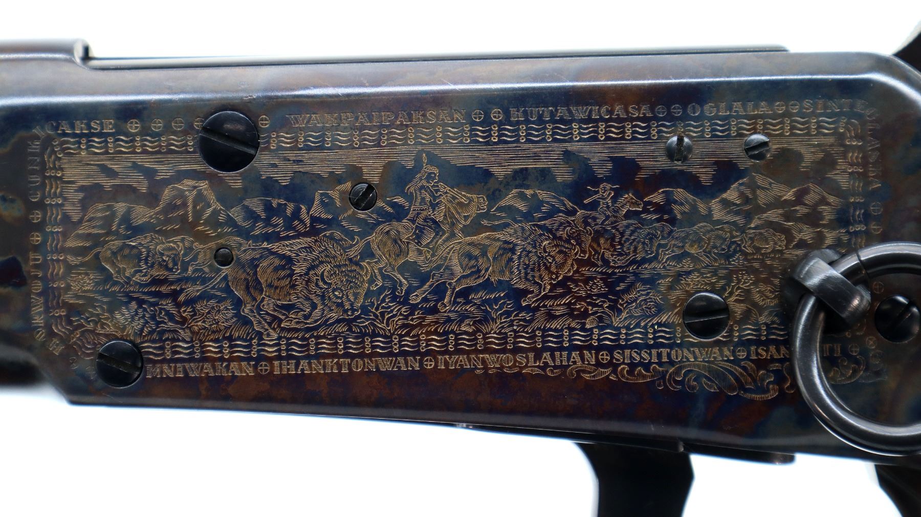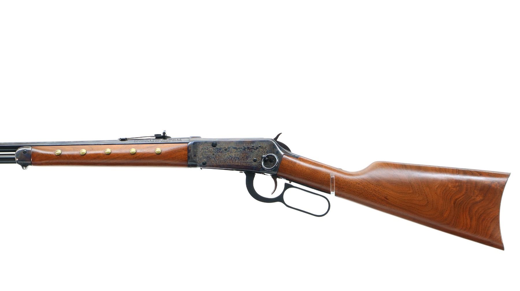 Main Description: Blade front sight with ramp, adjustable u notched rear sight, polish blued tapered round barrel, bolt, lever and full length magtube. Engraved colour case hardened receiver, grooved spur hammer, saddle ring and stud. Two piece wood stocks, 8 brass tacks in forearm, straight grip, smooth curved steel butt plate, medallion and brass tacks on right side of stock, colour case hardened nose cap.