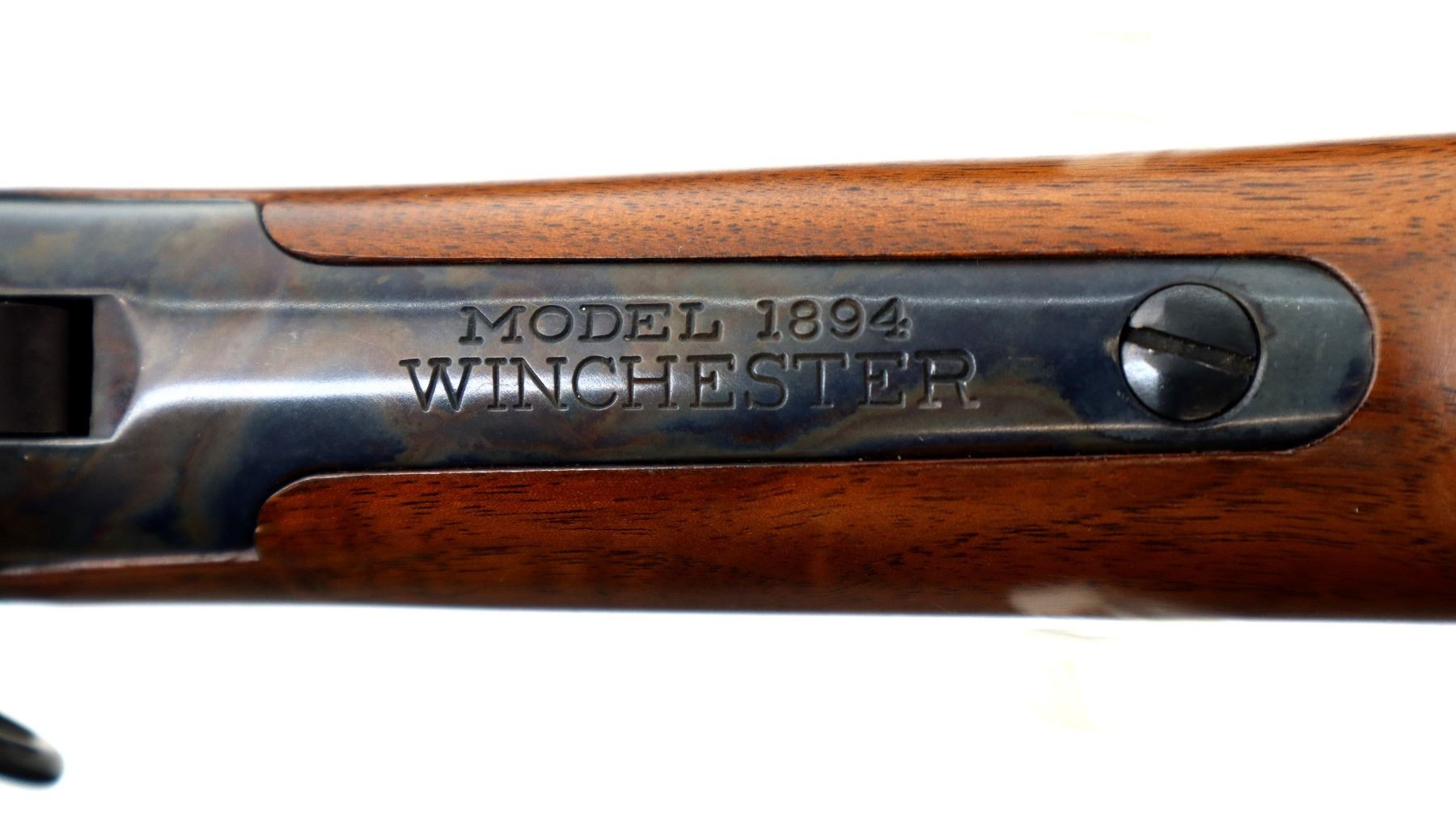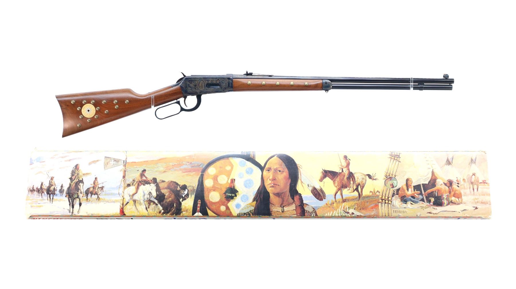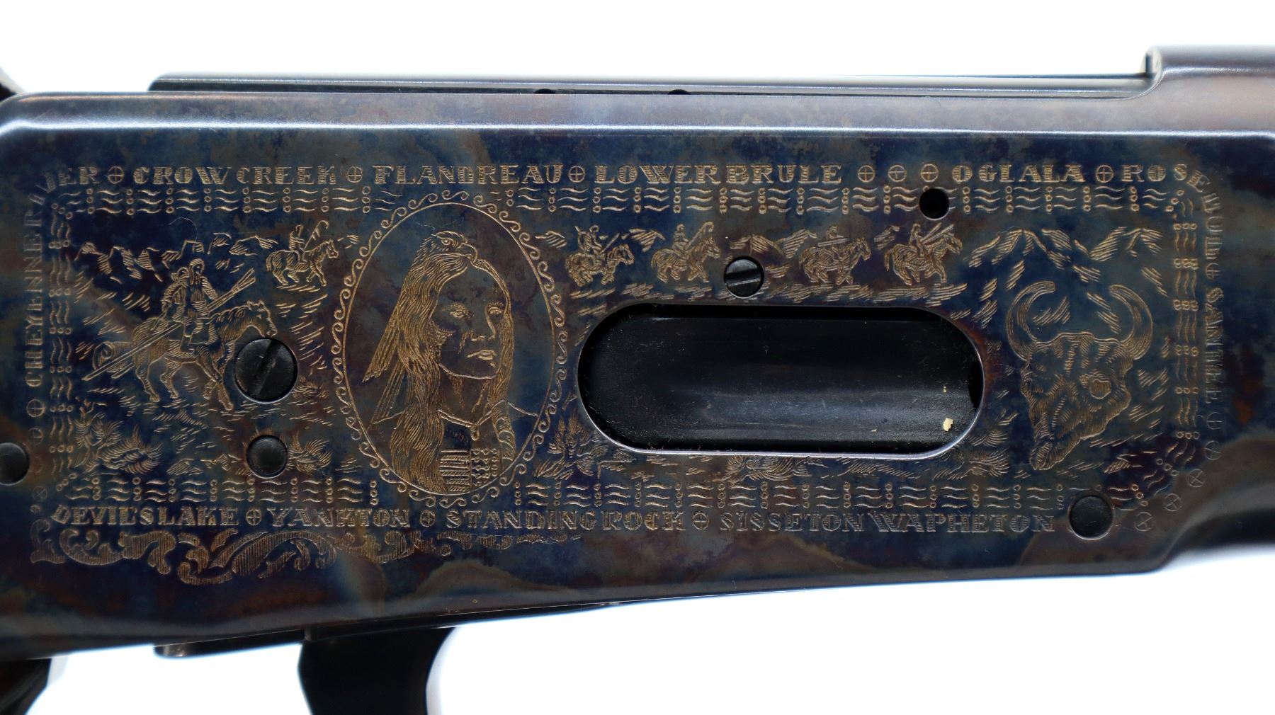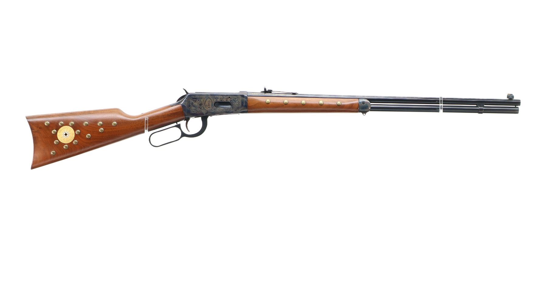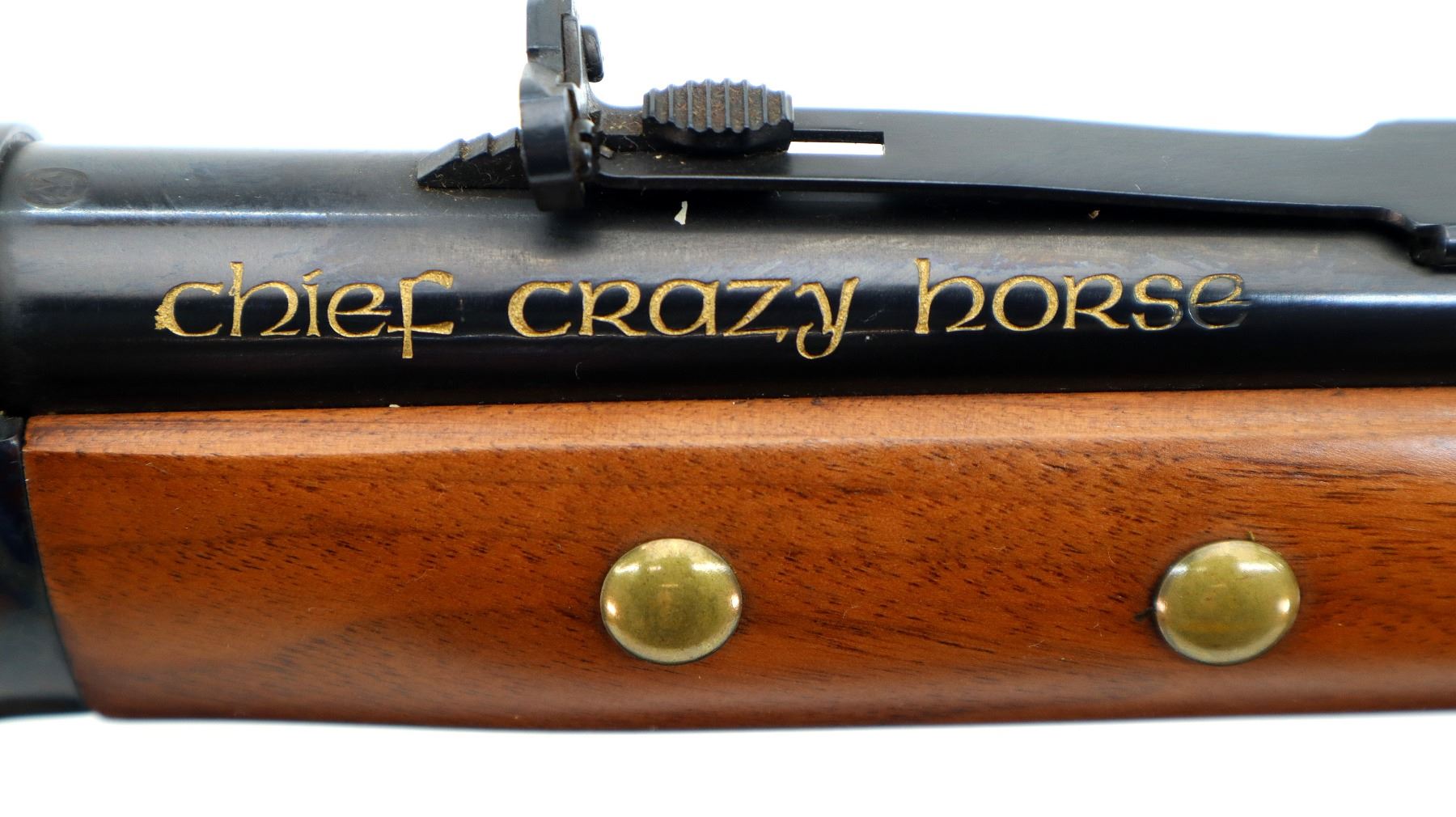 Main Description: Blade front sight with ramp, adjustable u notched rear sight, polish blued tapered round barrel, bolt, lever and full length magtube. Engraved colour case hardened receiver, grooved spur hammer, saddle ring and stud. Two piece wood stocks, 8 brass tacks in forearm, straight grip, smooth curved steel butt plate, medallion and brass tacks on right side of stock, colour case hardened nose cap.
