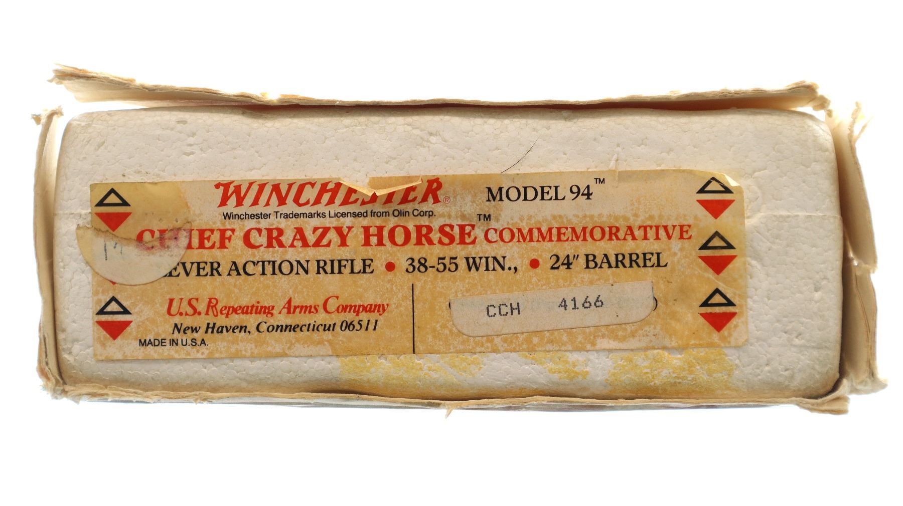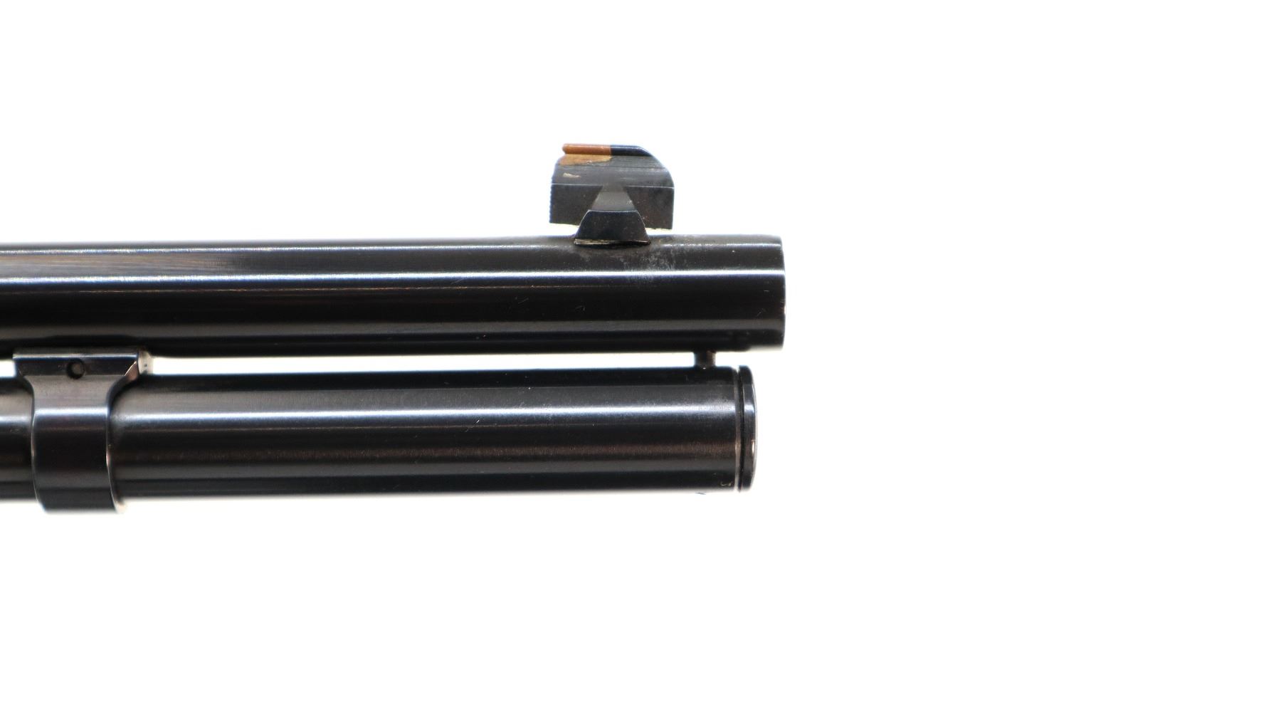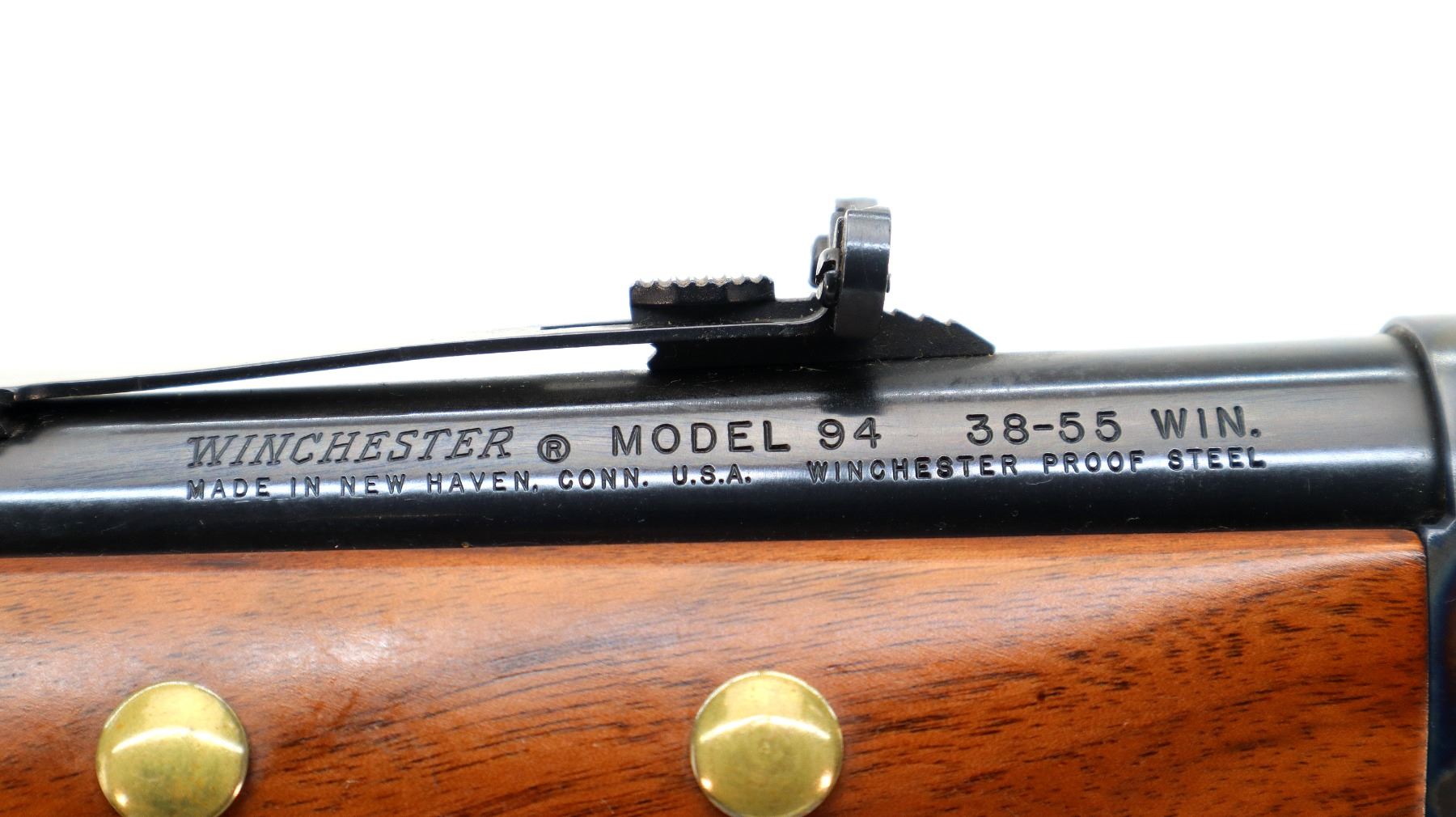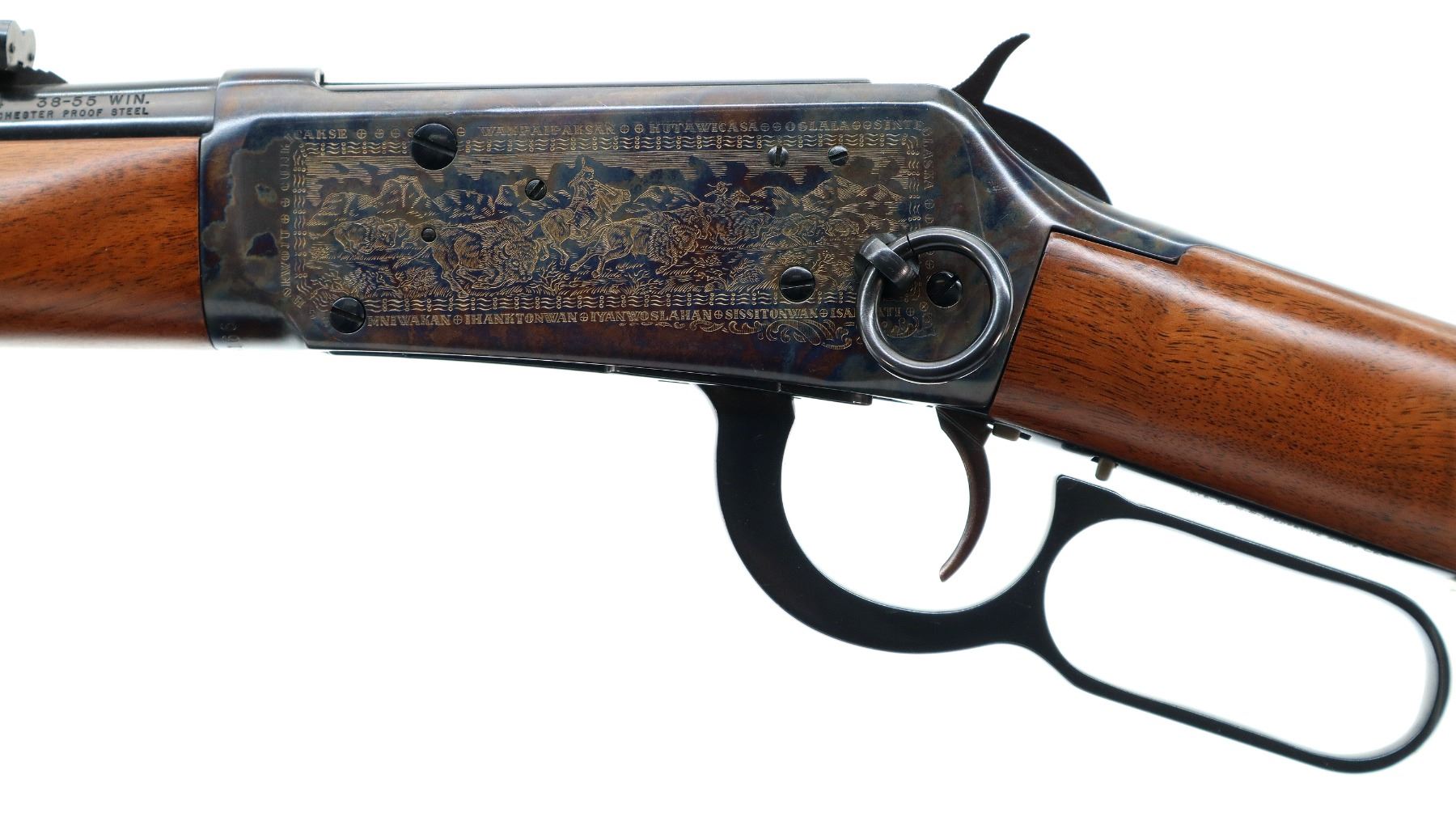 Main Description: Blade front sight with ramp, adjustable u notched rear sight, polish blued tapered round barrel, bolt, lever and full length magtube. Engraved colour case hardened receiver, grooved spur hammer, saddle ring and stud. Two piece wood stocks, 8 brass tacks in forearm, straight grip, smooth curved steel butt plate, medallion and brass tacks on right side of stock, colour case hardened nose cap.