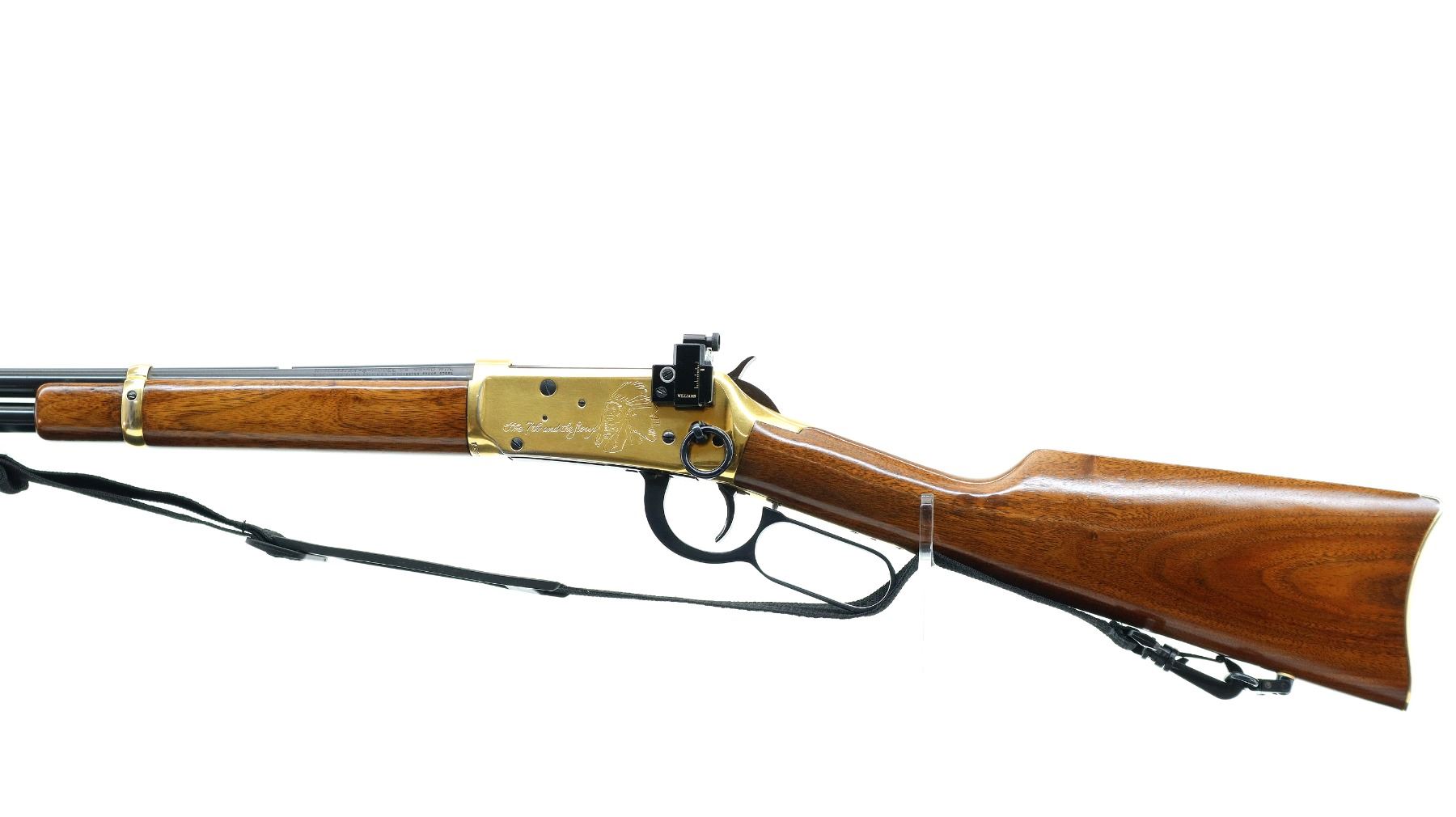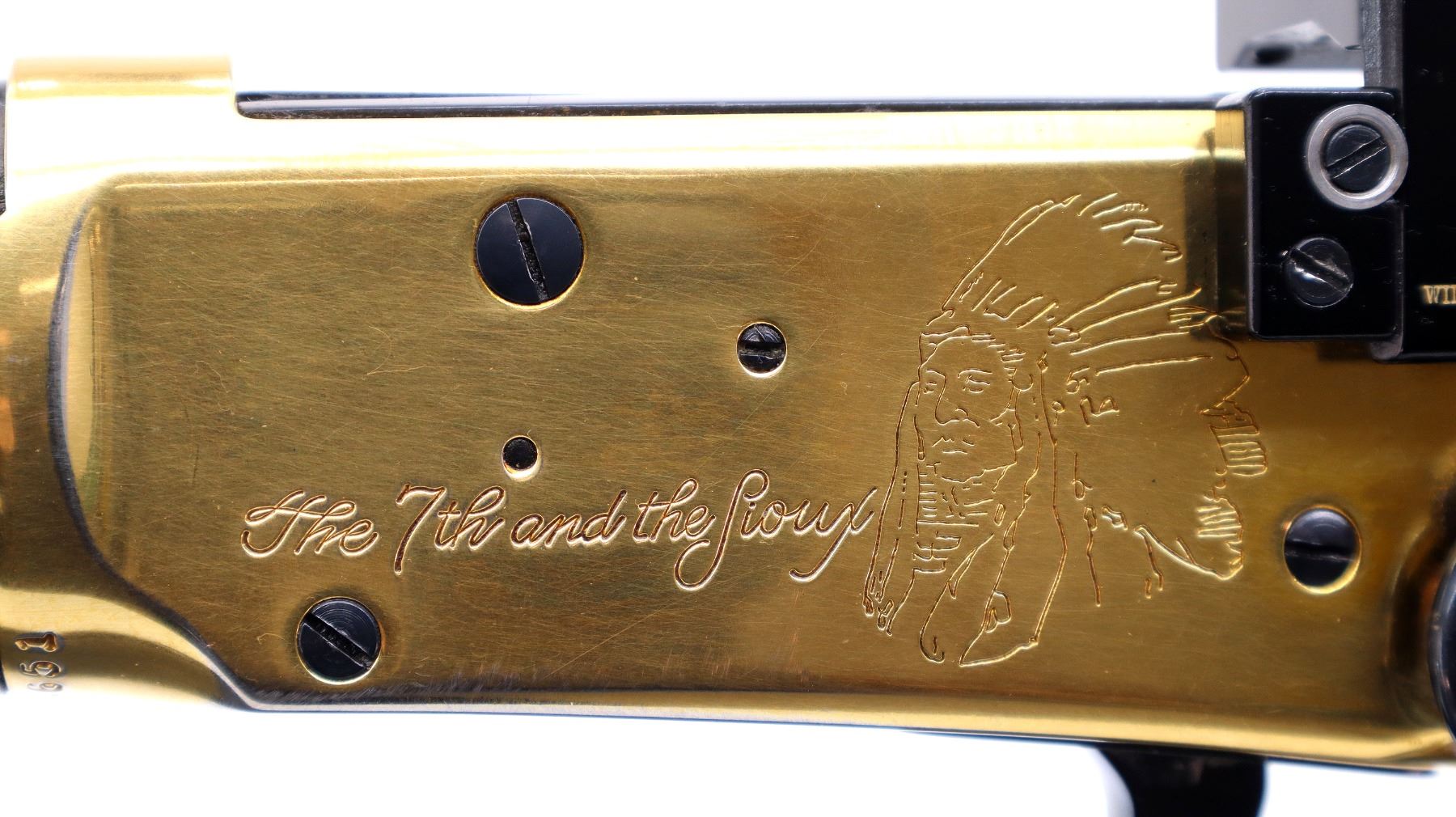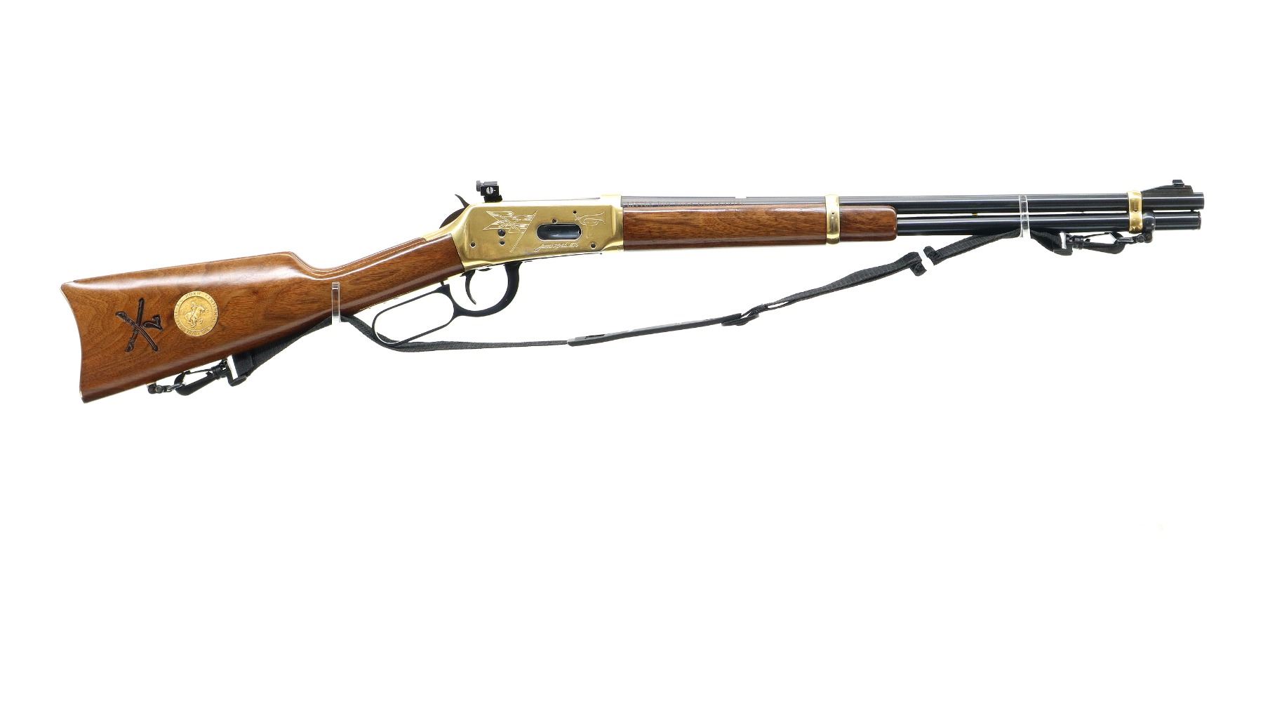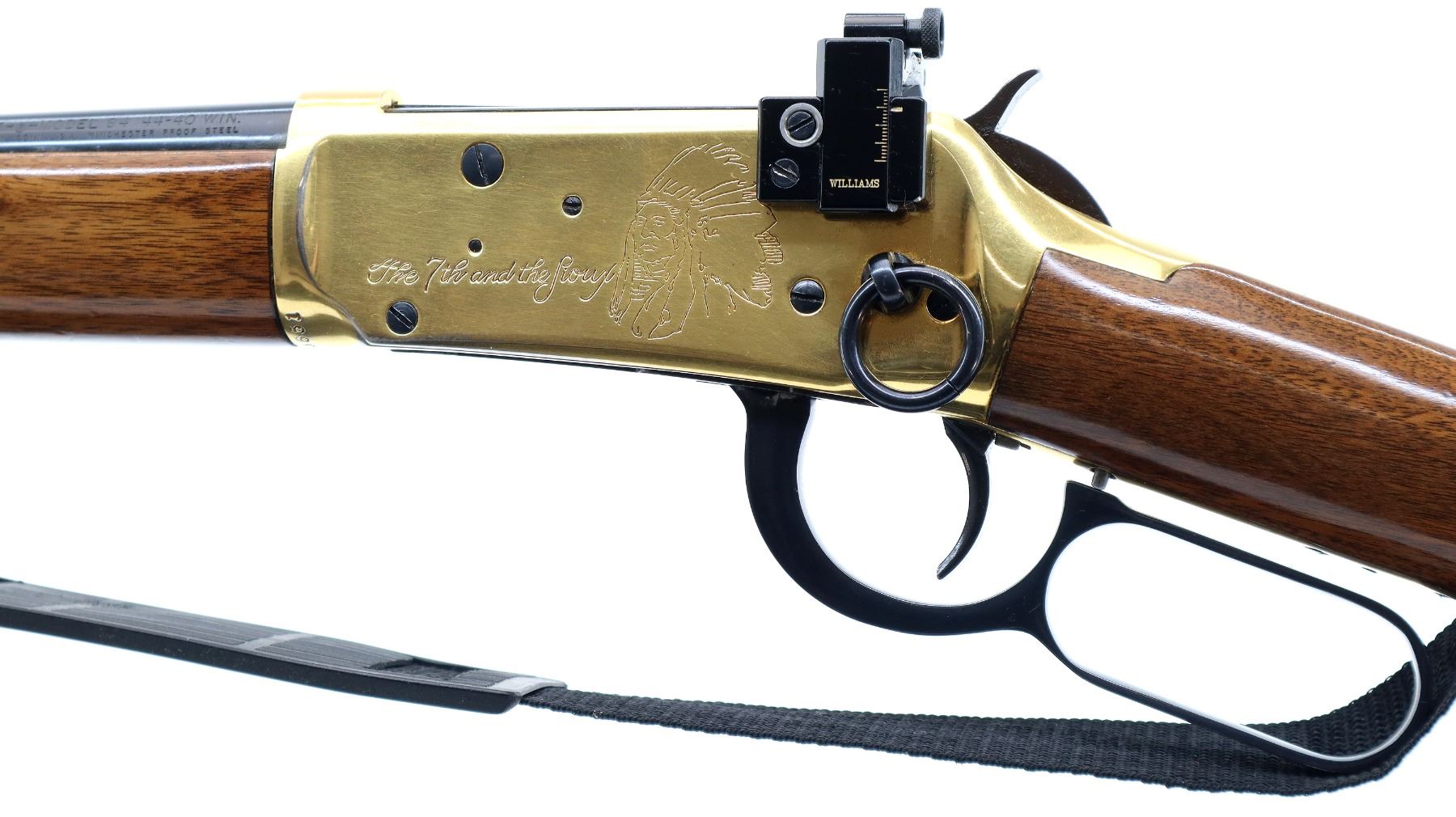 Main Description: Blade front sight with ramp, missing rear sight dovetail present, receiver has an adjustable Williams peep sight installed, polish blued barrel, bolt, lever and full length magtube, engraved gold receiver, grooved spur hammer, saddle ring and stud. Two piece wood stocks, straight grip, smooth curved gold butt plate and two barrel bands, medallion in right side of stock with 7th Cavalry logo, sling swivels with black nylon sling.