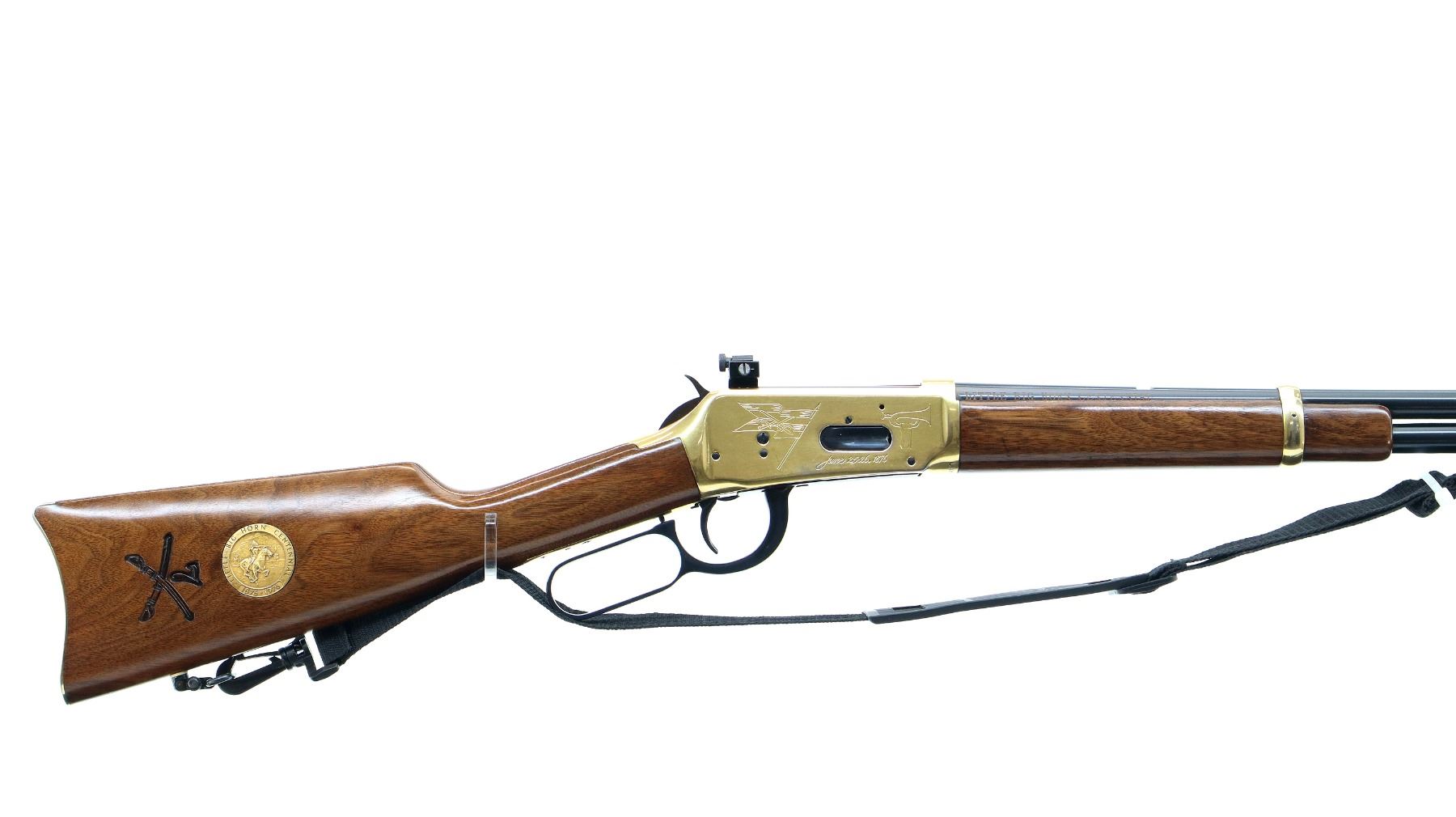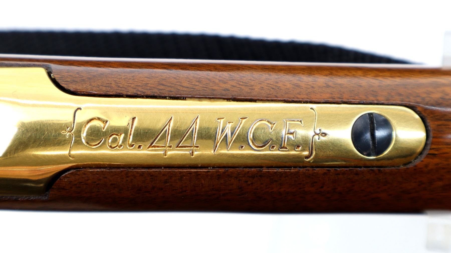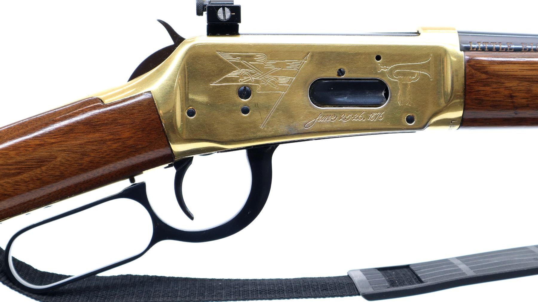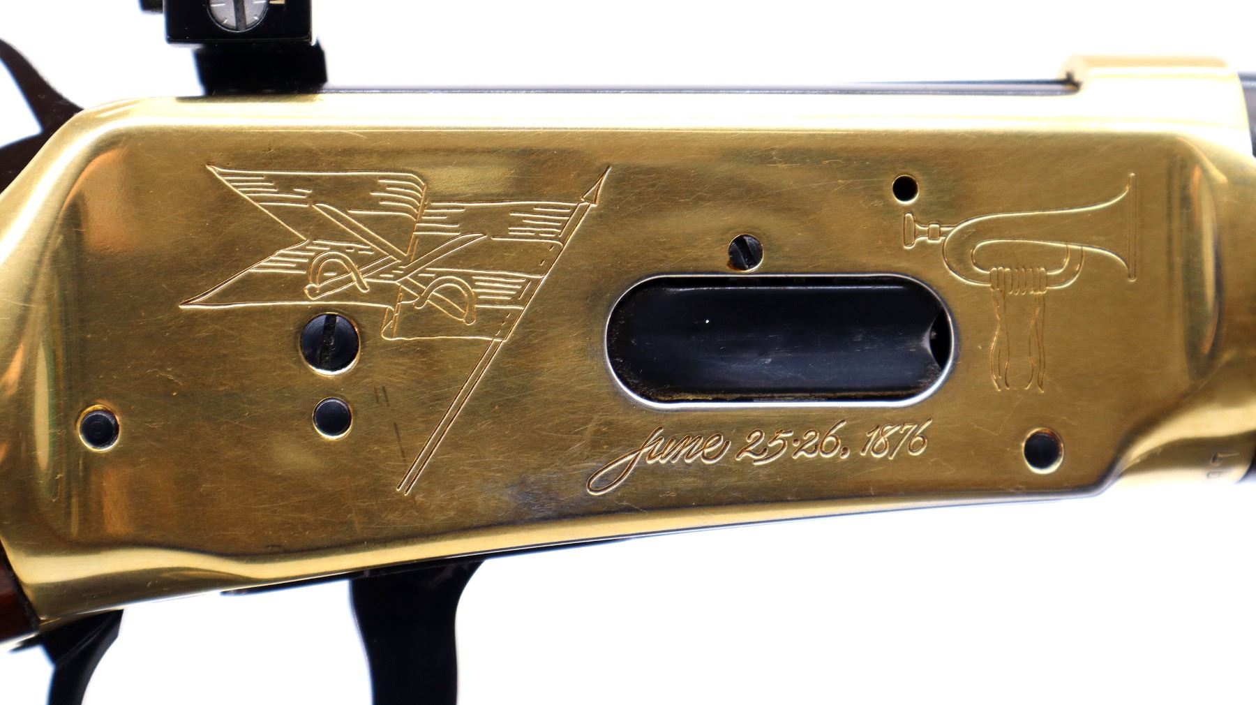 Main Description: Blade front sight with ramp, missing rear sight dovetail present, receiver has an adjustable Williams peep sight installed, polish blued barrel, bolt, lever and full length magtube, engraved gold receiver, grooved spur hammer, saddle ring and stud. Two piece wood stocks, straight grip, smooth curved gold butt plate and two barrel bands, medallion in right side of stock with 7th Cavalry logo, sling swivels with black nylon sling.