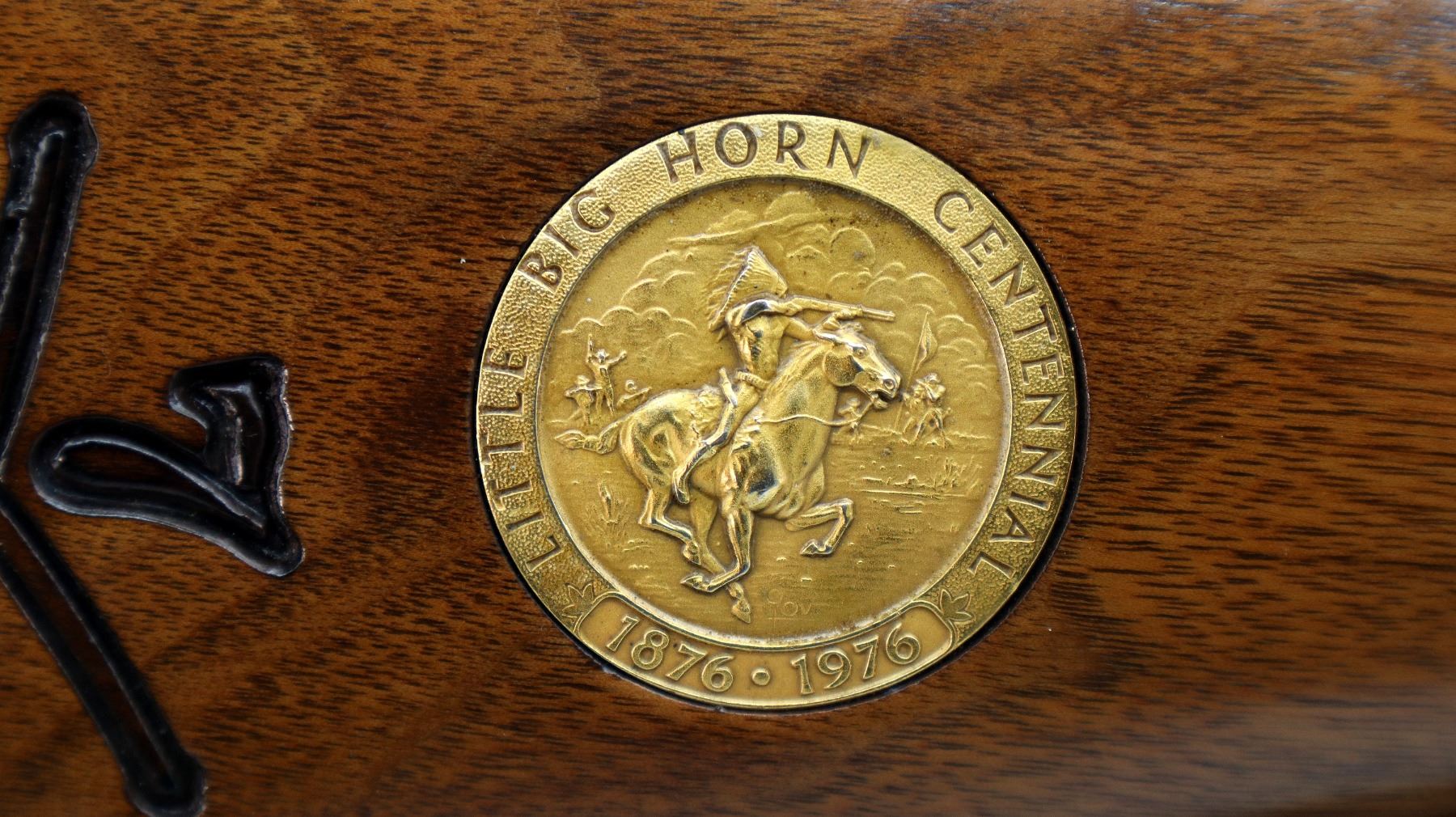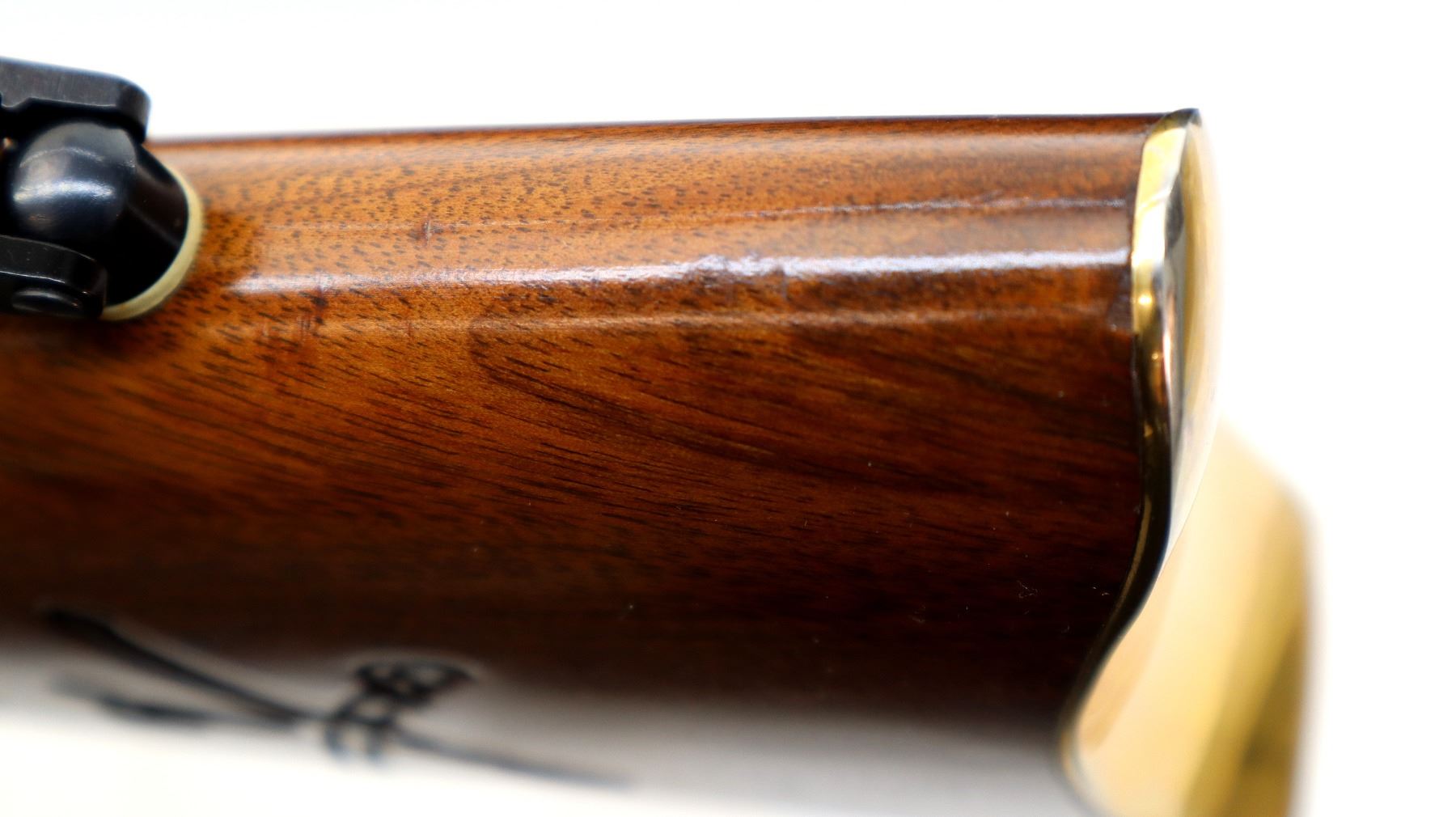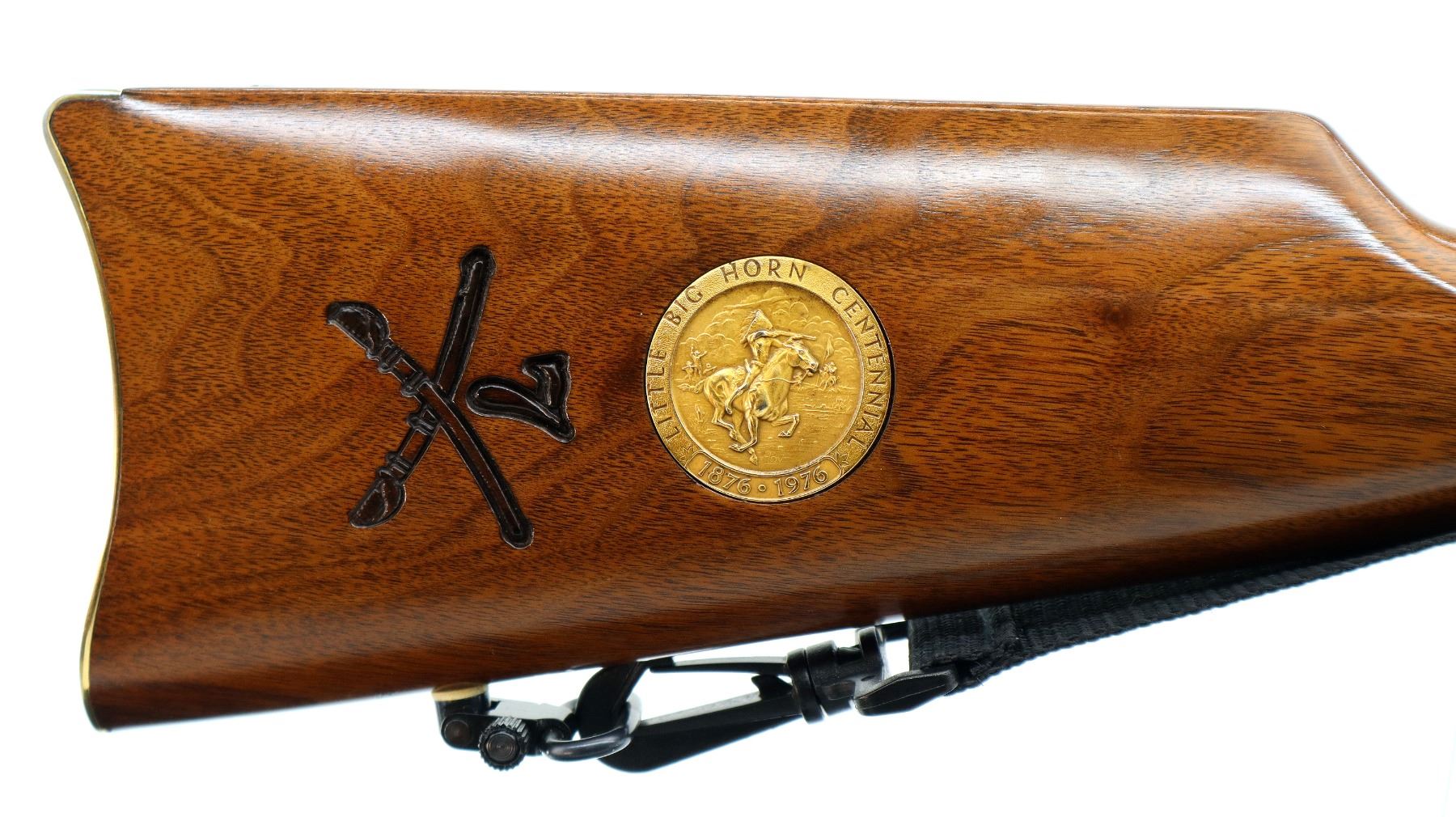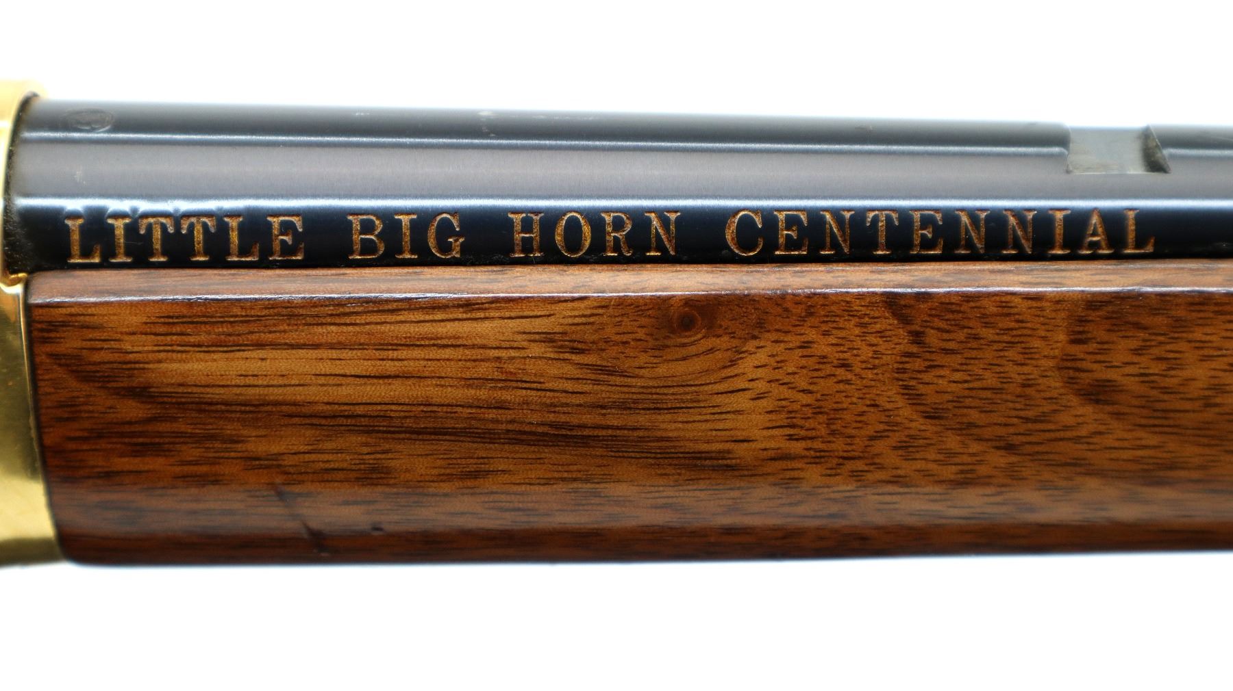 Main Description: Blade front sight with ramp, missing rear sight dovetail present, receiver has an adjustable Williams peep sight installed, polish blued barrel, bolt, lever and full length magtube, engraved gold receiver, grooved spur hammer, saddle ring and stud. Two piece wood stocks, straight grip, smooth curved gold butt plate and two barrel bands, medallion in right side of stock with 7th Cavalry logo, sling swivels with black nylon sling.