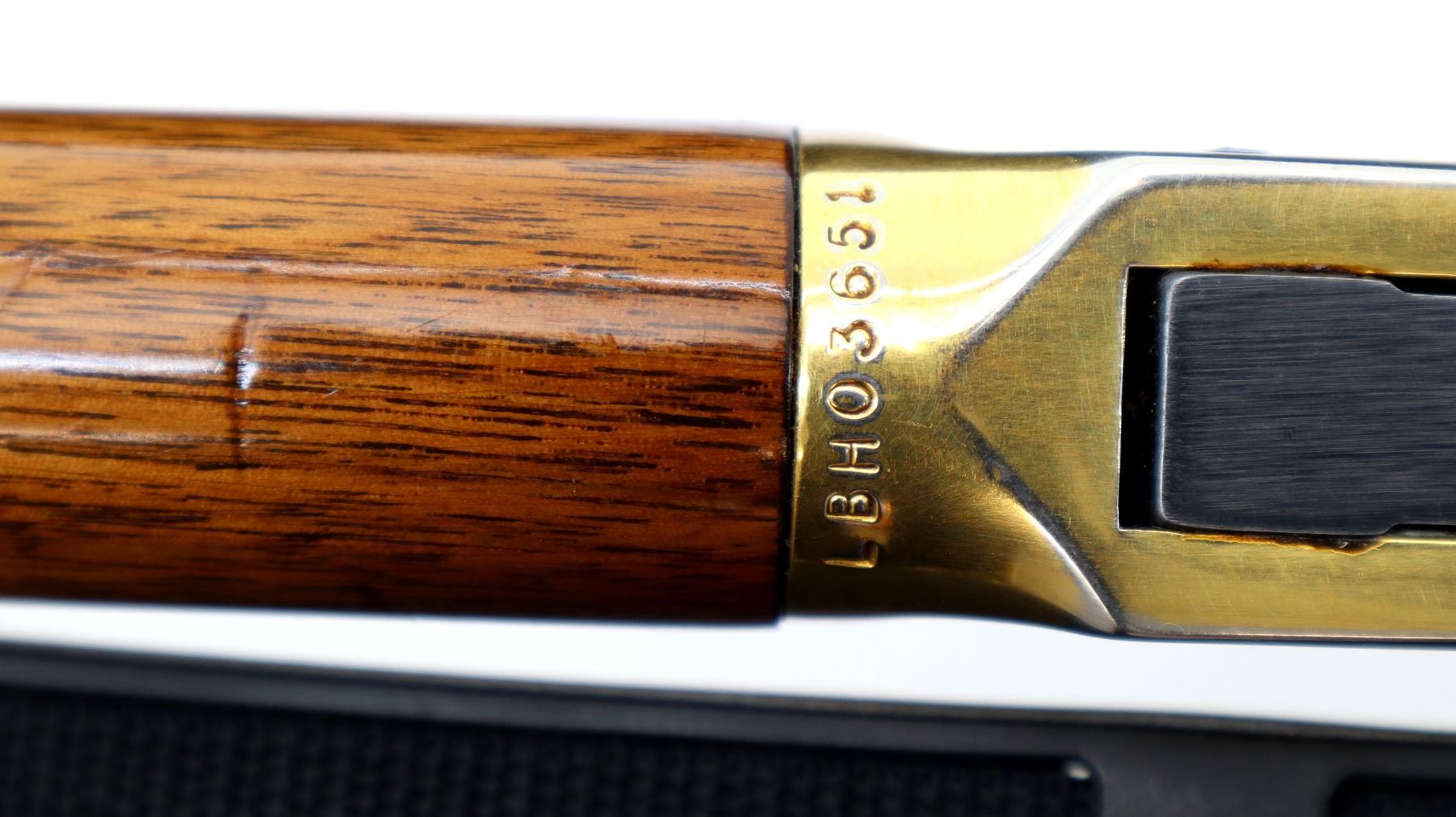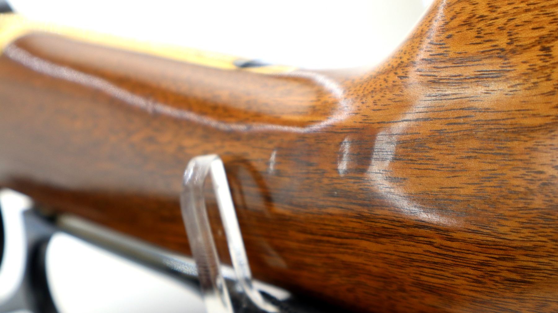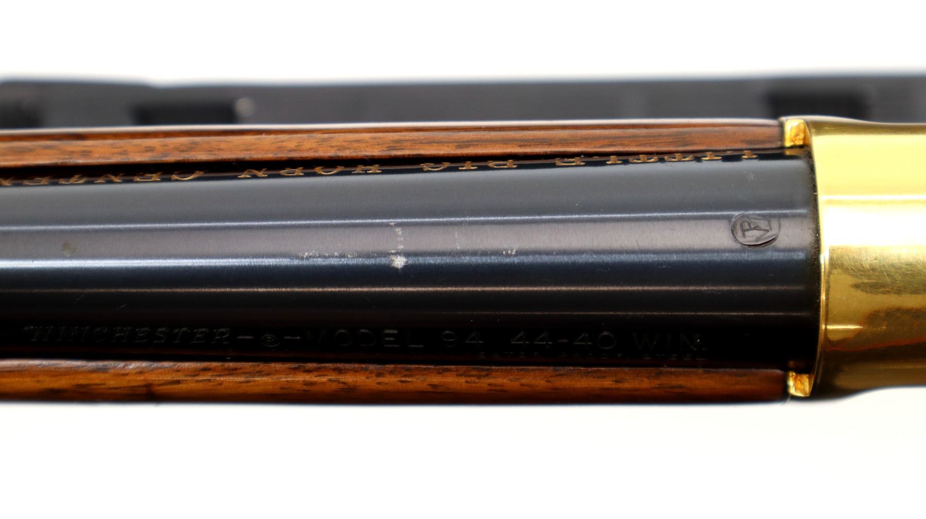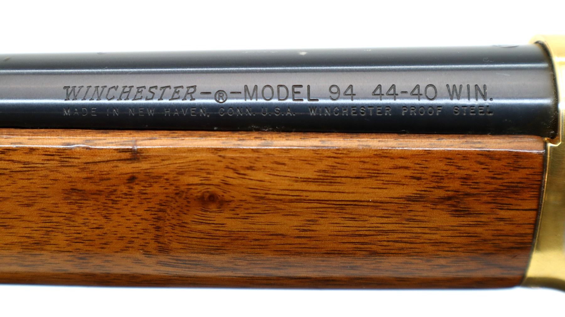 Main Description: Blade front sight with ramp, missing rear sight dovetail present, receiver has an adjustable Williams peep sight installed, polish blued barrel, bolt, lever and full length magtube, engraved gold receiver, grooved spur hammer, saddle ring and stud. Two piece wood stocks, straight grip, smooth curved gold butt plate and two barrel bands, medallion in right side of stock with 7th Cavalry logo, sling swivels with black nylon sling.