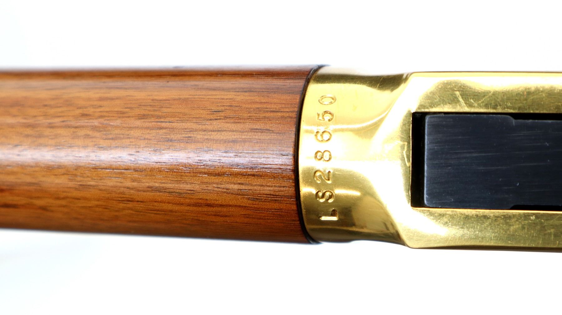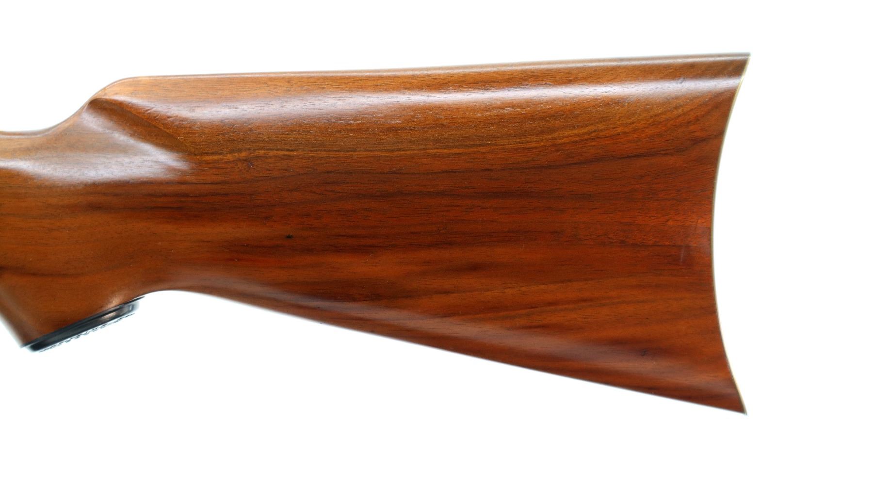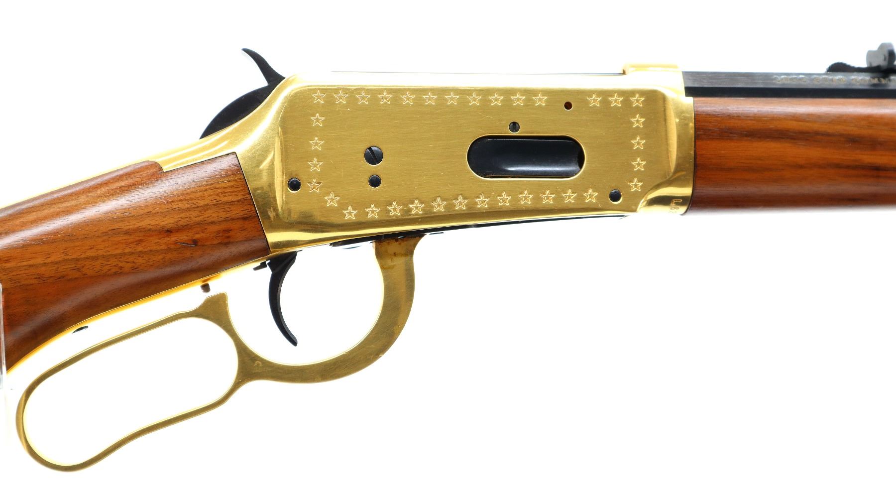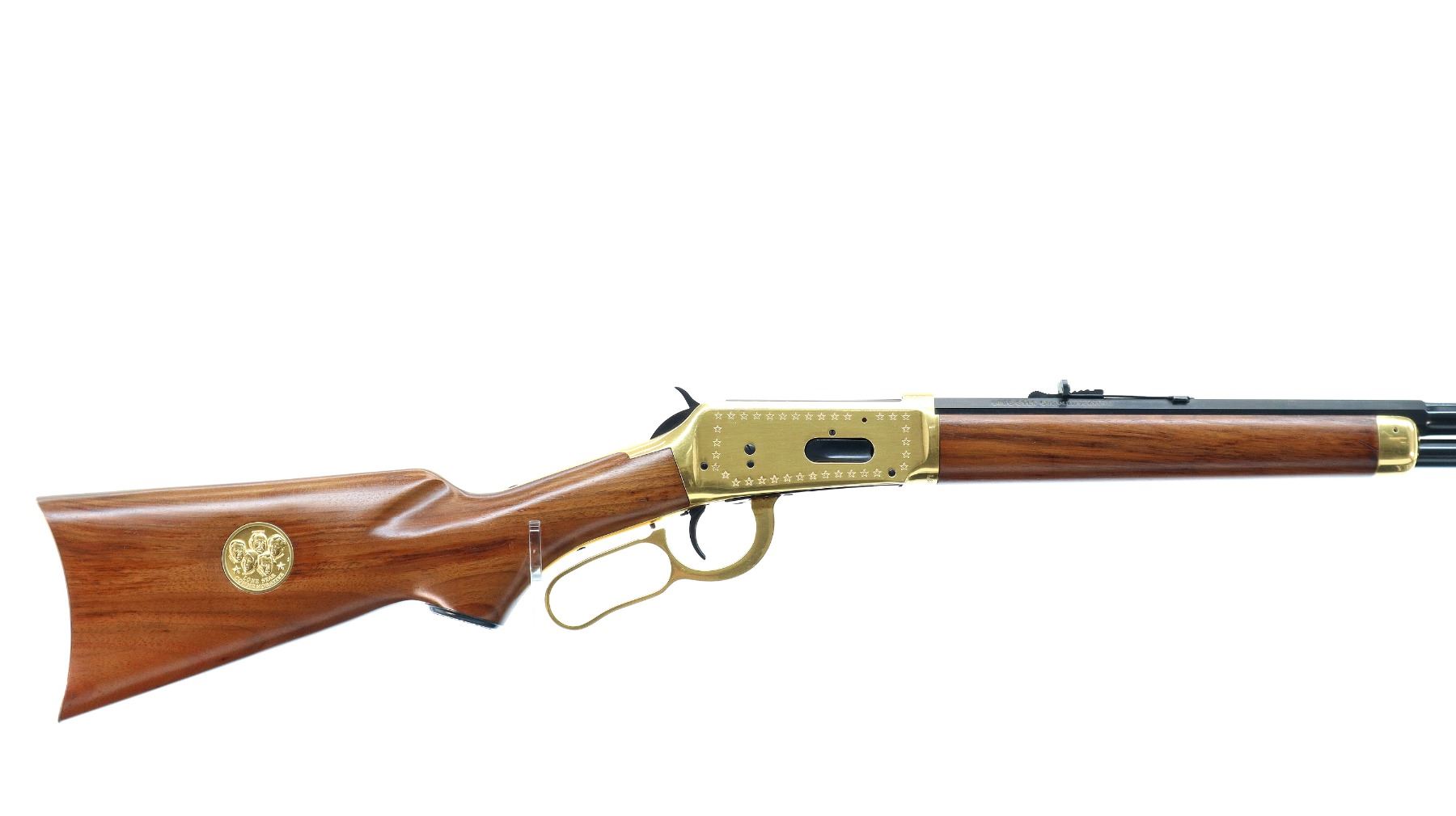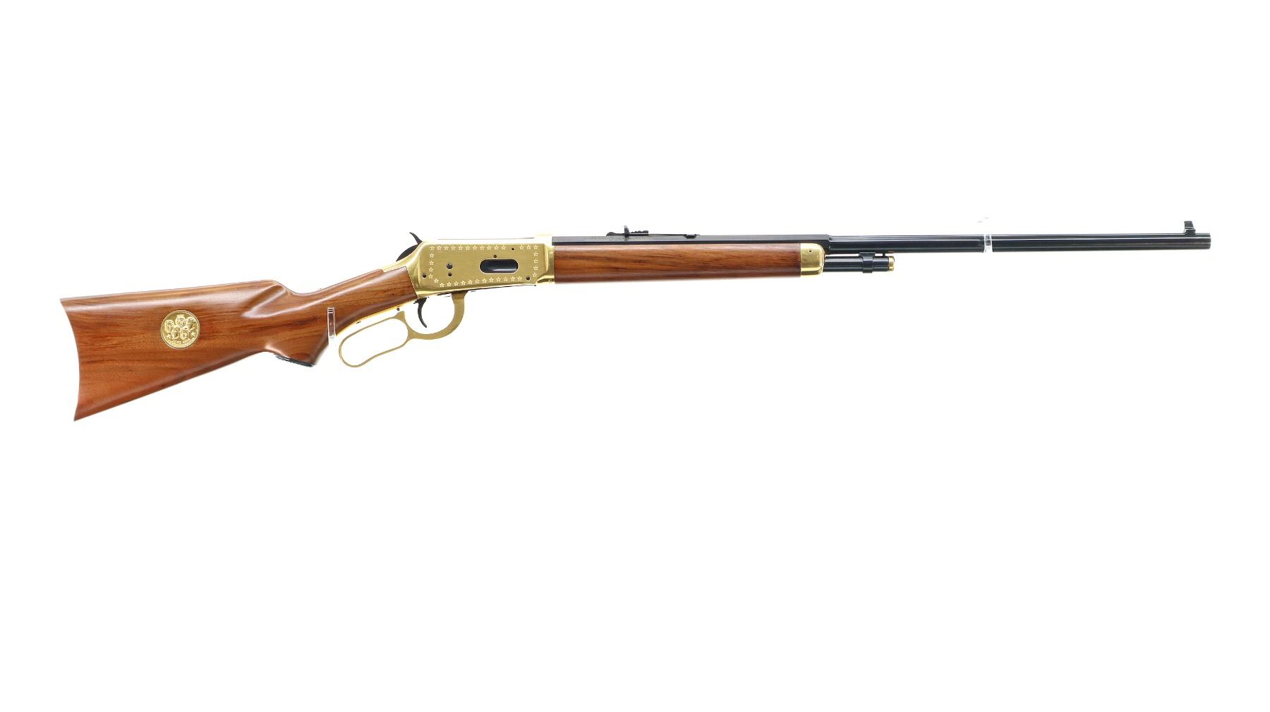 Main Description: Blade front sight, adjustable u notched rear sight, polish blued half octagon and half round barrel, bolt and button magtube, engraved gold receiver, grooved spur hammer, saddle ring and stud. Two piece wood stocks, pistol grip, smooth gold curved butt plate, lever and nose cap. Medallion in right side of stock, grip cap, retains factory hang tag.