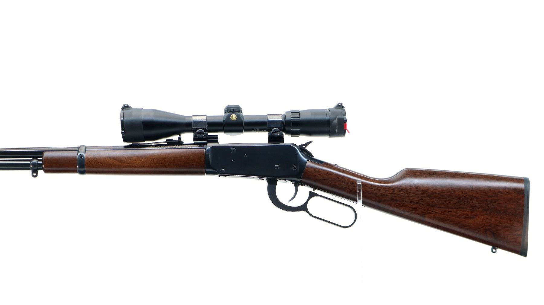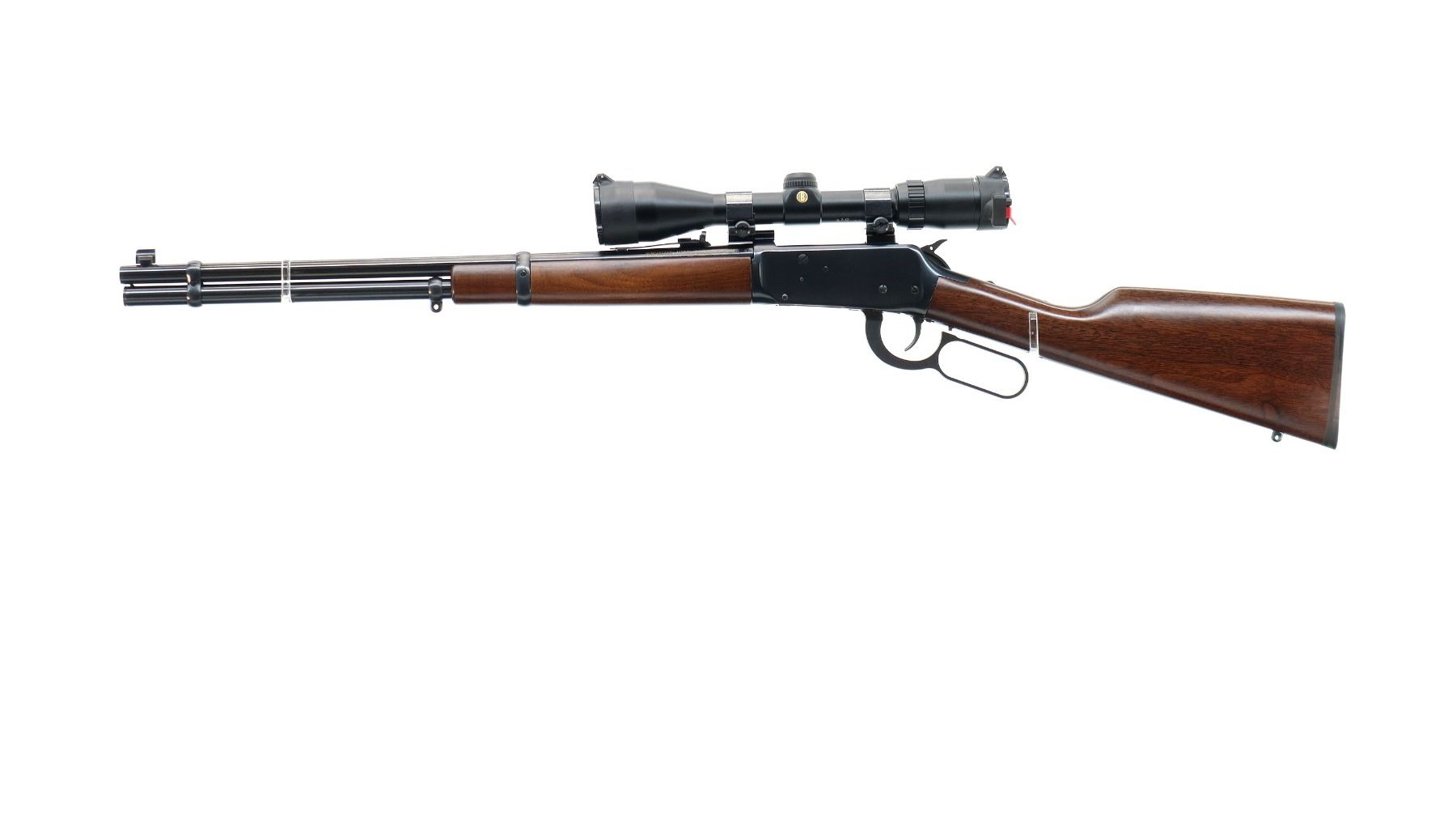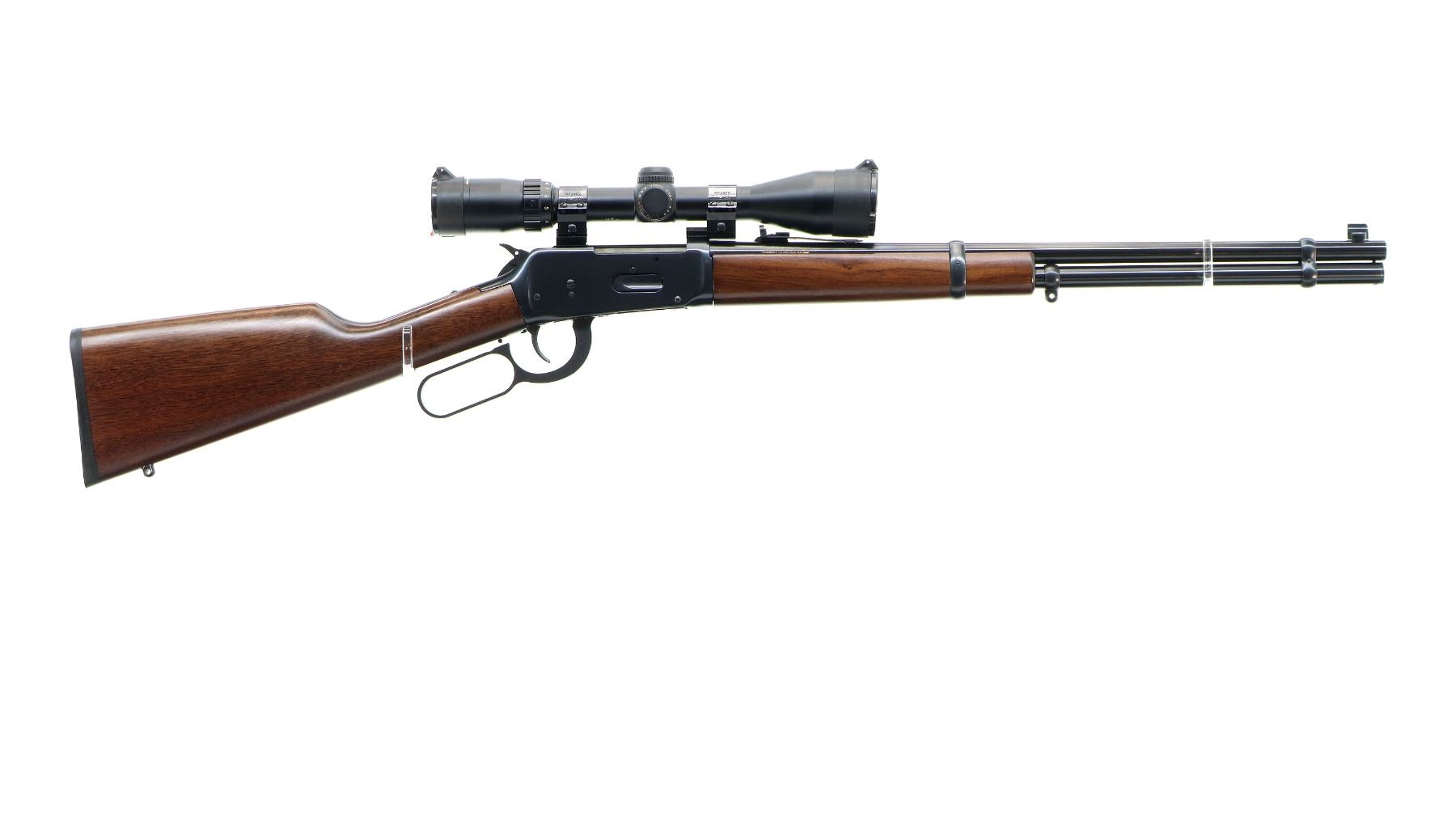 Main Description: Blade front sight, adjustable u notched rear sight, polish blued finish, receiver drilled and tapped with Bushnell Elite 3200 3-10x40 scope installed, clear optics with duplex crosshair. Angled eject bolt, grooved spur hammer, tang safety. Two piece wood stocks, straight grip, black rubber recoil pad, full length magtube, swivel studs.
