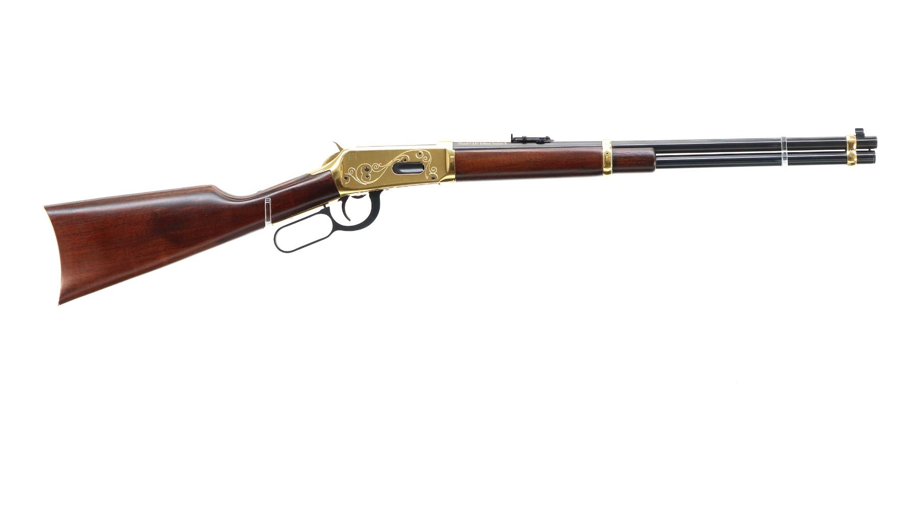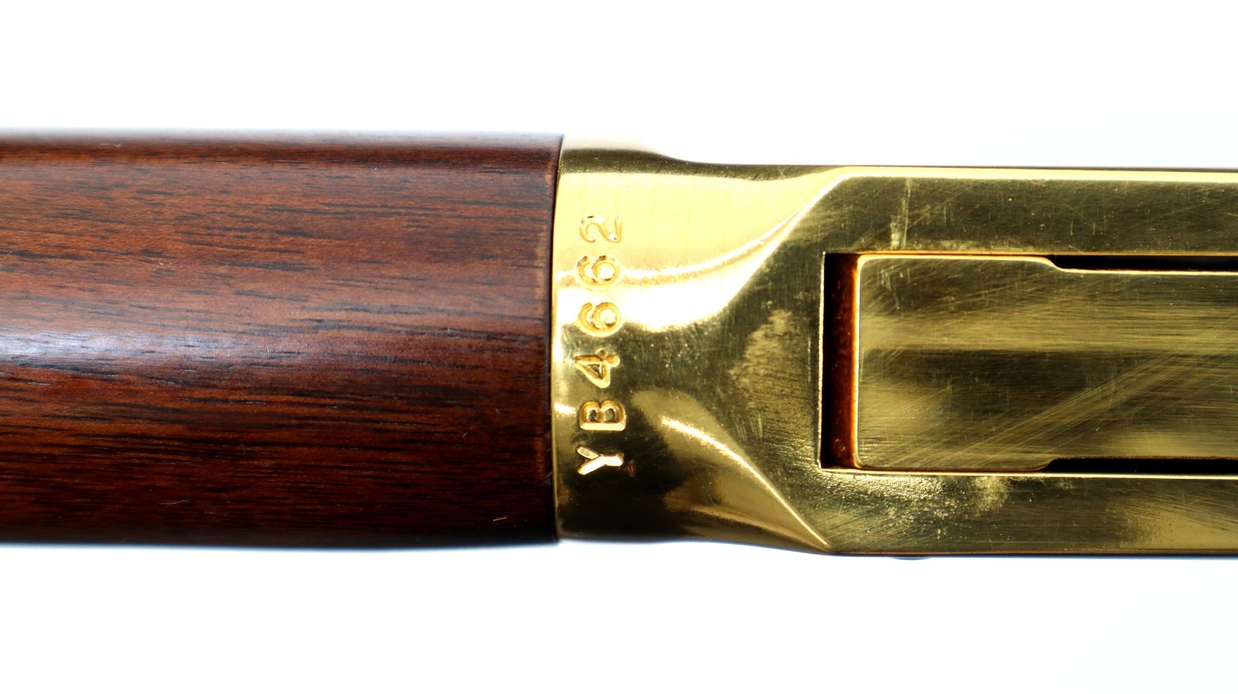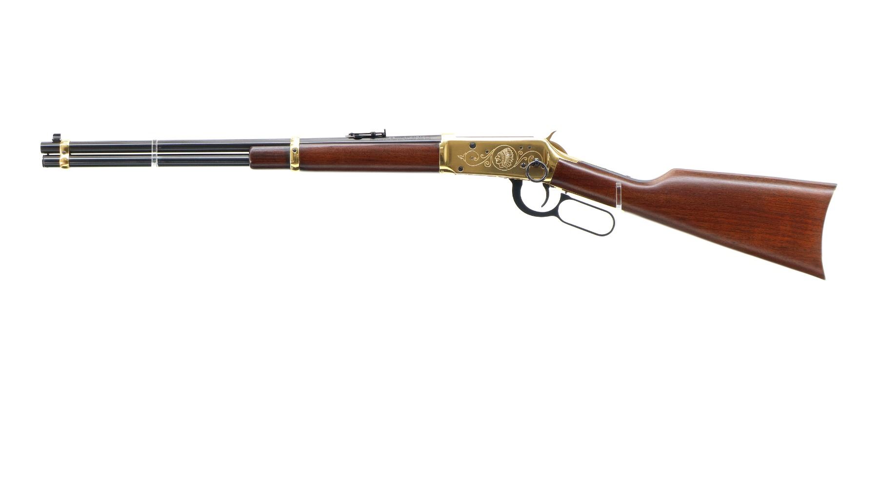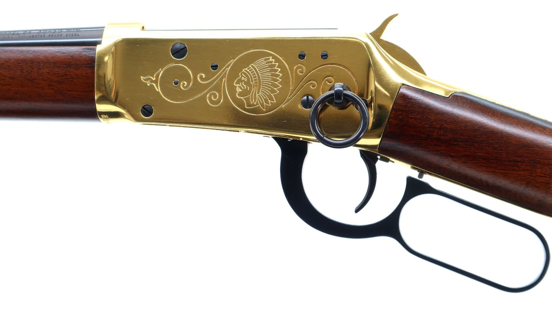 Main Description: Blade front sight, adjustable u notched ladder rear sight, polish blued barrel, bolt, lever and full length magtube, engraved gold receiver, grooved spur hammer, saddle ring and stud. Two piece wood stocks, straight grip, smooth curved gold butt plate and barrel bands.