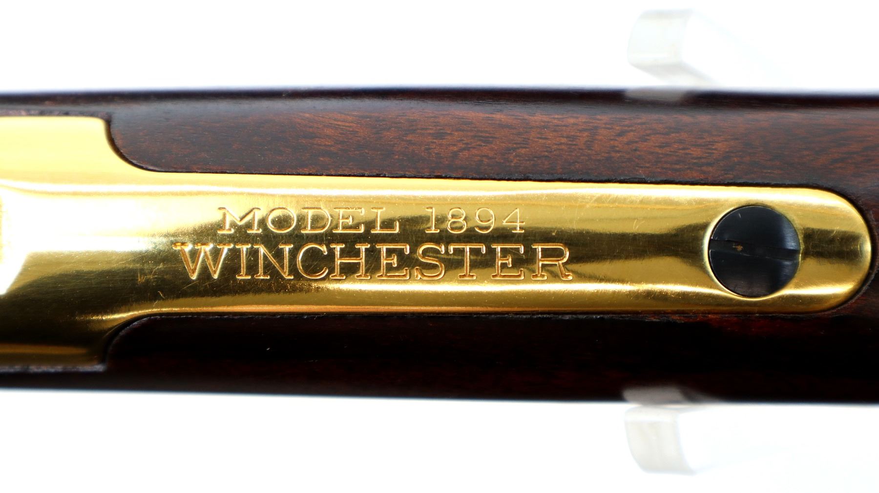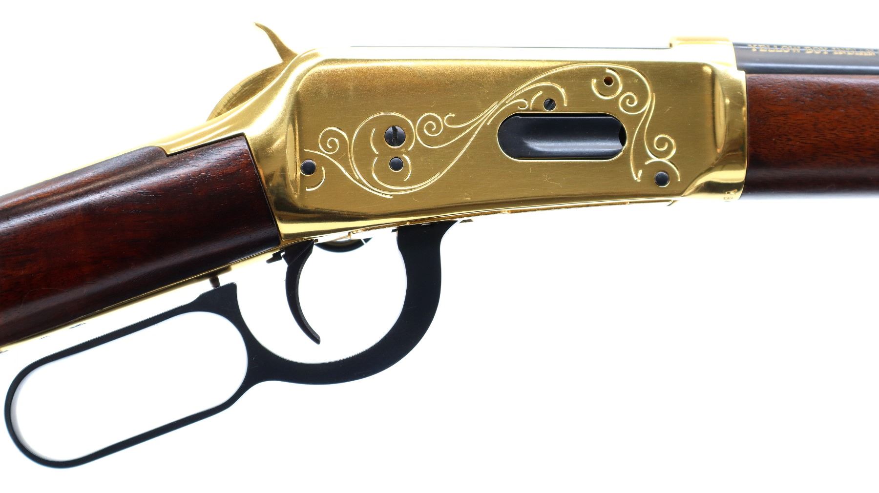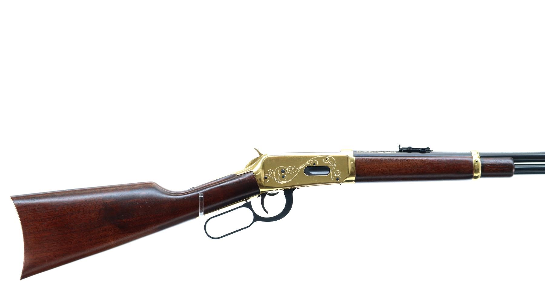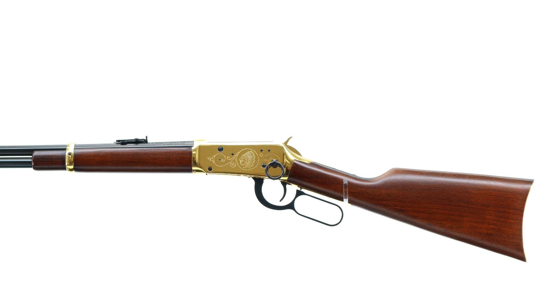 Main Description: Blade front sight, adjustable u notched ladder rear sight, polish blued barrel, bolt, lever and full length magtube, engraved gold receiver, grooved spur hammer, saddle ring and stud. Two piece wood stocks, straight grip, smooth curved gold butt plate and barrel bands.