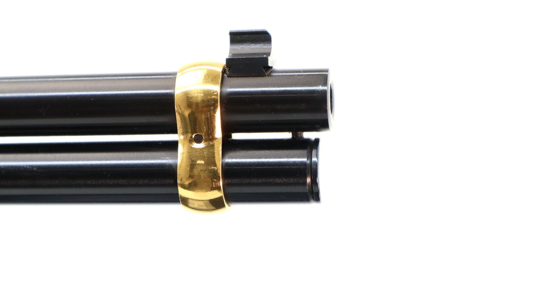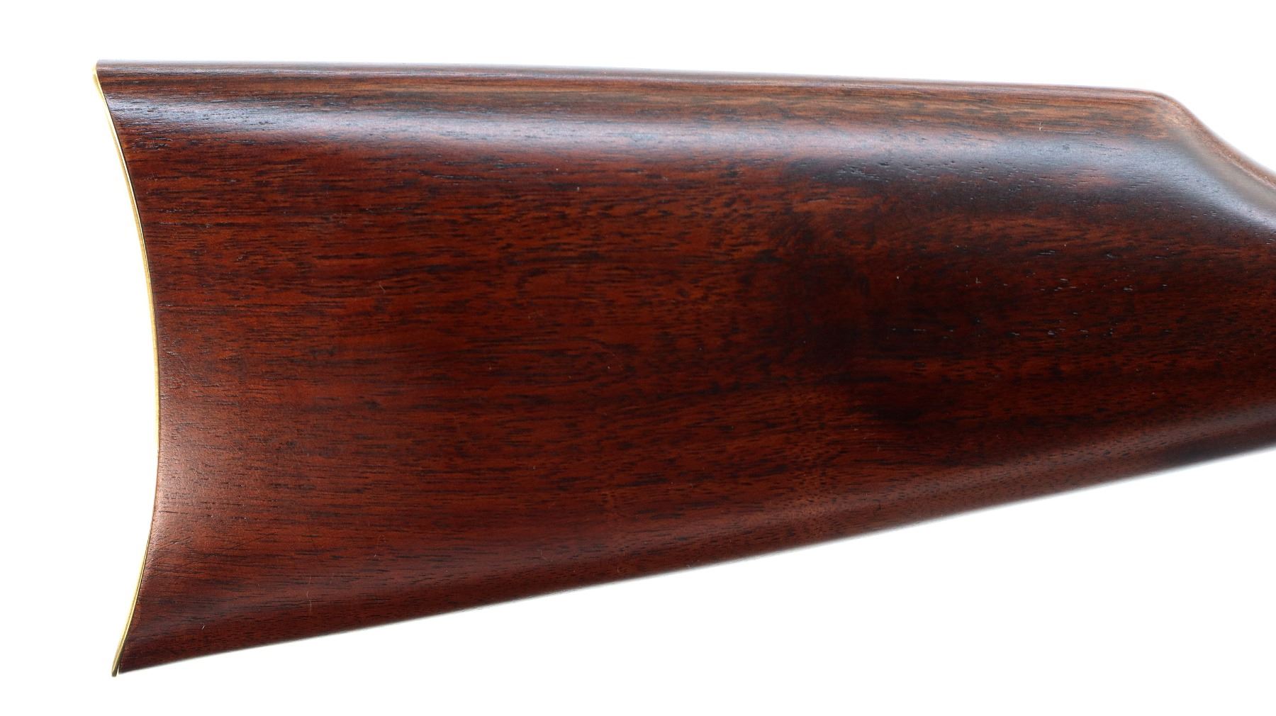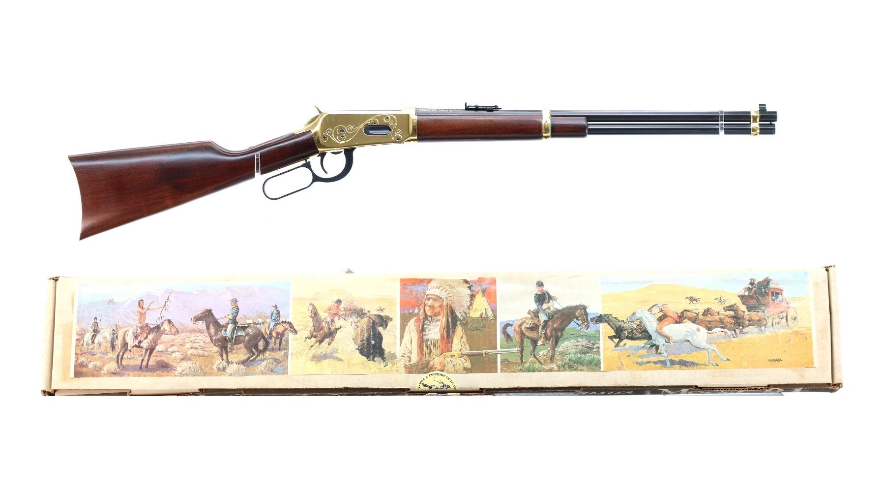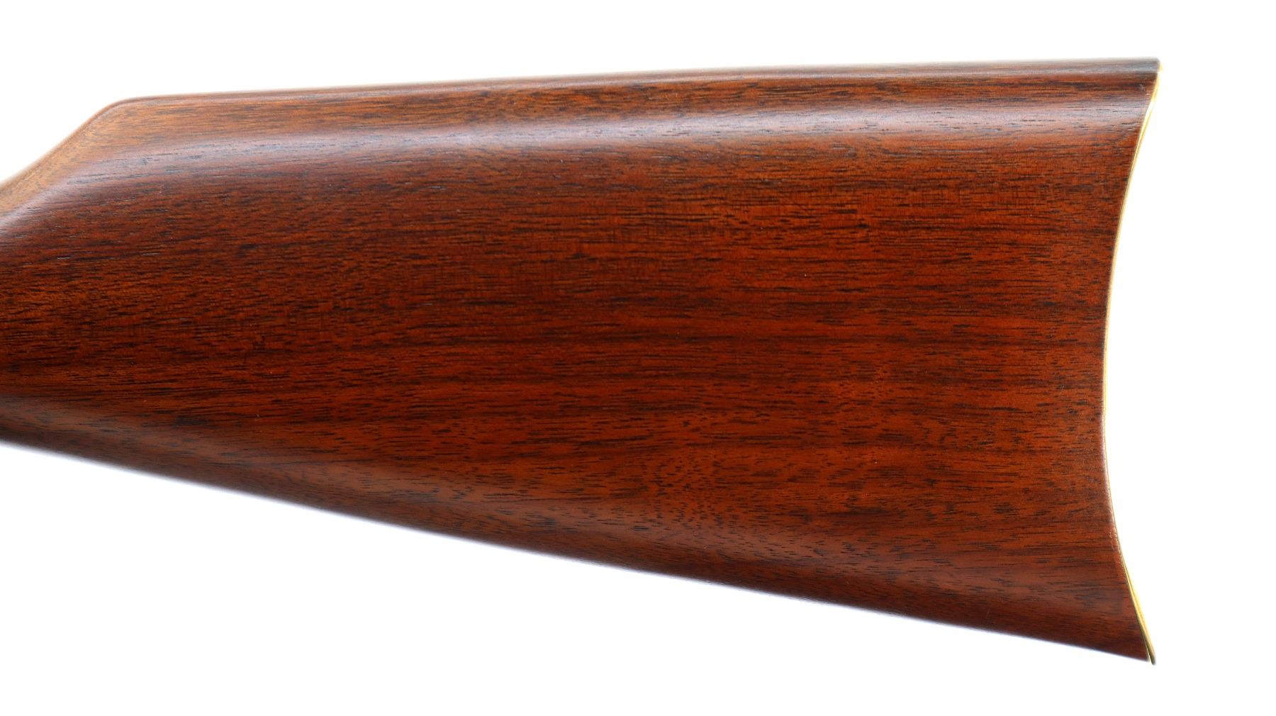 Main Description: Blade front sight, adjustable u notched ladder rear sight, polish blued barrel, bolt, lever and full length magtube, engraved gold receiver, grooved spur hammer, saddle ring and stud. Two piece wood stocks, straight grip, smooth curved gold butt plate and barrel bands.